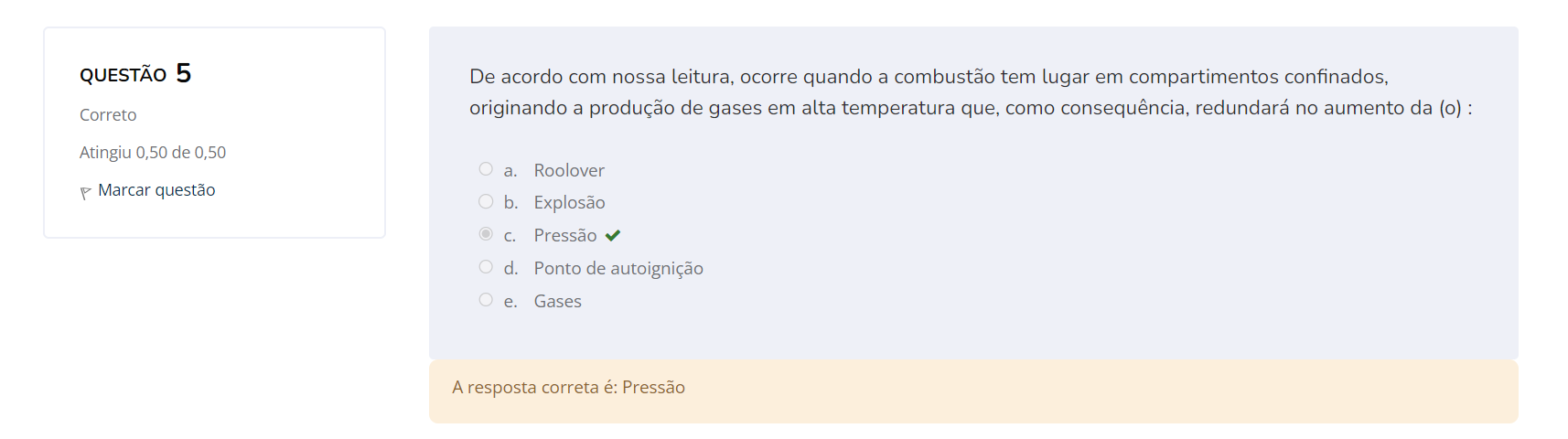 <p>5 De acordo com nossa leitura, ocorre quando a combustão tem lugar em compartimentos confinados, originando a produção de gases em alta temperatura que, como consequência, redundará no aumento da (o) : ,50 de 0,50 a. Roolover r questão b. Explosão C. Pressão d. Ponto de autoignição e. Gases A resposta correta é: Pressão</p>