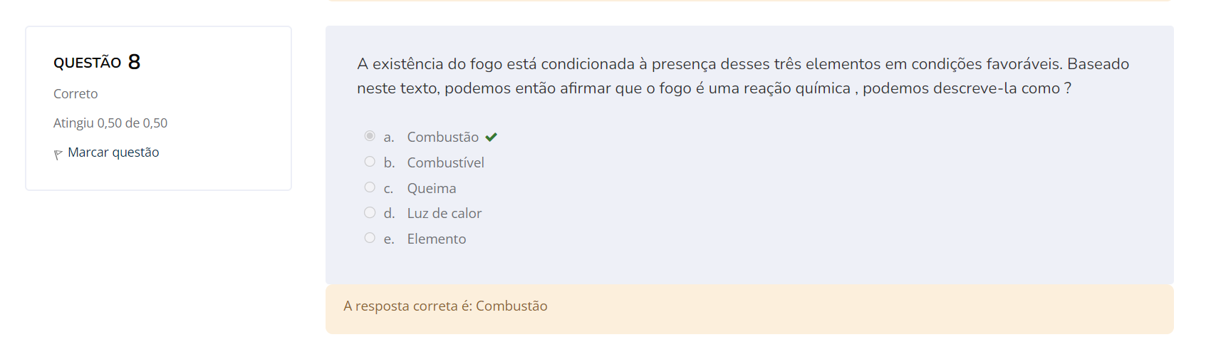 <p>QUESTÃO 8 A existência do fogo está condicionada à presença desses três elementos em condições favoráveis. Baseado Correto neste texto, podemos então afirmar que o fogo é uma reação química , podemos descreve-la como ? Atingiu 0,50 de 0,50 a. Combustão Marcar questão b. Combustível C. Queima d. Luz de calor e. Elemento A resposta correta é: Combustão</p>