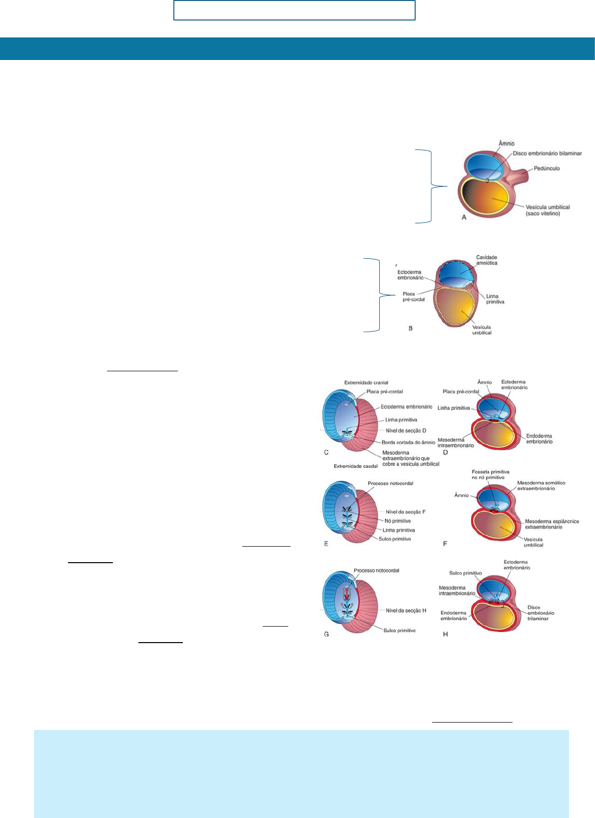 <p>TUTORIA P3M1E3 (Roberta Oliveira – T21)</p><p>• Conceito: é o processo que irá estabelecer, no embrião, as 3 camadas germinativas (endoderma, mesoderma</p><p>e ectoderma)</p><p>- São chamadas de camadas germinativas porque as células presentes nelas darão origem a todos os</p><p>tecidos e órgãos do embrião</p><p>• O que ocorre? Na segunda semana de desenvolvimento embrionário ocorreu</p><p>a formação do disco embrionário bilaminar (epiblasto e hipoblasto),</p><p>de maneira que, na 3ª semana, este disco vai se transformar em</p><p>trilaminar (3 camadas de células que irão ser chamadas de endo, ecto</p><p>ou mesoderma)</p><p>• Processo:</p><p>o Surge duas membranas no epiblasto:</p><p>1. Placa pré-cordal: indica a região cefálica do embrião</p><p>2. Cloacal: indica a região caudal do embrião, ou seja</p><p>Futuro local do ânus</p><p>o Surge a linha primitiva na superfície do epiblasto, ou seja, as células começam a proliferar nas laterais</p><p>e migrar em direção ao centro do epiblasto</p><p>- Com isto, esta linha vai crescendo da</p><p>região caudal em direção a região cefálica</p><p>▪ Assim que a linha primitiva</p><p>aparece, é possível identificar o</p><p>eixo craniocaudal do embrião,</p><p>superfícies dorsais e ventrais,</p><p>lados direito e esquerdo</p><p>- Porém tem um momento em que esta linha</p><p>para de crescer e, assim, forma-se o nó/nódulo</p><p>primitivo</p><p>▪ Com o crescimento do nó,</p><p>também começa a surgir um</p><p>espaço que fica dentre a</p><p>invaginação, chamado de sulco</p><p>primitivo</p><p>▪ Além da migração das células para o centro, neste local elas também irão invaginar em</p><p>direção ao hipoblasto</p><p>o No final do nódulo primitivo tem-se uma pequena depressão, que se chama fosseta primitiva</p><p>1. ENTENDER A GASTRULAÇÃO</p><p>- A cavidade acima do ectoderma é a amniótica e a de baixo do endoderma é o saco vitelino</p><p>- Circundando todas as estruturas, tem-se o mesoderma extra-embrionário</p><p>- Também há o pedículo do embrião, cujo conecta o embrião ao saco coriônico que envolve</p><p>todo o embrião</p><p>TUTORIA P3M1E3 (Roberta Oliveira – T21)</p><p>o Este processo ocorre pois:</p><p>1. Algumas células irão substituir as células do hipoblasto,</p><p>até que a camada seja toda substituída e, assim, podendo ser</p><p>chamada de endoderma</p><p>2. Outras se concentrarão no centro e formarão a nova</p><p>camada mesoderma</p><p>3. E as células restantes do epiblasto irão ser o ectoderma</p><p>o As três camadas germinativas (ectoderma, mesoderma e endoderma) formadas durante a gastrulação</p><p>dão origem aos primórdios de todos os tecidos e órgãos</p><p>- As células de cada camada germinativa se dividem, migram, se agregam e se diferenciam</p><p>seguindo padrões bastante precisos ao formar os vários sistemas de órgãos, ou seja, fazer</p><p>organogênese</p><p>Mesoderma: rede frouxa de tecido conjuntivo embrionário, conhecido como</p><p>mesênquima, que forma os tecidos de suporte do embrião</p><p>- cél. mesenquimais têm potencial para se proliferar e se diferenciar em diversos tipos de</p><p>células, como fibroblastos, condroblastos e osteoblastos</p><p>DERIVADOS DAS CAMADAS GERMINATIVAS</p><p>Sob a influência de vários</p><p>fatores de crescimento</p><p>embrionário, incluindo a</p><p>proteína sinalizadora</p><p>morfogenética óssea</p><p>TUTORIA P3M1E3 (Roberta Oliveira – T21)</p><p>• O que é a notocorda? É uma estrutura embrionária cilíndrica que irá definir o eixo do embrião, será a base</p><p>para formação do esqueleto axial (como ossos da cabeça e da coluna vertebral) e indicará o futuro local das</p><p>vértebras</p><p>FORMAÇÃO DA NOTOCORDA</p><p>TUTORIA P3M1E3 (Roberta Oliveira – T21)</p><p>- Além disso, ela funciona como indutor primário no embrião precoce, induzindo o ectoderma</p><p>embrionário sobreposto a engrossar e formar a placa neural, que é o primórdio do sistema nervoso central</p><p>• Como ocorre sua formação?</p><p>o Ela se forma na camada mesodérmica, a partir do surgimento do processo notocordal, que acontece</p><p>imediatamente abaixo do nó primitivo</p><p>- Este processo, com o passar do tempo, vai crescendo em direção a placa pré-cordal</p><p>- Durante seu crescimento, surge no seu interior o espaço (luz) chamado canal notocordal, cujo</p><p>também cresce concomitantemente com o determinado processo</p><p>TUTORIA P3M1E3 (Roberta Oliveira – T21)</p><p>• O que é? É o processo do tubo neural, o qual, posteriormente, dará origem ao sistema nervoso central do</p><p>embrião</p><p>- Todo o processo é concluído até o final da 4ª semana</p><p>• Processo:</p><p>- A coluna vertebral se forma em torno da notocorda, a qual se degenera e</p><p>desaparece como parte do corpo das vértebras, mas outras persistem como núcleo</p><p>pulposo de cada disco intervertebral</p><p>2. EXPLICAR A NEURULAÇÃO</p><p>o (Figura B e C) Esse espaço canal</p><p>notocordal divide o processo em</p><p>duas partes:</p><p>1. Superior (em contato com o</p><p>ectoderma)</p><p>2. Inferior (em contato com o</p><p>endoderma): sofre apoptose de</p><p>maneira tão intensa que também</p><p>elimina o endoderma que está em</p><p>contato</p><p>o (Figura C) As células das camadas</p><p>ectoderma e endoderma se fudem</p><p>perto da placa pré-cordal, formando</p><p>a membrana orofarígea, situada na</p><p>futura região da boca</p><p>o (Figura D, F e G) O que sobra</p><p>começa a ser chamado de placa</p><p>notocordal, a qual vai se dobrar,</p><p>formar uma estrutura esférica a qual</p><p>chamamos de notocorda</p><p>o (Figura G) O que se perdeu do</p><p>endoderma voltou ao normal</p><p>TUTORIA P3M1E3 (Roberta Oliveira – T21)</p><p>o O ectoderma, acima da notocorda, se espessa formando a placa neural</p><p>- dá para ver em relação às células adjacentes</p><p>o A placa neural se invagina ao long