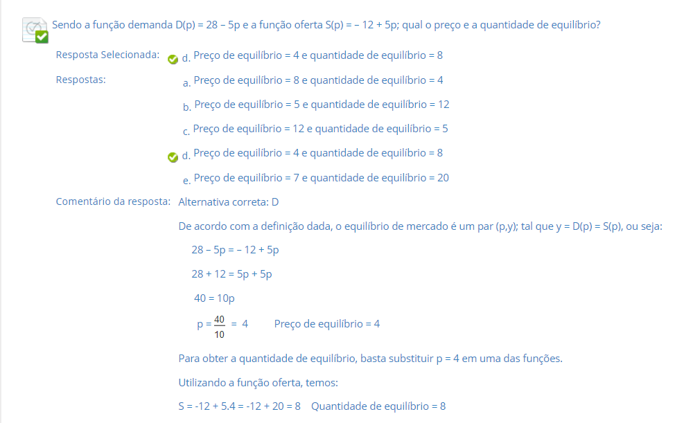 <p>Sendo a função demanda D(p) = 28 5p e a função oferta qual preço e a quantidade de equilíbrio? Resposta Selecionada: d. Preço de equilíbrio = 4 e quantidade de equilíbrio = 8 Respostas: a. Preço de equilíbrio =8 e quantidade de equilíbrio = 4 b. Preço de equilíbrio = 5 e quantidade de equilíbrio = 12 C. Preço de equilíbrio = 12 e quantidade de equilíbrio = 5 d. Preço de equilíbrio = 4 e quantidade de equilíbrio = 8 e. Preço de equilíbrio = 7 e quantidade de equilíbrio = 20 Comentário da resposta: Alternativa correta: D De acordo com a definição dada, equilíbrio de mercado é um par (p,y); tal ou seja: Preço de equilíbrio = 4 Para obter a quantidade de equilíbrio, basta substituir p = 4 em uma das funções. Utilizando a função oferta, temos: S = Quantidade de equilíbrio = 8</p>
