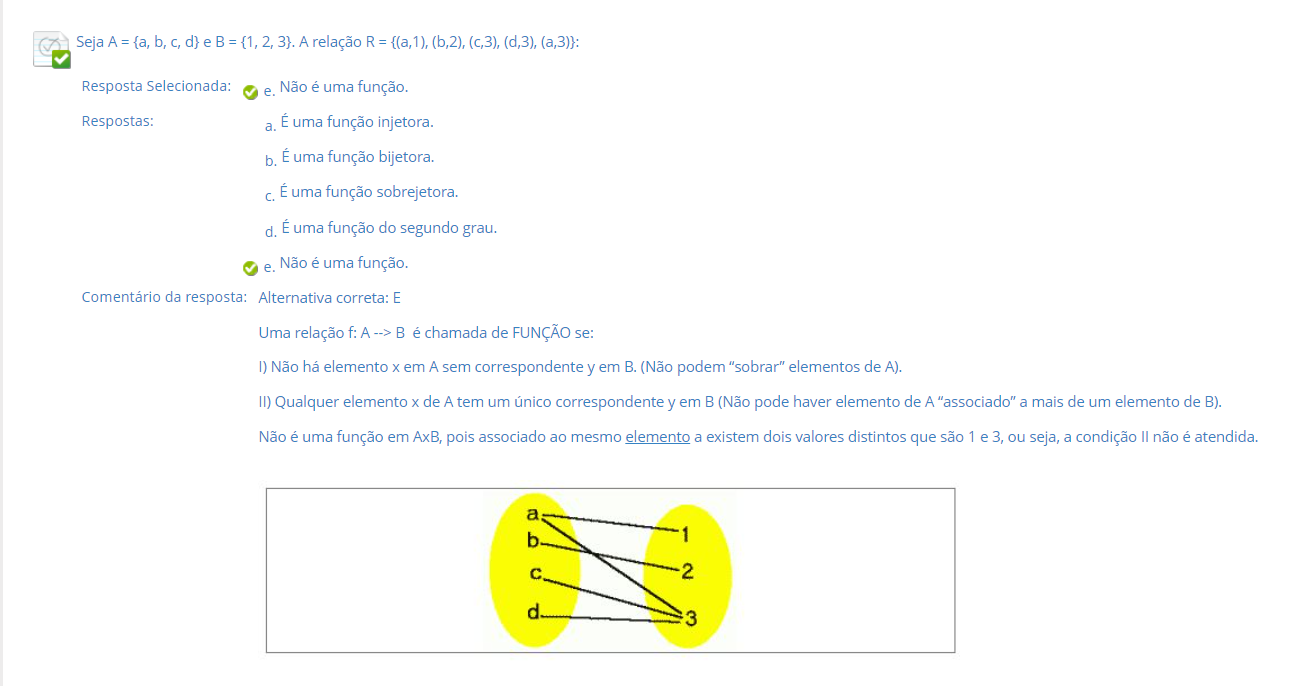 <p>Seja A = {a, A relação R = {(a,1), (b,2), (c,3), (d,3), (a,3)}: Resposta Selecionada: e. Não é uma função. Respostas: a. É uma função injetora b. É uma função bijetora. C. É uma função sobrejetora. d. É uma função do segundo grau. e. Não é uma função. Comentário da resposta: Alternativa correta: E Uma relação f: A B é chamada de FUNÇÃO se: Não há elemento X em A sem correspondente y em B. (Não podem "sobrar" elementos de A). II) Qualquer elemento de A tem um único correspondente y em B (Não pode haver elemento de A "associado" a mais de um elemento de B). Não é uma função em AxB, pois associado ao mesmo elemento a existem dois valores distintos que são 1 e 3, ou seja, a condição não é atendida. b 1 2 d 3</p>