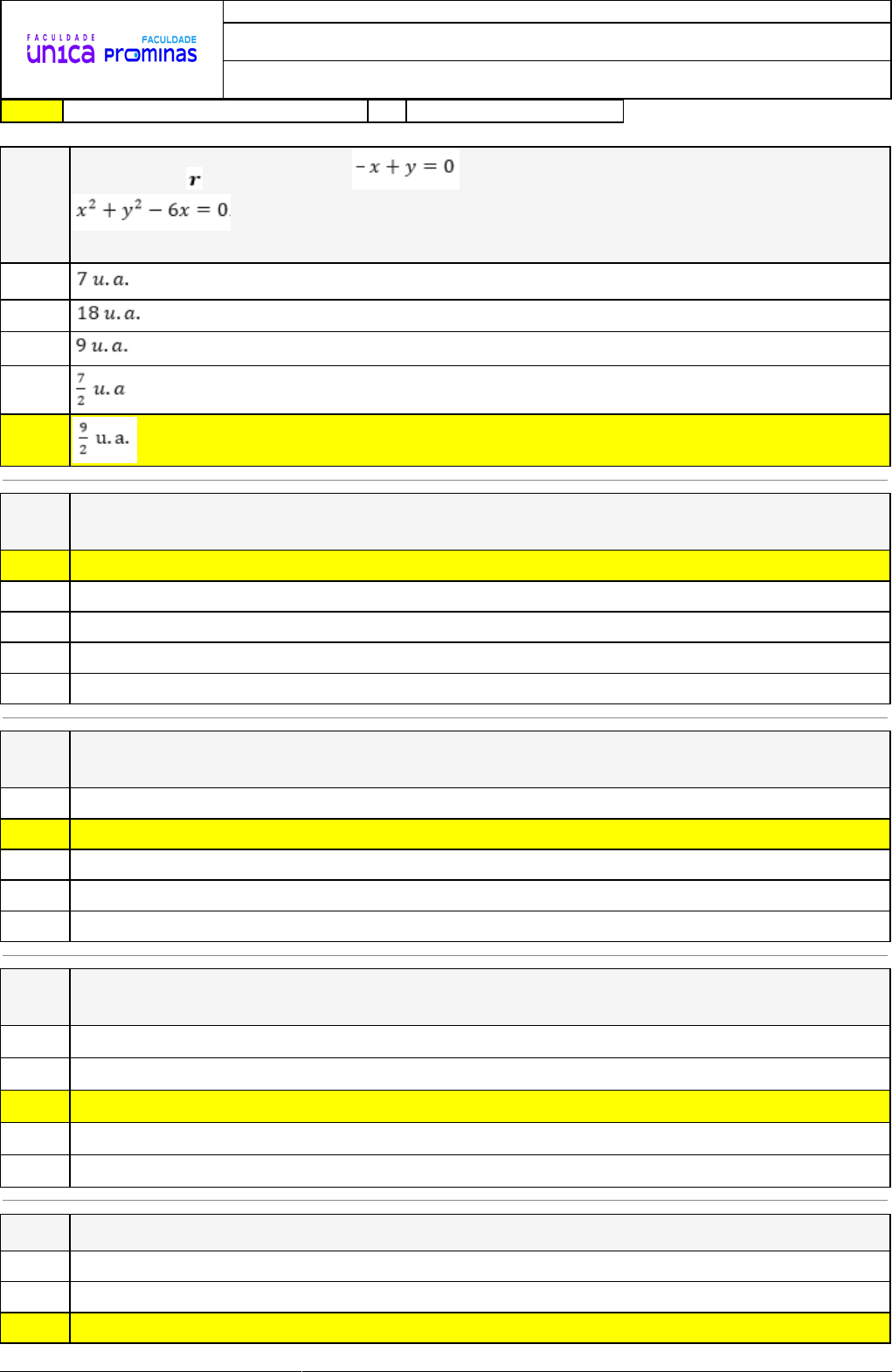 <p>16/09/2024 23:07:05 1/2</p><p>REVISÃO DE SIMULADO</p><p>Nome:</p><p>ANDREONE JOSÉ DE JESUS</p><p>Disciplina:</p><p>Geometria Analítica</p><p>Respostas corretas são marcadas em amarelo X Respostas marcardas por você.</p><p>Questão</p><p>001 Dada a reta cuja equação é e uma circunferência λ de equação</p><p>. Calcule a área do triângulo determinado pelo centro da</p><p>circunferência e pelos pontos de interseção da reta com a circunferência.</p><p>A)</p><p>B)</p><p>C)</p><p>D)</p><p>X E)</p><p>Questão</p><p>002 O maior valor inteiro de k para que a equação x2+y2-6x+4y+k=0 determine uma</p><p>circunferência é:</p><p>A) 12</p><p>B) 11</p><p>C) 14</p><p>D) 10</p><p>X E) 13</p><p>Questão</p><p>003 Os valores de m para que a reta r:4x+3y+m=0 e a circunferência</p><p>x2+y2-12x+16y+96=0 sejam secantes é:</p><p>A) -5 < m < 15</p><p>X B) -10 < m < 10</p><p>C) -7< m < 11</p><p>D) -12 < m < 4</p><p>E) 4 < m < 18</p><p>Questão</p><p>004 A equação geral da circunferência concêntrica com a circunferência x2+y2+2x+6y-6=0</p><p>e tangente à reta que passa pelos pontos A(-2,4) e B(2,1) é:</p><p>A) x2+y2+2x-8y-10=0</p><p>X B) x2+y2+3x+4y-1=0</p><p>C) x2+y2+2x+6y-15=0</p><p>D) x2+y2+4x-9y-12=0</p><p>E) x2+y2-7x+6y-18=0</p><p>Questão</p><p>005 A circunferência cuja equação geral é x2+y2 - 2x-10y+22= 0 tem raio igual a:</p><p>A) 4</p><p>B) 5</p><p>X C) 2</p><p>16/09/2024 23:07:05 2/2</p><p>D) 1</p><p>E) 3</p><p>Questão</p><p>006 Um ponto P(x,y) se move de tal modo que sua distância ao ponto C(-2,3) é igual a 4. O</p><p>lugar geométrico do ponto P tem equação</p><p>A) x2+y2+3x-8y+7=0</p><p>B) x2+y2+4x+2y-10=0</p><p>C) x2+y2+4x-6y-3=0</p><p>X D) x2+y2+3x-2y+12=0</p><p>E) x2+y2-2x-2y+8=0</p><p>Questão</p><p>007 A equação geral da circunferência de centro C(-3,1) e raio 6 é da forma x2+y2+ax+bx+c</p><p>= 0. O valor de 2b - c é:</p><p>A) 32</p><p>B) -7</p><p>X C) 14</p><p>D) 13</p><p>E) 22</p><p>Questão</p><p>008 Para quais valores de o ponto é interno a circunferência</p><p>.</p><p>A)</p><p>B)</p><p>C)</p><p>X D)</p><p>E)</p>