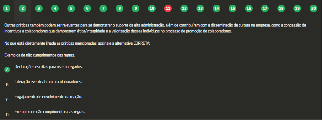<p>1 2 3 4 5 6 7 8 9 10 11 12 13 14 15 16 17 18 19 20 Outras práticas também podem ser relevantes para se demonstrar suporte da alta administração, além de contribuírem com a disseminação da cultura na empresa, como a concessão de incentivos a colaboradores que demonstrem ética/integridade e a valorização desses indivíduos no processo de promoção de No que está diretamente ligada as práticas mencionadas, assinale a alternativa Exemplos de não cumprimentos das regras. Declarações escritas para os empregados A Interação eventual com colaboradores B Engajamento de envolvimento na C Exemplos de não cumprimentos das regras D</p>