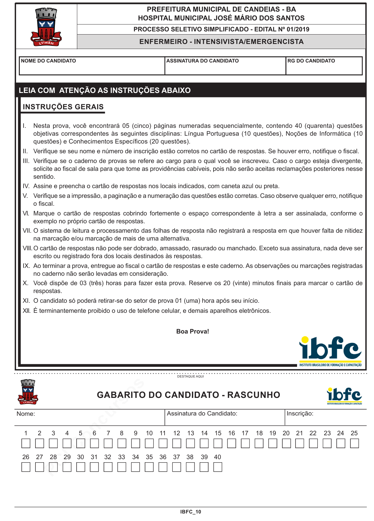 <p>pcimarkpci MjgwNDowMTRjOmRlNDA6ODhmZDowZDdjOmMxMzg6OWY1NTplZDFh:VHVlLCAyNiBNYXIgMjAyNCAxMjozMToyNSAtMDMwMA==</p><p>www.pciconcursos.com.brIBFC_10</p><p>DESTAQUE AQUI</p><p>GABARITO DO CANDIDATO - RASCUNHO</p><p>Nome: Assinatura do Candidato: Inscrição:</p><p>PREFEITURA MUNICIPAL DE CANDEIAS - BA</p><p>HOSPITAL MUNICIPAL JOSÉ MÁRIO DOS SANTOS</p><p>ENFERMEIRO - INTENSIVISTA/EMERGENCISTA</p><p>NOME DO CANDIDATO ASSINATURA DO CANDIDATO RG DO CANDIDATO</p><p>INSTRUÇÕES GERAIS</p><p>I. Nesta prova, você encontrará 05 (cinco) páginas numeradas sequencialmente, contendo 40 (quarenta) questões</p><p>objetivas correspondentes às seguintes disciplinas: Língua Portuguesa (10 questões), Noções de Informática (10</p><p>questões) e Conhecimentos Específicos (20 questões).</p><p>II. Verifique se seu nome e número de inscrição estão corretos no cartão de respostas. Se houver erro, notifique o fiscal.</p><p>III. Verifique se o caderno de provas se refere ao cargo para o qual você se inscreveu. Caso o cargo esteja divergente,</p><p>solicite ao fiscal de sala para que tome as providências cabíveis, pois não serão aceitas reclamações posteriores nesse</p><p>sentido.</p><p>IV. Assine e preencha o cartão de respostas nos locais indicados, com caneta azul ou preta.</p><p>V. Verifique se a impressão, a paginação e a numeração das questões estão corretas. Caso observe qualquer erro, notifique</p><p>o fiscal.</p><p>VI. Marque o cartão de respostas cobrindo fortemente o espaço correspondente à letra a ser assinalada, conforme o</p><p>exemplo no próprio cartão de respostas.</p><p>VII. O sistema de leitura e processamento das folhas de resposta não registrará a resposta em que houver falta de nitidez</p><p>na marcação e/ou marcação de mais de uma alternativa.</p><p>VIII. O cartão de respostas não pode ser dobrado, amassado, rasurado ou manchado. Exceto sua assinatura, nada deve ser</p><p>escrito ou registrado fora dos locais destinados às respostas.</p><p>IX. Ao terminar a prova, entregue ao fiscal o cartão de respostas e este caderno. As observações ou marcações registradas</p><p>no caderno não serão levadas em consideração.</p><p>X. Você dispõe de 03 (três) horas para fazer esta prova. Reserve os 20 (vinte) minutos finais para marcar o cartão de</p><p>respostas.</p><p>XI. O candidato só poderá retirar-se do setor de prova 01 (uma) hora após seu início.</p><p>XII. É terminantemente proibido o uso de telefone celular, e demais aparelhos eletrônicos.</p><p>Boa Prova!</p><p>LEIA COM ATENÇÃO AS INSTRUÇÕES ABAIXO</p><p>1 2 3 4 5 6 7 8 9 10 11 12 13 14 15 16 2117 2218 2319 2420 25</p><p>26 27 28 29 30 31 32 33 34 35 36 37 38 39 40</p><p>PROCESSO SELETIVO SIMPLIFICADO - EDITAL Nº 01/2019</p><p>pcimarkpci MjgwNDowMTRjOmRlNDA6ODhmZDowZDdjOmMxMzg6OWY1NTplZDFh:VHVlLCAyNiBNYXIgMjAyNCAxMjozMToyNSAtMDMwMA==</p><p>www.pciconcursos.com.br</p><p>RASCUNHO</p><p>pcimarkpci MjgwNDowMTRjOmRlNDA6ODhmZDowZDdjOmMxMzg6OWY1NTplZDFh:VHVlLCAyNiBNYXIgMjAyNCAxMjozMToyNSAtMDMwMA==</p><p>www.pciconcursos.com.br 1IBFC_10</p><p>LÍNGUA PORTUGUESA</p><p>Leia com atenção a tira de “Garfield”, criada pelo</p><p>cartunista Jim Davis, para responder às questões 1 e 2</p><p>a seguir.</p><p>1) Considere o sentido da tira acima e a Gramática</p><p>Normativa da Língua Portuguesa, para assinalar a</p><p>alternativa incorreta.</p><p>a) A Prosopopeia, presente na tira, é um recurso que torna</p><p>verossímil a linguagem verbal utilizada por Garfield nos</p><p>dois últimos quadrinhos.</p><p>b) Embora não utilize nenhuma conjunção explicativa, a</p><p>fala de Garfield no segundo quadrinho é uma explicação,</p><p>pois responde à pergunta feita anteriormente.</p><p>c) A utilização do acento grave, no primeiro quadrinho, é</p><p>de uso facultativo, já que o substantivo “noite” pode, ou</p><p>não, ser precedido do artigo definido “a”.</p><p>d) O humor da tira é construído pela forma indireta como,</p><p>no último quadrinho, a personagem indica que a</p><p>cantoria dos gatos não é apreciada pelos humanos.</p><p>2) De acordo com a leitura atenta da tira e com a</p><p>Gramática Normativa da Língua Portuguesa, analise as</p><p>afirmativas abaixo e assinale a alternativa correta.</p><p>I. No primeiro quadrinho, a palavra “Garfield” é</p><p>classificada sintaticamente como um Vocativo, pois</p><p>refere-se diretamente ao interlocutor, chamando-o para</p><p>o diálogo.</p><p>II. No primeiro quadrinho, a grafia da palavra “porque” está</p><p>em desacordo com a Gramática Normativa da Língua</p><p>Portuguesa, já que no contexto em que está inserida</p><p>ela tem o mesmo valor semântico da expressão “por</p><p>qual razão”.</p><p>III. O verbo “seríamos”, no último quadrinho, indica</p><p>uma possibilidade, uma incerteza, o que explica sua</p><p>conjugação no Modo Subjuntivo.</p><p>IV. A expressão “alvos fáceis” é um Objeto Direto, já que</p><p>complementa o sentido do verbo “ser” sem o auxílio de</p><p>nenhuma preposição.</p><p>a) Apenas as afirmativas I e II estão corretas.</p><p>b) Apenas as afirmativas I e IV estão corretas.</p><p>c) Apenas as afirmativas II e III estão corretas.</p><p>d) Apenas as afirmativas III e IV estão corretas.</p><p>Leia atentamente a notícia a seguir para responder às</p><p>questões 3, 4, 5 e 6.</p><p>Depressão deve ser prevenida a partir da infância, dizem</p><p>especialistas (ALISSON, Elton - Revista Exame).</p><p>(texto adaptado)</p><p>Considerada o mal do século pela Organização Mundial</p><p>de Saúde (OMS), a depressão já desponta como a terceira</p><p>maior doença entre adolescentes e é a segunda principal</p><p>causa de morte de jovens entre 15 e 25 anos no mundo.</p><p>A fim de prevenir o desenvolvimento desse transtorno</p><p>mental nessa fase da vida é preciso dotar as crianças de</p><p>habilidades socioemocionais para que sejam capazes, desde</p><p>cedo, de l