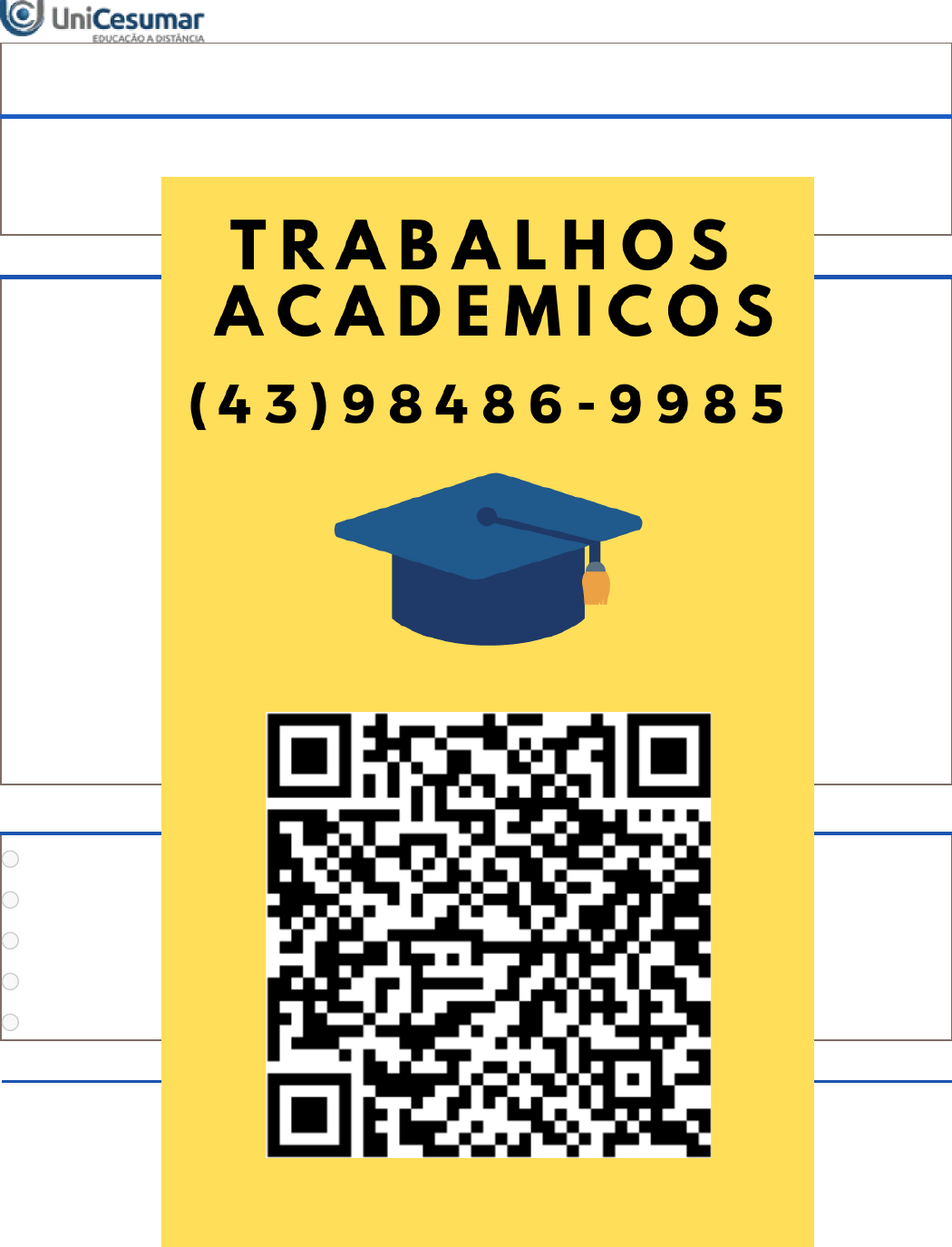 <p>EGRAD_EMCA - ESTUDO CONTEMPORÂNEO E TRANSVERSAL: INOVAÇÃO E PENSAMENTO CRIATIVO -</p><p>2024 - 53 - 1</p><p>Período:16/09/2024 00:00 a 22/09/2024 23:59 (Horário de Brasília)</p><p>Status:ABERTO</p><p>Nota máxima:5,00</p><p>Gabarito:Gabarito será liberado no dia 21/10/2024 00:00 (Horário de Brasília)</p><p>Nota obtida:</p><p>1ª QUESTÃO</p><p>Para muitos pesquisadores, a criatividade é fruto tanto do trabalho consciente quanto do inconsciente do</p><p>ser pensante. Ela se manifesta em ideias que surgem subitamente quando o cérebro, conscientemente, não</p><p>está trabalhando em determinado problema, mas que necessita do pensamento lógico, consciente, para pô-</p><p>la em teste. Graham Wallas se utilizou dessa corrente de pensamento para definir as quatro fases de seu</p><p>modelo sobre o processo de criação (Da Graça Peraça; Montoito, 2023).</p><p>Fonte: https://periodicos.sbu.unicamp.br/ojs/index.php/zetetike/article/view/8671675/32645. Acesso em: jul.</p><p>2024.</p><p>Sobre as fases do processo criativo proposto por Graham Wallas, analise as sentenças a seguir:</p><p>I. A implementação é a fase de executar, testar e validar o que foi desenvolvido anteriormente.</p><p>II. A fase da iluminação ocorre quando uma ideia surge após pesquisa intensa e reflexão inconsciente.</p><p>III. A fase de preparação é quando o criativo investiga e explora seu repertório para entender e abordar o</p><p>problema recebido.</p><p>IV. A fase de incubação é importante para se concentrar na resolução do problema, eliminando qualquer</p><p>distração para garantir um processamento consciente e direcionado.</p><p>É correto o que se afirma em:</p><p>ALTERNATIVAS</p><p>I e IV, apenas.</p><p>II e III, apenas.</p><p>III e IV, apenas.</p><p>I, II e III, apenas.</p><p>II, III e IV, apenas.</p><p>2ª QUESTÃO</p><p>16/09/2024, 10:55 Unicesumar - Ensino a Distância</p><p>about:blank 1/6</p><p>É importante o conhecimento sobre os aspectos do desenvolvimento e o exercício da criatividade, os fatores</p><p>que influenciam os bloqueios do pensamento criativo e inovador que podem prejudicar o desenvolvimento</p><p>dessa habilidade. Esses conhecimentos podem esclarecer o equívoco do autojulgamento de pessoas que</p><p>não se consideram criativas, e acabam exercendo uma cobrança excessiva e incoerente sobre a capacidade</p><p>criativa ou até mesmo duvidando da existência de seu potencial. Sendo que, por natureza, todo ser humano</p><p>é criativo.</p><p>Fonte: https://recima21.com.br/index.php/recima21/article/view/1241/978. Acesso em: 23 jul. 2024.</p><p>Com base nas informações apresentadas, avalie as asserções a seguir e a relação proposta entre elas:</p><p>I. A criatividade exige experimentação, e superar o medo do fracasso é essencial para evitar bloqueios e</p><p>enfrentar novos desafios.</p><p>PORQUE</p><p>II. A comparação com outros profissionais é um gerador de bloqueio mental, pois cada um tem suas</p><p>próprias experiências e estilos de vida.</p><p>A respeito dessas asserções, assinale a alternativa correta:</p><p>ALTERNATIVAS</p><p>As asserções I e II são verdadeiras, e a II é uma justificativa correta da I.</p><p>As asserções I e II são verdadeiras, mas a II não é uma justificativa correta da I.</p><p>A asserção I é uma proposição verdadeira, e a II é uma proposição falsa.</p><p>A asserção I é uma proposição falsa, e a II é uma proposição verdadeira.</p><p>As asserções I e II são falsas.</p><p>3ª QUESTÃO</p><p>“Quando se fala em criatividade a maior parte das pessoas associam-na a imaginação, novo, original, fora do</p><p>comum, génio, único, lunático, sendo comum ligá-la a áreas como: escrever ou representar peças de teatro,</p><p>esculpir, pintar, escrever, compor e executar peças musicais, etc.. Mas também é associada a grandes</p><p>descobertas científicas em diferentes campos como Medicina, Física, Biologia”.</p><p>Fonte: VALE, I. Pense nisto: será que a criatividade é só para génios? Educação e Matemática, [s. l.], n. 135,</p><p>p. 40-41, 2015. Disponível em: https://em.apm.pt/index.php/em/article/download/2323/2972. Acesso em: 22</p><p>jul. 2024.</p><p>Assinale a alternativa correta que descreve os mitos sobre criatividade mencionados no texto:</p><p>ALTERNATIVAS</p><p>Mito do artista, mito do dom e mito do acaso.</p><p>Mito do artista, mito do dom e mito da criação.</p><p>Mito do acaso, mito do dom e mito da criação.</p><p>Mito da curiosidade, mito do dom e mito da criação.</p><p>Mito do artista, mito da curiosidade e mito da criação.</p><p>4ª QUESTÃO</p><p>16/09/2024, 10:55 Unicesumar - Ensino a Distância</p><p>about:blank 2/6</p><p>“Por um lado, ser criativo implica aptidões. Cada um de nós demonstraria um perfil específico em testes de</p><p>aptidões e, obviamente, se alguém tiver uma capacidade figurativa elevada, por exemplo, é provável que</p><p>venha a ser criativo quando desenha, pinta ou planifica uma decoração; já se for enfatizada uma capacidade</p><p>verbal, é mais provável que se venha a ser criativo escrevendo. As aptidões refletem-se então nos contornos</p><p>dos nossos esforços criativos, não só na alta criatividade, mas também na manifestação criativa quotidiana”</p><p>(Morais, 2015, p. 3).</p><p>Fonte: MORAIS, M. de F. Criatividade: conceito e desafios. Educação e Matemática, 2015. Disponível em:</p><p>https://repositorium.sdum.uminho.pt/bitstream/1822/42298/1/_matematica_20morais.pdf. Acesso em: 18 jul.</p><p>2024.</p><p>Com base nas características de indivíduos criativos, assinale a alternativa correta:</p><p>ALTERNATIVAS</p><p>Autoestima, curiosidade, coragem e suficiência.</p><p>Curiosidade, comparação, coragem e suficiência.</p><p>Autoestima, curiosidade, coragem e determinação.</p><p>Determinação, coragem, curiosidade e passividade.</p><p>Autoestima, comparação, curiosidade e passividade.</p><p>5ª QUESTÃO</p>