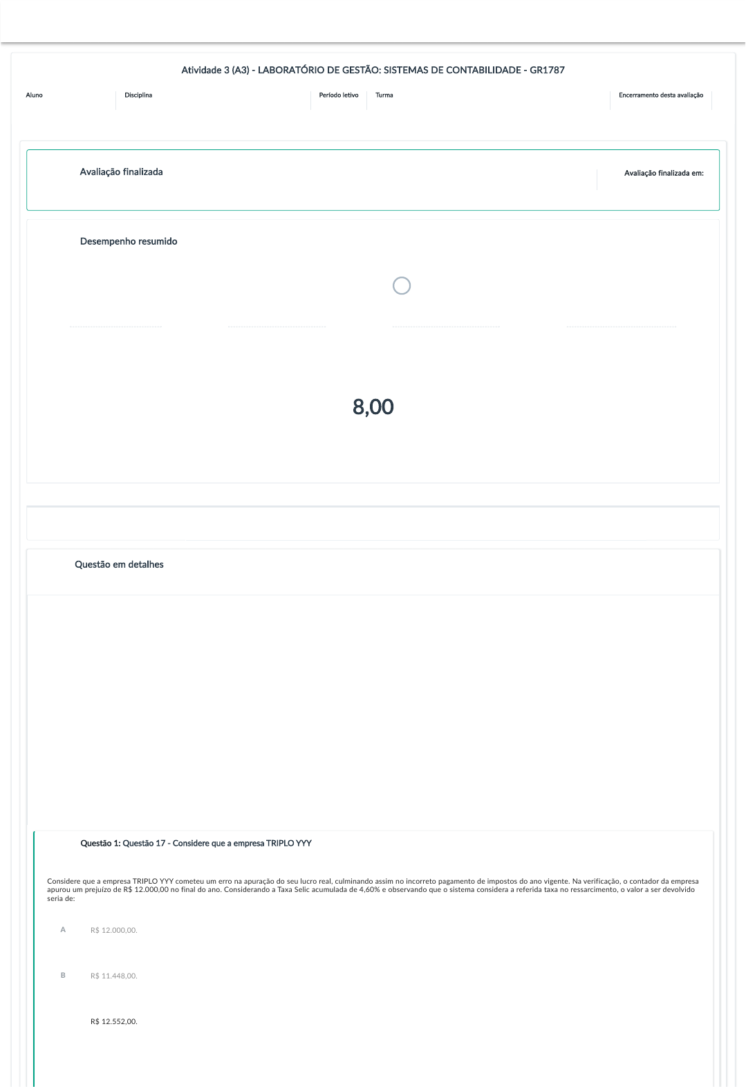 <p>Respostas</p><p>Desempenho do aluno</p><p></p><p>Atividade 3 (A3) - LABORATÓRIO DE GESTÃO: SISTEMAS DE CONTABILIDADE - GR1787</p><p>Aluno</p><p>GUSTAVO HIROYUKI HADA</p><p>Disciplina</p><p>LABORATÓRIO DE GESTÃO: SISTEMAS DE CONTABILIDADE</p><p>Período letivo</p><p>20242</p><p>Turma</p><p>LABORATÓRIO DE GESTÃO: SISTEMAS DE CONTABILIDADE (242GGR1787A)</p><p>Encerramento desta avaliação</p><p>21/09/2024 23:59:59</p><p>Avaliação finalizada</p><p>Resultado final</p><p>Avaliação finalizada em:</p><p>19/09/2024 23:25:26</p><p>Desempenho resumido</p><p>Resumo de acertos e erros do aluno</p><p>8 corretas</p><p>Total de questões corretas</p><p>2 incorretas</p><p>Total de questões incorretas</p><p>0 sem resposta</p><p>Total de questões sem resposta</p><p>0 não corrigidas</p><p>Total de questões não corrigidas</p><p>Nome do aluno Total de questões Questões objetivas Acertos em objetivas Valor da avaliação Nota final</p><p>GUSTAVO HIROYUKI HADA 10 10 8 10,00 8,00</p><p>8,00</p><p>Nota final</p><p>Questão em detalhes</p><p>Gabarito e respostas das questões</p><p> </p><p></p><p> </p><p></p><p>Considere que a empresa TRIPLO YYY cometeu um erro na apuração do seu lucro real, culminando assim no incorreto pagamento de impostos do ano vigente. Na verificação, o contador da empresa</p><p>apurou um prejuízo de R$ 12.000,00 no final do ano. Considerando a Taxa Selic acumulada de 4,60% e observando que o sistema considera a referida taxa no ressarcimento, o valor a ser devolvido</p><p>seria de:</p><p>C R$ 12.552,00.</p><p>Resposta correta</p><p>Questão 1: Questão 17 - Considere que a empresa TRIPLO YYY</p><p>Questão obje�va</p><p>1 /1</p><p>A R$ 12.000,00.</p><p>B R$ 11.448,00.</p><p></p><p>D R$ 11.952,00.</p><p>E R$ 12.952,00.</p><p>A Constituição Federal (CF) e a Consolidação das Leis Trabalhistas (CLT) determinam que todo trabalhador devidamente registrado, após 12 meses de trabalho, tem direito a férias anuais</p><p>remuneradas.</p><p>SEBRAE AMAPÁ. Como conceder férias ao seu empregado. 2019. Disponível em: <http://www.sebrae.com.br/sites/PortalSebrae/ufs/ap/artigos/como-conceder-ferias-ao-seu-</p><p>empregado,bc3b21aa2245c410VgnVCM1000003b74010aRCRD>. Acesso em: 20 ago. 2019</p><p>Sobre férias, leia os excertos a seguir:</p><p>I - Trata-se do direito de gozo de 30 dias de férias, contados a partir da data da admissão do empregado, após 12 meses completados.</p><p>II - Refere-se ao prazo que a lei estabelece para que empregador conceda as férias ao empregado em um prazo de 12 meses subsequentes.</p><p>As assertivas acima tratam respectivamente de:</p><p>D Período Aquisitivo e Período Concessivo.</p><p>Resposta correta</p><p>Questão 2: Questão 20 - A Cons�tuição Federal (CF) e a Consolidação das Leis Trabalhistas (CLT)</p><p>Questão obje�va</p><p>1 /1</p><p>A Período Concessivo e Período Aquisitivo.</p><p>B Período Aquisitivo e Período Temporal.</p><p>C Período Temporal e Período Aquisitivo.</p><p>E Período Temporal e Período Complementar.</p><p>O empresário da empresa Brinquedos Natalinos Ltda. está assustado com a carga tributária mensal e com os gastos que estão incidindo na folha do mês de janeiro. O empresário pondera que houve</p><p>contratações adicionais no mês de dezembro para atender à demanda, mas a reclamação é assídua, uma vez que a empresa em sua visão paga dois salários ao colaborador se somar salário +</p><p>impostos.</p><p>A tabela dos percentuais médios dos principais descontos indica:</p><p>INSS PLANO DE SAÚDE IRPF</p><p>11% 5% 7,50%</p><p>Observando que todos os descontos acima descritos são retidos do salário do colaborador, considerando que um funcionário ganhe R$ 3.220,00 bruto, qual seria o seu salário líquido se houvesse</p><p>todos descontos descritos na tabela?</p><p>A R$ 2.366,70.</p><p>Resposta correta</p><p>Questão 3: Questão 05 - O empresário da empresa Brinquedos Natalinos Ltda.</p><p>Questão obje�va</p><p>1 /1</p><p>B R$ 2.865,80.</p><p>C R$ 2.962,40.</p><p>D R$ 2.978,50.</p><p>E R$ 2.624,30.</p><p></p><p></p><p>Os softwares contábeis em si permitem uma série de opções que deixam o usuário mais próximo do acerto do que do erro. A facilidade encontrada nas diversas funcionalidades não exime o usuário</p><p>de ter o conhecimento necessário para operar o sistema.</p><p>Considerando o contexto, na gestão de recursos humanos há uma especificidade em relação ao pagamento das férias segundo a qual a empresa é punida senão conceder as férias para o empregado</p><p>ou que o fizer fora do período concessivo.</p><p>Observe as alternativas a seguir e identifique qual a punição aplicada nas empresas, caso as férias não sejam concedidas da maneira correta.</p><p>D A empresa deverá pagar férias em dobro.</p><p>Resposta correta</p><p>Questão 4: Questão 04 - Os so�wares contábeis em si permitem uma série de opções que deixam o usuário mais próximo do acerto do que do erro.</p><p>Questão obje�va</p><p>1 /1</p><p>A O empregado poderá ficar até 60 dias de férias.</p><p>B A empresa pode pagar até 3 (três) salários nominais.</p><p>C O empregado poderá pleitear ½ salário nominal.</p><p>E A empresa deverá pagar ⅓ de férias ao empregado.</p><p>O contribuinte geralmente sofre bastante com impostos, há dois pesos e duas medidas no ato de tributação, ou seja, quando os impostos, tributos, taxas não são pagos, há recorrentes cobranças,</p><p>sanções, punições. No outro lado da moeda, caso o contribuinte pague algum valor que não é devido, ou em duplicidade, a burocracia para receber geralmente causa transtornos e dor de cabeça.</p><p>Tendo em vista o pedido de ressarcimento de tributos/impostos federais, analise as assertivas a seguir:</p><p>I - O ressarcimento pode ser solicitado por pagamento indevido em casos de contribuição previdenciária indevida.</p><p>II - As solicitações de ressarcimento podem ser solicitadas para impostos com