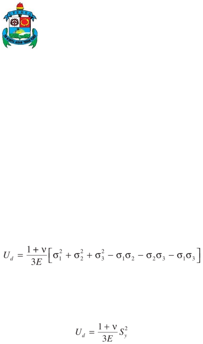 <p>UNIVERSIDADE FEDERAL RURAL DO SEMI-ÁRIDO</p><p>CAMPUS CARAÚBAS</p><p>CURSO DE ENGENHARIA MECÂNICA</p><p>Disciplina: Resistência dos Materiais II</p><p>Docente: Áleft Verlanger Rocha Gomes</p><p>________________________________________________________________________________________________________________________________________________________</p><p>UNIDADE II – PROJETO DE EIXOS</p><p>1) Leia atentamente o texto e, manualmente, faça as demonstrações.</p><p>A Teoria da Máxima Energia de Distorção de von Mises diz que um</p><p>componente estrutural está seguro desde que o valor máximo da energia de distorção por</p><p>unidade de volume naquele material permaneça menor que a energia de distorção por</p><p>unidade de volume necessária para provocar escoamento em um corpo de prova do</p><p>mesmo material em um ensaio de tração.</p><p>Sabendo que a energia total de deformação de uma peça carregada (U) consiste na</p><p>soma de duas componentes, a energia devido ao carregamento hidrostático (Uh), que</p><p>muda o seu volume, e a energia devido à distorção (Ud), que muda a sua forma,</p><p>demonstre que para um caso geral:</p><p>Enquanto que para um caso específico mostre que para um corpo de prova</p><p>submetido à um ensaio de tração:</p><p>Onde Sy é a tensão de escoamento do material, podendo ser utilizado 𝜎adm.</p><p>Em seguida, será possível obter o critério de falha de von Mises para o estado</p><p>triplo de tensões:</p><p>Que para o estado duplo de tensões, resulta em:</p><p>Com isso, demonstre qual a equação para encontrar o raio de um eixo utilizando</p><p>esse critério.</p><p>Por outro lado, a Teoria da Tensão Máxima de cisalhamento de Tresca afirma</p><p>que a falha ocorre quando a tensão máxima de cisalhamento em uma região excede a</p><p>tensão máxima de cisalhamento de um corpo de prova sob tração em escoamento, que</p><p>por esse método seria a metade da tensão normal de escoamento. Dessa forma, temos que:</p><p>A partir disso, demonstre qual a equação para encontrar o raio de um eixo</p><p>utilizando o critério de Tresca.</p><p>2) Os mancais A e D exercem somente as componentes y e z da força sobre o eixo.</p><p>Determine o eixo de menor diâmetro (em mm) que suportará a carga. Utilize a teoria de</p><p>falha da tensão de cisalhamento máxima e a teoria de falha da máxima energia de</p><p>distorção.</p><p>Dados:</p><p>L1 = 1º e dois últimos dígitos da matrícula (em mm)</p><p>L2 = 3º ao 5º dígito da matrícula (em mm)</p><p>L3 = 3º e 4º juntamente com o último dígito da matrícula (em mm)</p><p>r1 = soma de todos os dígitos da matrícula (em mm)</p><p>r2 = 50 + último dígito da matrícula (em mm)</p><p>Fy = 200000/r1 (em N)</p><p>Fz = 200000/r2 (em N)</p><p>𝜏adm = 85 MPa</p><p>𝜎adm = 150 MPa</p><p>EXEMPLO: número de matrícula = 2022032455</p><p>L1 = 255 mm</p><p>L2 = 220 mm</p><p>L3 = 225 mm</p><p>r1 = 25 mm</p><p>r2 = 55 mm</p><p>Fz = 12000 N</p><p>Fy = 5454,545 N</p>