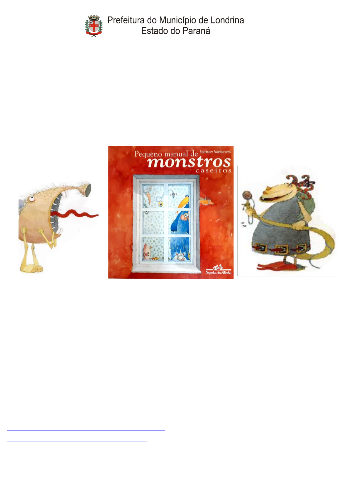 <p>Equipe de Língua Portuguesa:</p><p>Aliny Perrota, Franciele Medeiros, Jozélia Tanaca e Rafaeli Peres</p><p>junho/2020</p><p>SECRETARIA MUNICIPAL DE EDUCAÇÃO</p><p>Assessoria Pedagógica – Gerência de Ensino Fundamental</p><p>Apoio Pedagógico de Língua Portuguesa</p><p>LEITURA E INTERPRETAÇÃO DE TEXTO</p><p>PARA TURMAS DE 4º E 5º ANOS</p><p>Prezado Professor (a),</p><p>O objetivo deste material é apresentar atividades de leitura e interpretação textual para alunos de 4º e 5º</p><p>anos com vistas ao desenvolvimento da compreensão e fluência leitora. Explore o significado das palavras,</p><p>das expressões com linguagem figurada. O material traz também vários gêneros textuais como: cartaz,</p><p>anúncio, cardápio e convite. O professor poderá explorar esses gêneros na ordem do caderno de atividades ou</p><p>de acordo com os objetivos do planejamento. Junto com o caderno de atividades, segue o link com as</p><p>contações de história no Youtube.</p><p>Apoio Pedagógico de Língua Portuguesa</p><p>SME-Londrina – 2020</p><p>https://www.youtube.com/watch?v=fodWbhwn2Ek&t=26s</p><p>https://www.youtube.com/watch?v=0QesqbQ5pVY</p><p>https://www.youtube.com/watch?v=FE4h7L4F874</p><p>https://www.youtube.com/watch?v=fodWbhwn2Ek&t=26s</p><p>https://www.youtube.com/watch?v=0QesqbQ5pVY</p><p>https://www.youtube.com/watch?v=FE4h7L4F874</p><p>2</p><p>Vamos conhecer alguns monstrinhos</p><p>DR. BAGUNSUS</p><p>MAY TAKA</p><p>DE DU DUR</p><p>HISTER ICA</p><p>Queridos alunos (as),</p><p>Já faz tempo que identificamos pela primeira vez a existência de monstros caseiros, essas</p><p>criaturas que vivem em nossas casas passando rasteiras e dando encontrões na gente,</p><p>sempre bolando algum plano maldoso para tornar nossa vida cotidiana um pouco mais</p><p>complicada do que gostaríamos.</p><p>Decidimos, por isso, apresentar nesse primeiro volume dois daqueles que chamamos</p><p>“monstros caseiros comuns”, aqueles que costumam ser encontrados em todas as casas ou</p><p>escolas. Identificamos outras espécies – e publicaremos novos volumes à medida que</p><p>nossa pesquisa avançar.</p><p>Convém notar, por fim, que as ilustrações deste manual foram feitas a partir da</p><p>observação de monstros masculinos, em alguns casos, e de monstras, em outros. Mas, é</p><p>claro, ambos os gêneros podem ser encontrados em todas as espécies.</p><p>BOA LEITURA!</p><p>3</p><p>CONVERSANDO SOBRE O TEXTO</p><p>A) Como é o nome do monstrinho que você acabou de ler?</p><p>______________________________________________________________________________</p><p>Só de ler esses nomes você já consegue imaginar o que</p><p>esses pequenos monstrinhos fazem?</p><p>Vamos descobrir juntos!!!</p><p>DE DU DUR – O monstro dedo duro</p><p>Se você de repente fica com vontade de dedar alguém, quer dizer que DE DU DUR</p><p>está por perto.Você vai se pegar contando para sua mãe quem comeu todos os</p><p>morangos, vai contar para a professora quem escreveu aquele palavrão no quadro-negro,</p><p>e é capaz até de contar ao chefe que certo colega levou três horas almoçando. É o DE</p><p>DU DUR que está virando sua cabeça! Cuidado! No início, você até pode receber elogios,</p><p>mas logo vai começar a perder os amigos e descobrir que os pais e os professores</p><p>também não gostam muito de dedos-duros.</p><p>Por isso, mantenha DE DU DUR bem longe. Até porque pode ser que você mesmo</p><p>coma todos os morangos.</p><p>4</p><p>B) Quais são as atitudes do monstrinho que você acabou de ler?</p><p>______________________________________________________________________________</p><p>______________________________________________________________________________</p><p>AMPLIANDO O VOCABULÁRIO</p><p>Escolha e pinte o retângulo das palavras que tem o mesmo significado da palavra DEDO DURO.</p><p>VOCÊ SABE O QUE SIGNIFICA A EXPRESSÃO DEDO DURO?</p><p>Dedo duro é aquele que denuncia alguém, que conta algo que não</p><p>deveria ser dito, traindo a confiança de alguém.</p><p>HISTER ICA – A monstra do berro</p><p>Hister Ica é a monstra que faz você berrar, tenha ou não motivos. Quando Hister</p><p>Ica ataca, há dois remédios eficazes: ou parar de berrar em dez segundos e explicar</p><p>qual é o seu problema numa frase; ou ficar na frente do espelho e esperar ali</p><p>berrando.</p><p>tagarela fofoqueiro discreto</p><p>metido</p><p>5</p><p>CONVERSANDO SOBRE O TEXTO</p><p>A) Como se chama monstrinho que você acabou de ler? Ele é um monstro ou uma monstra?</p><p>______________________________________________________________________________</p><p>B) De acordo com o texto, quais os dois remédios eficazes para combater o ataque de Hister</p><p>Ica?</p><p>_____________________________________________________________________________</p><p>_____________________________________________________________________________</p><p>_____________________________________________________________________________</p><p>C) Você já foi atacado por Hister Ica, ou conhece alguém que tenha sido? Escreva como foi</p><p>esse ataque.</p><p>_____________________________________________________________________________</p><p>_____________________________________________________________________________</p><p>_____________________________________________________________________________</p><p>_____________________________________________________________________________</p><p>D) Cite algumas coisas que poderiam te fazer berrar como Hister Ica.</p><p>_____________________________________________________________________________</p><p>_____________________________________________________________________________</p><p>_____________________________________________________________________________</p><p>Agora represente com um desenho a sua resposta.</p><p>6</p><p>AMPLIANDO O VOCABULÁRIO</p><p>VOCÊ ACABOU DE CONHECER MAIS UM MONSTRINHO COM UM NOME</p><p>DIFERENTE: HISTER ICA</p><p>MAS VOCÊ SABE DE ONDE VEM ES