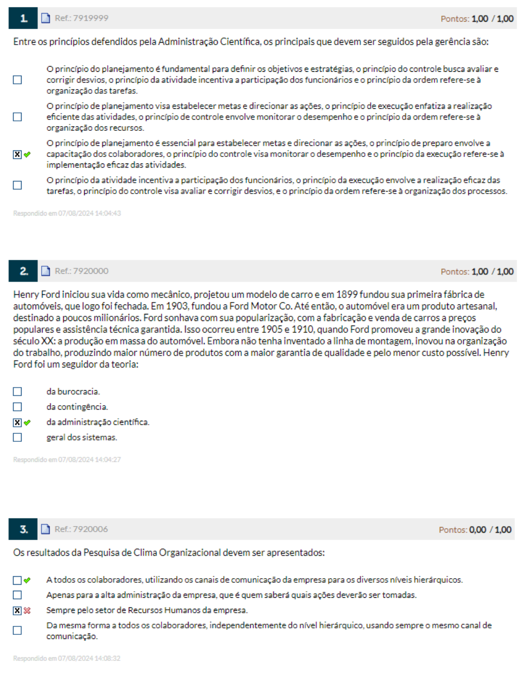 <p>1 7919999 Pontos: 1,00 / 1,00 Entre os princípios defendidos pela Administração Científica, os principais que devem ser seguidos pela gerência são: princípio do planejamento é fundamental para definir os objetivos e estratégias, o princípio do controle busca avaliar e corrigir desvios, o princípio da atividade incentiva a participação dos funcionários e o princípio da ordem refere-se à organização das princípio de planejamento visa estabelecer metas e direcionar as ações, princípio de execução enfatiza a realização eficiente das o princípio de controle envolve monitorar o desempenho e o princípio da ordem refere-se à organização dos recursos. princípio de planejamento é essencial para estabelecer metas e direcionar as o princípio de preparo envolve a capacitação dos colaboradores, o princípio do controle visa monitorar o desempenho e o princípio da execução refere-se à implementação eficaz das atividades. princípio da atividade incentiva a participação dos funcionários, o princípio da execução envolve a realização eficaz das tarefas, o princípio do controle visa avaliar e corrigir desvios, e o princípio da ordem refere-se à organização dos processos. Respondido em 07/08/2024 14:04:43 2. 7920000 Pontos: 1,00 / 1,00 Henry Ford iniciou sua vida como mecânico, projetou um modelo de carro e em 1899 fundou sua primeira fábrica de automóveis, que logo foi fechada. Em 1903, fundou a Ford Motor Co. Até então, o automóvel era um produto artesanal, destinado a poucos Ford sonhava com sua popularização, com a fabricação e venda de carros a preços populares e assistência técnica garantida. Isso ocorreu entre 1905 e quando Ford promoveu a grande inovação do século XX: a produção em massa do automóvel. Embora não tenha inventado a linha de montagem, inovou na organização do trabalho, produzindo maior número de produtos com a maior garantia de qualidade e pelo menor custo possível. Henry Ford foi um seguidor da teoria: da burocracia. da contingência. da administração geral dos sistemas. Respondido em 07/08/2024 14:04:27 3. Ref.: 7920006 Pontos: 0,00 / 1,00 Os resultados da Pesquisa de Clima Organizacional devem ser apresentados: A todos os colaboradores, utilizando os canais de comunicação da empresa para os diversos níveis hierárquicos. Apenas para a alta administração da empresa, que é quem saberá quais ações deverão ser tomadas. Sempre pelo setor de Recursos Humanos da empresa. Da mesma forma a todos os colaboradores, independentemente do nível hierárquico, usando sempre o mesmo canal de comunicação. Respondido em 07/08/2024 14:08:32</p><p>4. 7920013 Pontos: 1,00 / 1,00 A fase final da Pesquisa de Clima Organizacional mostra os resultados que indicam a opinião dos colaboradores sobre assuntos da empresa. Esses resultados: Devem ser divulgados aos colaboradores para que todos saibam como o clima está sendo avaliado pela comunidade. Devem ser divulgados apenas para os gestores, que são os responsáveis pela elaboração dos planos de ação. Devem ser tratados como assuntos sigilosos, principalmente os não favoráveis, para evitar a piora do clima. São importantes, mas são de interesse apenas da diretoria, não havendo necessidade de comunicá-lo para todos. Respondido em 07/08/2024 14:08:50 5. Ref.: 7920002 Pontos: 1,00 / 1,00 Na autoridade legal, racional ou burocrática os subordinados aceitam as ordens: Nenhum dos motivos acima. porque essa sempre foi à maneira pela qual as coisas foram feitas. porque concordam com os preceitos ou normas que consideram legítimos e dos quais deriva o comando. por causa da influência da personalidade e da liderança do superior com o qual se Respondido em 07/08/2024 14:09:06 6. 7920008 Pontos: 1,00 / 1,00 Qual das alternativas abaixo aponta teorias pertencentes à administração? Teoria da relatividade, teoria clássica, teoria das relações humanas e teoria comportamental. Teoria de sistemas, teoria da matemática, teoria da burocracia e teoria contingencial. Teoria da cibernética, teoria do agendamento e teoria da administração Teoria neoclássica, teoria profana e teoria Respondido em 07/08/2024 14:07:15 7. Ref.: 7920001 Pontos: 0,00 / 1,00 macroambiente das organizações é constituído por um conjunto: de fatores culturais, institucionais e psicossociais que influenciam de forma mais ampla a construção da identidade de uma organização. amplo de variáveis demográficas que inclui: o tamanho da população, a estrutura etária, a distribuição geográfica, a composição étnica e os níveis de renda dos potenciais de insumos de recursos e informações, bem como suas saídas ou resultados; compreendendo consumidores, usuários, fornecedores, concorrentes e grupos regulamentadores. e complexo de variáveis tecnológicas, econômicas, legislativas, sociais, demográficas e ecológicas que envolvem e influenciam as empresas. Respondido em 07/08/2024 14:06:49</p><p>8. Ref.: 7919998 Pontos: 0,00 / 1,00 Como Max Weber considera a empresa, a partir da teoria da Burocracia? É um sistema social que funciona como a sociedade, reproduzindo as mesmas características e problemas. É um conjunto de partes interagentes e interdependentes, orientadas para um fim Deve integrar e potencializar recursos financeiros, humanos e materiais para a estratégia do mercado. Deve investir no desenvolvimento dos recursos humanos como forma de alcançar a produtividade. Respondido em 07/08/2024 14:07:34 9. 7920019 Pontos: 0,00 / 1,00 Quando se fala em momentos para propor mudanças na cultura organizacional, devemos lembrar que: Um momento favorável é quando não existe nenhuma indicação do surgimento de subculturas. Um dos momentos favoráveis é quando não existem pressões por parte dos clientes com respeito à qualidade do que é produzido ou oferecido. Não há momentos favoráveis para propor mudanças na cultura organizacional da empresa. Um dos momentos fav