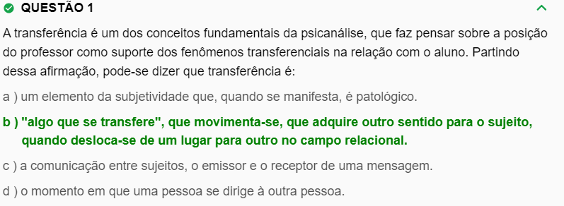 <p>QUESTÃO 1 ^ A transferência é um dos conceitos fundamentais da psicanálise, que faz pensar sobre a posição do professor como suporte dos fenômenos transferenciais na relação com o aluno. Partindo dessa afirmação, pode-se dizer que transferência é: a) um elemento da subjetividade que, quando se manifesta, é patológico. b ) "algo que se transfere", que movimenta-se, que adquire outro sentido para sujeito, quando desloca-se de um lugar para outro no campo relacional. c) a comunicação entre sujeitos, emissor e o receptor de uma mensagem. d ) momento em que uma pessoa se dirige à outra pessoa.</p>