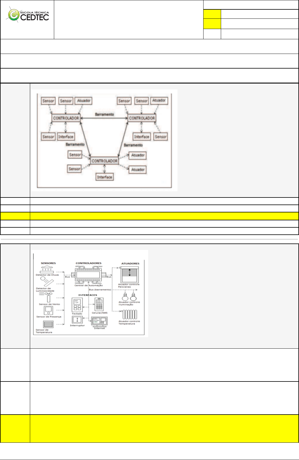 Pincel Atômico - 19/08/2024 07:27:27 1/2 NILTON THIAGO MARTINS CASTRO Exercício Caminho do Conhecimento - Etapa 8 (26234) Atividade finalizada em 19/08/2024 06:35:36 (2500507 / 1) LEGENDA Resposta correta na questão # Resposta correta - Questão Anulada X Resposta selecionada pelo Aluno Disciplina: AUTOMAÇÃO ELÉTRICA [1029164] - Avaliação com 4 questões, com o peso total de 6,50 pontos [capítulos - 114] Turma: Curso Técnico: Eletrotécnica - Grupo: EAD - 02/24 - EAD ELE [113127] Aluno(a): 91166439 - NILTON THIAGO MARTINS CASTRO - Respondeu 4 questões corretas, obtendo um total de 6,50 pontos como nota [350018_1801 21] Questão 001 Dada a figura abaixo Temos uma descrição de um tipo de arquitetura usada na automação residencial: Arquitetura mista Arquitetura radial X Arquitetura descentralizada Arquitetura tradicional Arquitetura centralizada [350018_1801 25] Questão 002 Dada a figura abaixo Analise: A Figura apresenta um exemplo de como os elementos básicos se comunicam. A esquerda dessa figura estão os sensores, que as vezes encaminham as informações sobre algum evento como chuva, mas vento não. Aos controladores (ao centro) e estes por sua vez acionam os ativadores (à direita), de acordo com a tarefa não programada para aquele evento, como por exemplo abrir a persiana. As interfaces (interruptores, celular etc.) se conectam diretamente aos controladores de forma a permitir que o usuário visualize as informações e interaja com o sistema de automação. Diversos barramentos podem ser utilizados na comunicação entre os elementos básicos (rede elétrica, telefônica etc.). A Figura apresenta um exemplo de como os elementos básicos se comunicam. A esquerda dessa figura estão os sensores, que encaminham as informações sobre algum evento como chuva, mas vento não. Aos controladores (ao centro) e estes por sua vez acionam os ativadores (à direita), de acordo com a tarefa não programada para aquele evento, como por exemplo abrir a persiana. As interfaces (interruptores, celular etc.) se conectam indiretamente aos controladores de forma a permitir que o usuário visualize parcialmente as informações e não interaja com o sistema de automação. Diversos barramentos podem ser utilizados na comunicação entre os elementos básicos (rede elétrica, telefônica etc.). X A Figura apresenta um exemplo de como os elementos básicos se comunicam. A esquerda dessa figura estão os sensores, que encaminham as informações sobre algum evento chuva, vento. Aos controladores (ao centro) e estes por sua vez acionam os ativadores (à direita), de acordo com a tarefa programada para aquele evento, como por exemplo abrir a persiana. As interfaces (interruptores, celular etc.) se conectam diretamente aos controladores de forma a permitir que o usuário visualize as informações e interaja com o sistema de automação. Diversos barramentos podem ser utilizados na comunicação entre os elementos básicos (rede elétrica, telefônica etc.). Pincel Atômico - 19/08/2024 07:27:27 2/2 A Figura apresenta um exemplo de como os elementos básicos se comunicam. A esquerda dessa figura estão os sensores, que as vezes encaminham as informações sobre algum evento como chuva, mas vento não. Aos controladores (ao centro) e estes por sua vez acionam os ativadores (à direita), de acordo com a tarefa não programada para aquele evento, como por exemplo abrir a persiana. As interfaces (interruptores, celular etc.) se conectam indiretamente aos controladores de forma a permitir que o usuário visualize as informações e interaja com o sistema de automação. Diversos barramentos podem ser utilizados na comunicação entre os elementos básicos (rede elétrica, telefônica etc.). A Figura apresenta um exemplo de como os elementos básicos se comunicam. A esquerda dessa figura estão os sensores, que as vezes encaminham as informações sobre algum evento como chuva, mas vento não. Aos controladores (ao centro) e estes por sua vez acionam os ativadores (à direita), de acordo com a tarefa programada para aquele evento, como por exemplo abrir a persiana. As interfaces (interruptores, celular etc.) se conectam diretamente aos controladores de forma a permitir que o usuário visualize as informações e interaja com o sistema de automação. Diversos barramentos podem ser utilizados na comunicação entre os elementos básicos (rede elétrica, telefônica etc.). [350021_1801 19] Questão 003 Dado a figura abaixo. Este quadro se refere a: Principais características da infraestrutura dos ambientes prediais atuais sem automação e com as novas tendencias da Domótica. Principais características da infraestrutura dos ambientes comerciais atuais sem automação e com as novas tendencias da Domótica. X Principais características da infraestrutura dos ambientes domésticos atuais sem automação e com as novas tendencias da Domótica. Principais características da infraestrutura dos ambientes navais atuais sem automação e com as novas tendencias da Domótica. Principais características da infraestrutura dos ambientes comerciais atuais sem automação e com as novas tendencias da engenharia civil. [350019_1801 15] Questão 004 É o conjunto de serviços proporcionados por sistemas tecnológicos integrados como o melhor meio de satisfazer as necessidades básicas de segurança, comunicação, gestão energética e conforto de uma habitação, tal definição se trata de: X Automação residencial Eletrônica residencial Instrumentação residencial Automação industrial Automação comercial