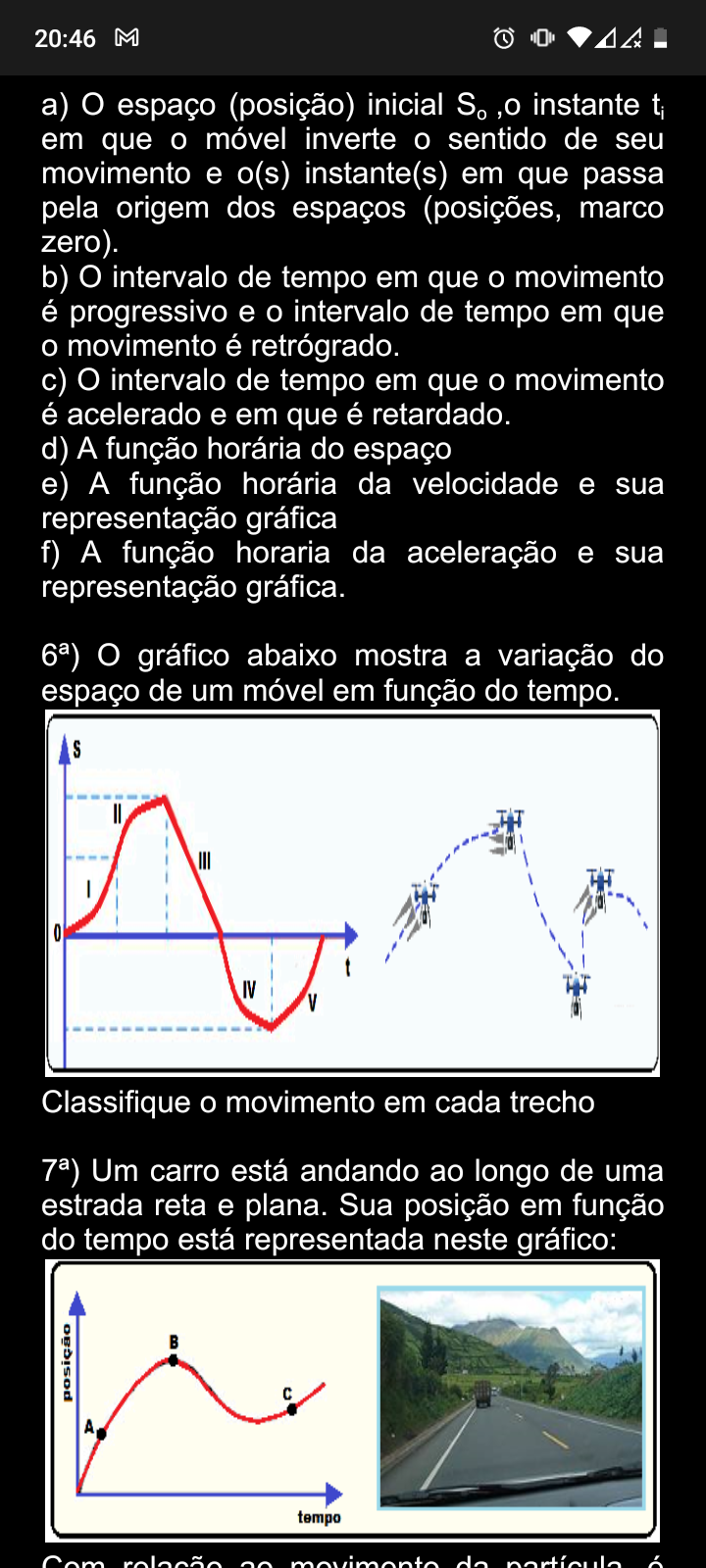 <p>20:46 M a) O espaço (posição) inicial ,0 instante t em que O móvel inverte sentido de seu movimento e o(s) instante(s) em que passa pela origem dos espaços (posições, marco zero). b) O intervalo de tempo em que movimento é progressivo e intervalo de tempo em que movimento é retrógrado. c) O intervalo de tempo em que movimento é acelerado e em que é retardado. d) A função horária do espaço e) A função horária da velocidade e sua representação gráfica f) A função horaria da aceleração e sua representação gráfica. O gráfico abaixo mostra a variação do espaço de um móvel em função do tempo. S III 0 IV V Classifique movimento em cada trecho Um carro está andando ao longo de uma estrada reta e plana. Sua posição em função do tempo está representada neste gráfico: C A tempo Com do</p>