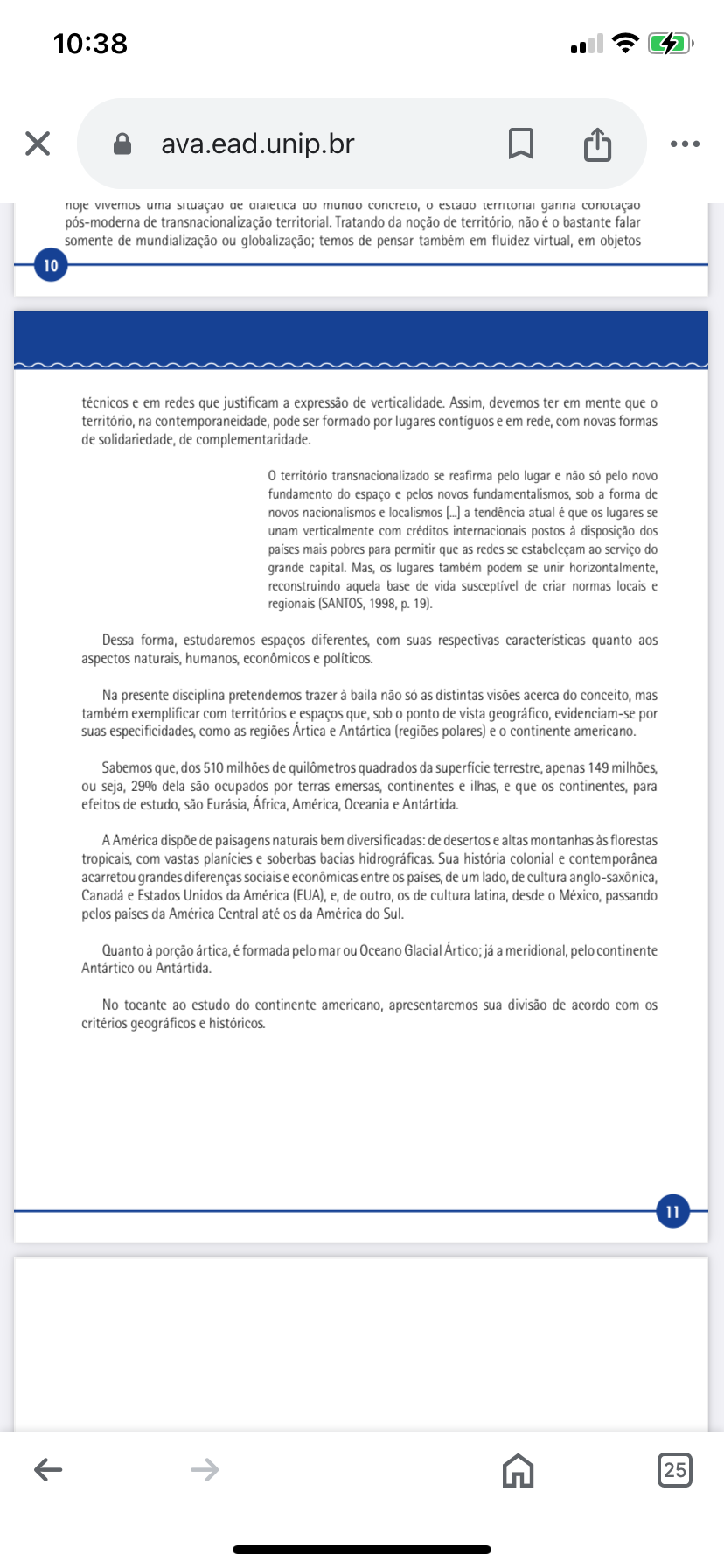 <p>10:38 X ava.ead.unip.br vivemos uma mungo concreto, territorial ganna pós-moderna de transnacionalização territorial. Tratando da noção de território, não é 0 bastante falar somente de mundialização ou globalização; temos de pensar também em fluidez virtual, em objetos 10 técnicos e em redes que justificam a expressão de Assim, devemos ter em mente que 0 território, na contemporaneidade, pode ser formado por lugares contiguos e em rede, com novas formas de solidariedade, de complementaridade. 0 território transnacionalizado se reafirma pelo lugar e não só pelo novo fundamento do espaço e pelos novos fundamentalismos, sob a forma de novos nacionalismos e localismos [...] a tendência atual é que os lugares se unam verticalmente com créditos internacionais postos à disposição dos países mais pobres para permitir que as redes se estabeleçam ao serviço do grande capital. Mas, os lugares também podem se unir horizontalmente, reconstruindo aquela base de vida susceptivel de criar normas locais e regionais (SANTOS, 1998, p. 19). Dessa forma, estudaremos espaços diferentes, com suas respectivas quanto aos aspectos naturais, humanos, econômicos e políticos. Na presente disciplina pretendemos trazer à baila não só as distintas visões acerca do conceito, mas também exemplificar com territórios e espaços que, sob ponto de vista evidenciam-se por suas especificidades, como as regiões Ártica e Antártica (regiões polares) e 0 continente americano. Sabemos que, dos 510 milhões de quilômetros quadrados da terrestre, apenas 149 milhões, ou seja, 29% dela são ocupados por terras emersas, continentes e ilhas, e que os continentes, para efeitos de estudo, são Eurásia, Oceania e A America dispõe de paisagens naturais bem diversificadas: de desertos e altas montanhas às florestas tropicais, com vastas planicies e soberbas bacias Sua história colonial e contemporânea acarretou grandes diferenças sociais e econômicas entre os países, de um lado, de cultura anglo-saxônica, e Estados Unidos da (EUA), e, de outro, os de cultura latina, desde 0 passando pelos países da America Central até os da do Sul. Quanto à porção ártica, é formada pelo mar ou Oceano Glacial Ártico; já a meridional, pelo continente Antártico ou No tocante ao estudo do continente americano, apresentaremos sua divisão de acordo com os critérios e 11 25</p>
