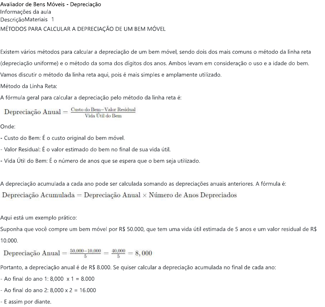 <p>Avaliador de Bens Móveis - Depreciação Informações da aula DescriçãoMateriais 1 MÉTODOS PARA CALCULAR A DEPRECIAÇÃO DE UM BEM MÓVEL Existem vários métodos para calcular a depreciação de um bem móvel, sendo dois dos mais comuns o método da linha reta (depreciação uniforme) e o método da soma dos dígitos dos anos. Ambos levam em consideração o uso e a idade do bem. Vamos discutir o método da linha reta aqui, pois é mais simples e amplamente utilizado. Método da Linha Reta: A fórmula geral para calcular a depreciação pelo método da linha reta é: Depreciação Anual - Custo do Bem-Valor Residual Vida Util do Bem Onde: - Custo do Bem: É o custo original do bem móvel. - Valor Residual: É o valor estimado do bem no final de sua vida útil. - Vida Útil do Bem: É o número de anos que se espera que o bem seja utilizado. A depreciação acumulada a cada ano pode ser calculada somando as depreciações anuais anteriores. A fórmula é: Depreciação Acumulada - Depreciação Anual Número de Anos Depreciados Aqui está um exemplo prático: Suponha que você compre um bem móvel por R$ 50.000, que tem uma vida útil estimada de 5 anos e um valor residual de R$ 10.000. Depreciação Anual - - 40,000 5 8,000 Portanto, a depreciação anual é de R$ 8.000. Se quiser calcular a depreciação acumulada no final de cada ano: - Ao final do ano - Ao final do ano E assim por diante.</p>