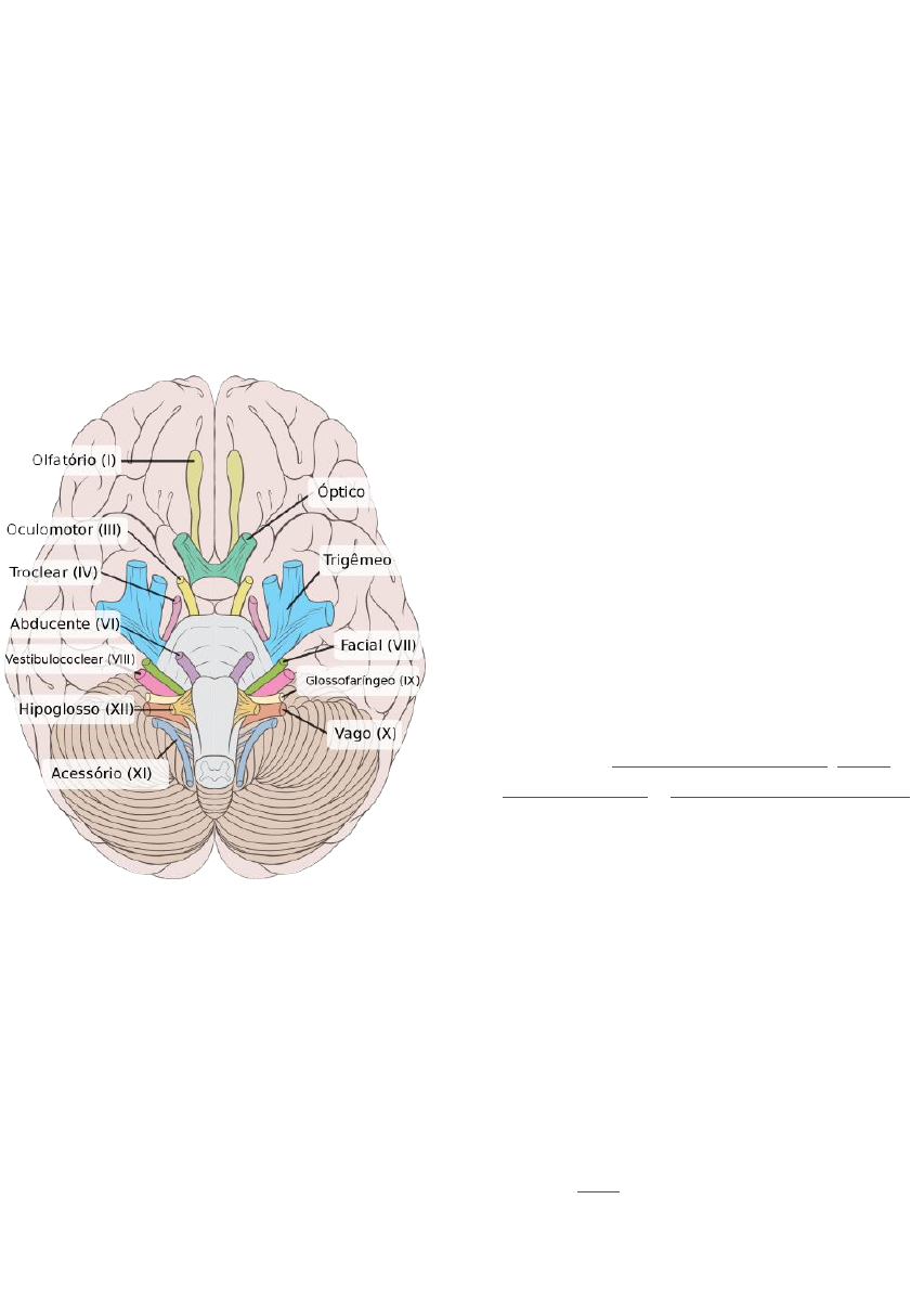 <p>Nervos Cranianos</p><p>Os nervos podem ser classificados em</p><p>cranianos e espinhais. Os nervos cranianos</p><p>são aqueles que possuem ligação com o</p><p>encéfalo, enquanto os espinhais se conectam</p><p>à medula espinhal.</p><p>Os nervos cranianos são aqueles que</p><p>possuem ligação com o encéfalo. A maioria</p><p>desses nervos sai da região denominada</p><p>tronco encefálico, nos seres humanos,</p><p>observamos 12 pares de nervos cranianos.</p><p>Nervo olfatório I</p><p>O nervo olfatório é exclusivamente sensitivo</p><p>e está relacionado com a condução dos</p><p>impulsos olfatórios, ou seja, com a nossa</p><p>capacidade de perceber os cheiros. As</p><p>terminações desse nervo situam-se na</p><p>mucosa nasal.</p><p>Nervo óptico II</p><p>São compostos por um grosso feixe de</p><p>fibras nervosas originadas na região da</p><p>retina que penetram no crânio através do</p><p>canal óptico. Possuem função estritamente</p><p>sensitiva.</p><p>Nervo oculomotor III</p><p>É o principal nervo motor que inerva o olho.</p><p>Ele se origina do mesencéfalo e deixa o</p><p>crânio através da fissura orbital (orbitária)</p><p>superior, para entrar na órbita, onde ele vai</p><p>permitir a movimentação dos olhos, a</p><p>constrição da pupila (miose) e a acomodação</p><p>do cristalino.</p><p>Nervo troclear IV</p><p>Ele se origina do mesencéfalo e entra na</p><p>órbita através da fissura orbital (orbitária)</p><p>superior. O troclear inerva um músculo ocular,</p><p>tendo função, portanto, na movimentação</p><p>ocular.</p><p>Nervo trigêmeo V</p><p>É um nervo misto, que contém tanto fibras</p><p>viscerais especiais, quanto fibras somáticas</p><p>gerais. Estas fibras se originam do tronco</p><p>cerebral, formando o gânglio trigeminal,</p><p>próximo ao ápice da parte petrosa do osso</p><p>temporal. O nervo trigêmeo se divide em</p><p>três ramos: nervo oftálmico (NC V1), nervo</p><p>maxilar (NC V2) e nervo mandibular (NC V3).</p><p>Cada um deles deixa o crânio por uma</p><p>abertura diferente: o oftálmico sai através da</p><p>fissura orbital (orbitária) superior, o maxilar</p><p>através do forame (buraco) redondo e o</p><p>mandibular se exterioriza através do forame</p><p>(buraco) oval.</p><p>Todos os três ramos do nervo trigêmeo</p><p>inervam sensorialmente a pele da face. As</p><p>áreas de inervação cutânea (dermátomos)</p><p>são as seguintes: nervo oftálmico</p><p>(dermátomo NC V1) supre o couro cabeludo,</p><p>órbita e nariz; o nervo maxilar (dermátomo</p><p>NV V2) supre a região zigomática e lábio</p><p>superior enquanto o nervo mandibular</p><p>(dermátomo NC V3) inerva a pele da boca,</p><p>lábio inferior e pele da região mandibular.</p><p>https://www.kenhub.com/pt/library/anatomia/pupila</p><p>https://www.kenhub.com/pt/library/anatomia/ramo-oftalmico-do-nervo-trigemeo-v1</p><p>https://www.kenhub.com/pt/library/anatomia/ramo-maxilar-do-nervo-trigemeo</p><p>https://www.kenhub.com/pt/library/anatomia/ramo-maxilar-do-nervo-trigemeo</p><p>https://www.kenhub.com/pt/library/anatomia/ramo-mandibular-do-nervo-trigemeo</p><p>https://www.kenhub.com/pt/library/anatomia/forame-oval</p><p>https://www.kenhub.com/pt/library/anatomia/forame-oval</p><p>https://www.kenhub.com/pt/library/anatomia/cavidade-nasal</p><p>Nervo abducente VI</p><p>É um nervo eferente somático geral, que</p><p>inerva o músculo reto lateral (extraocular). Ele</p><p>se origina do tronco encefálico e sai do</p><p>crânio através da fissura orbital (orbitária)</p><p>superior.</p><p>Nervo facial VII</p><p>É um nervo misto, apresentando uma</p><p>porção motora e outra sensorial. A porção</p><p>motora é representada pelo nervo facial</p><p>propriamente dito, relacionada com as</p><p>expressões faciais, secreção de saliva e</p><p>produção de lágrimas.</p><p>O nervo facial proporciona a inervação</p><p>motora para todos os músculos cutâneos da</p><p>cabeça e pescoço.</p><p>A porção sensorial recebe o nome de</p><p>nervo intermédio e atua na sensibilidade</p><p>muscular e gustatória.</p><p>Nervo vestibulococlear VIII</p><p>Ele é formado de duas partes: o nervo</p><p>vestibular e o nervo coclear. Eles fazem</p><p>sinapse com seus respectivos núcleos no</p><p>tronco encefálico. O componente coclear</p><p>permite a audição, enquanto que a parte</p><p>vestibular medeia o equilíbrio e o movimento.</p><p>No fundo do meato acústico interno, as duas</p><p>partes se unem e entram no crânio através</p><p>do meato acústico interno.</p><p>Nervo glossofaríngeo IX</p><p>Ele se origina do tronco encefálico e deixa o</p><p>crânio através do forame (buraco) jugular. Ele</p><p>permite a deglutição, salivação e sensação</p><p>gustativa, assim como sensações viscerais e</p><p>gerais da cavidade oral.</p><p>Nervo vago X</p><p>É um nervo multimodal, que se origina de</p><p>múltiplos nervos no tronco encefálico e deixa</p><p>o crânio através do forame (buraco) jugular.</p><p>Ele é o nervo craniano mais longo e o único</p><p>a deixar a região da cabeça e do pescoço.</p><p>Ele vai até as cavidades torácica e abdominal,</p><p>levando inervação parassimpática para os</p><p>órgãos viscerais.</p><p>O nervo vago tem dois gânglios, chamados</p><p>de gânglio superior do nervo vago e gânglio</p><p>inferior do nervo vago (gânglio nodoso). O</p><p>primeiro fornece fibras para a função</p><p>sensorial geral, enquanto o último dá origem</p><p>a fibras sensoriais especiais e viscerais. O</p><p>nervo vago controla um grande número de</p><p>funções, incluindo secreção glandular,</p><p>peristalse, fonação, gustação, sensação</p><p>visceral e geral da cabeça, tórax e abdome</p><p>(abdómen).</p><p>Nervo acessório XI</p><p>É um nervo eferente que se origina do</p><p>tronco encefálico e da medula espinhal. Ele</p><p>sai do crânio através do forame (buraco)</p><p>jugular e permite a fonação e movimentos</p><p>da cabeça
