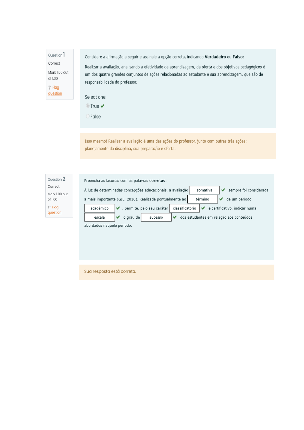 <p>Question 1 Considere a afirmação a seguir e assinale a opção correta, indicando Verdadeiro ou Falso: Correct Realizar a avaliação, analisando a efetividade da aprendizagem, da oferta e dos objetivos pedagógicos é Mark 1.00 out um dos quatro grandes conjuntos de ações relacionadas ao estudante e sua aprendizagem, que são de of 1.00 responsabilidade do professor. P Flag question Select one: True False Isso mesmo! Realizar a avaliação é uma das ações do professor, junto com outras três ações: planejamento da disciplina, sua preparação e oferta. Question 2 Preencha as lacunas com as palavras corretas: Correct À luz de determinadas concepções educacionais, a avaliação somativa sempre foi considerada Mark 1.00 out of a mais importante (GIL, 2010). Realizada pontualmente ao término de um período P Flag acadêmico permite, pelo seu caráter classificatório e certificativo, indicar numa question escala o grau de sucesso dos estudantes em relação aos conteúdos abordados naquele período. Sua resposta está correta.</p><p>Question 3 Considere as afirmações a seguir: Correct I. Antigamente, conceito de avaliação formativa era mais complexo do ponto de vista teórico, tratando- Mark 1.00 out se mais de uma avaliação interativa, centrada nos processos cognitivos dos alunos e associada aos of processos de feedback, de regulação, de autoavaliação e de autorregulação das aprendizagens. P Flag question II. Para Perrenoud (1998, p.22) o importante é que a avaliação formativa seja pensada no "quadro de uma abordagem global dos processos de regulação das aprendizagens". III. Cauley e McMillan (2010) identificam a avaliação formativa como uma das maneiras mais poderosas de a motivação e o desempenho dos alunos, indicando que a relação positiva entre a aplicação da avaliação formativa em sala de aula e a motivação e o desempenho dos alunos nas avaliações tem sido evidenciada em inúmeras pesquisas. De acordo com as afirmações acima, escolha a opção VERDADEIRA: Select one: Apenas II e III são corretas. É isso mesmo! As afirmações II e III são, de fato, corretas. Apenas I e II são corretas. Apenas II é correta. Todas as afirmações são corretas. Question 4 Considere as seguintes afirmações sobre o feedback das avaliações formativas e assinale a alternativa Correct CORRETA: Mark 1.00 out of 1.00 Select one: P Flag o feedback das avaliações formativas deve reduzir as comparações sociais e, Isso mesmo! question em vez disso, enfatizar progresso de cada aluno em direção ao alcance das Esta afirmação é suas metas de aprendizagem. verdadeira. Na modalidade de avaliação formativa, feedback não funciona como uma estratégia eficiente de motivação e regulação da aprendizagem, e tem pouco sucesso na condução da autonomia e do desenvolvimento de competências por parte do aluno. o professor e os alunos devem atuar em direções diferentes, no tocante à avaliação formativa: professores atuam para desenvolvimento de metas orientadas para o desempenho e os alunos, orientados para metas de domínio. o feedback das avaliações formativas não tem impacto com o tipo de metas de realização que os alunos internalizam: metas de desempenho e metas de domínio.</p><p>Question 5 Preencha as lacunas com as palavras corretas: Correct Professores eficazes usam a avaliação formativa durante as instruções para Mark 1.00 out of 1.00 identificar mal-entendidos específicos dos alunos, fornecer feedback para ajudá-los a corrigir P Flag seus erros e identificar e implementar novas ações instrucionais que ajudam a melhorar 0 question aprendizado dos alunos. Esse tipo de procedimento é um processo planejado realizado principalmente por meio de observações informais e perguntas orais feitas aos alunos enquanto conteúdo está sendo ensinado ou revisado. Pergunta 6 Sobre o feedback formativo, selecione a opção INCORRETA : Correto Marque 1,00 Selecione uma: de 1,00 Pode ser definida como informação comunicada ao estudante com o propósito de modificar seu P Pergunta pensamento ou comportamento, tendo por objetivo a melhoria da aprendizagem. de bandeira Permite a comparação do desempenho real do estudante na tarefa com algum padrão previamente previsto de desempenho. Deve abordar a solução da resposta do aluno a Isso mesmo! Ao contrário da afirmação, o um problema ou tarefa, evitando erros específicos feedback formativo deve apontar erros e e conceitos mal compreendidos. conceitos mal compreendidos. Tem o potencial de melhorar significativamente os resultados da aprendizagem do aluno, desde que realizado da maneira correta.</p><p>Question 7 Faça a associação entre o QUE FAZER e QUE EVITAR no feedback formativo. Correct Mark 1.00 out Fazer comparações com outros estudantes. QUE EVITAR of P Flag Ter como foco do feedback a tarefa, não o estudante. QUE FAZER question Dar feedback longo e com muitas informações. QUE EVITAR Reduzir a incerteza entre o desempenho do estudante e os objetivos da tarefa. QUE FAZER Oferecer feedback motivador. QUE FAZER Usar muitos elogios. QUE EVITAR a atividade do aluno com seu feedback. QUE EVITAR Ser claro e específico no feedback . QUE FAZER</p><p>Question 8 Preencha as lacunas com as palavras corretas: Correct Estudantes que apresentam alto desempenho podem se beneficiar com um feedback Mark 1.00 out of 1.00 facilitador / que traz dicas, pistas e sugestões. Além disso, para esses alunos, 0 feedback Flag de verificação que indica se a tarefa está correta ou não, fornece 0 nível de informação mais útil question nesse propósito. Já para estudantes que apresentam baixo desempenho, 0 feedback diretivo pode ser mais útil do que 0 facilitador, uma vez que alunos em dificuldades precisam de apoio e orientação explícita durante 0 processo de aprendizagem. Question 9 Considere as afirmações a seguir: Correct I. o feedback formativo pode ser usado para promover os processos de