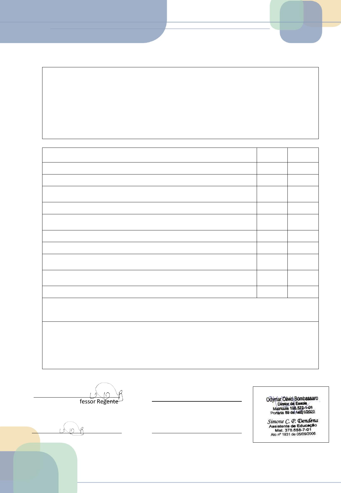 <p>Nome do(a) estagiário(a): Márcia Ana Bosio</p><p>Semestre: 4º</p><p>Professor Regente (Supervisor de Campo): Odymar Olivio Bombassaro</p><p>Escola: E.E.B Prof. Salustiano Antonio Cabreira</p><p>Série: 3º Turno: Matutino ( X ) Educação Infantil ( ) Ensino Fundamental ( ) Ensino Médio</p><p>Número total de aulas ministradas pelo estagiário: 150h aulas</p><p>Datas das Aulas ministradas: 12/05/2024, 15/05/2024, 16/05/2024, 17/05/2024, 18/05/2024 e</p><p>19/05/2024.</p><p>FICHA DE AVALIAÇÃO</p><p>Critérios para apreciação das aulas ATENDE</p><p>NÃO</p><p>ATENDE</p><p>1. Clareza e relevância dos objetivos. X</p><p>2. Conhecimento do conteúdo aplicado. X</p><p>3. Abordagem dos conceitos quanto à correta aplicação, profundidade e</p><p>adequação à idade/série.</p><p>X</p><p>4. Atividades realizadas (variedade / adequação / andamento). X</p><p>5. Recursos materiais adequados (mapas, filmes, músicas, imagens, textos,</p><p>etc.) ao assunto abordado.</p><p>X</p><p>6. Interação com alunos. X</p><p>7. Adequação da linguagem (pronúncia correta, clara, fluente). X</p><p>8. Manejo de classe, disciplina, engajamento (inclusive quando surgem</p><p>situações imprevistas).</p><p>X</p><p>9. Organização sequencial de atividades (inclusive com a estimativa de</p><p>tempo).</p><p>X</p><p>10.Postura coerente com a que se espera de um futuro profissional da área. X</p><p>Critérios de aprovação:</p><p>O aluno precisa atender, no mínimo, seis (6) critérios.</p><p>Observações do Supervisor de Campo:</p><p>Assinaturas:</p><p>Assinatura do Professor Regente</p><p>(Supervisor de Campo)</p><p>Assinado digitalmente na ZapSign por</p><p>Odymar Olivio Bombassaro</p><p>Data: 20/05/2024 11:21:48.694 (UTC-0300)</p><p>Assinatura do Polo de Apoio Presencial</p><p>Assinado digitalmente na ZapSign por</p><p>Odymar Olivio Bombassaro</p><p>Data: 20/05/2024 11:21:48.694 (UTC-0300)</p><p>Assinatura do Diretor da Escola Assinatura do(a) Estagiário(a)</p><p>ZapSign 9a457376-4137-4f2d-9827-1938c9a7a17e. Documento assinado eletronicamente, conforme MP 2.200-2/2001 e Lei 14.063/2020.</p><p>CARIMBO DA ESCOLA</p><p>Relatório de Assinaturas Datas e horários em UTC-0300 (America/Sao_Paulo)</p><p>Última atualização em 20 Maio 2024, 11:21</p><p>avaliação de estágio.pdf</p><p>Documento número 9a457376-4137-4f2d-9827-1938c9a7a17e</p><p>Assinaturas</p><p>Odymar Olivio Bombassaro</p><p>Assinou</p><p>Pontos de autenticação:</p><p>Assinatura na tela</p><p>IP: 45.160.247.67</p><p>Dispositivo: Mozilla/5.0 (Windows NT 10.0; Win64; x64)</p><p>AppleWebKit/537.36 (KHTML, like Gecko) Chrome/124.0.0.0</p><p>Safari/537.36</p><p>Data e hora: Maio 20, 2024, 11:21:48</p><p>E-mail: annaveiga2@gmail.com</p><p>Telefone: + 5549999458445</p><p>ZapSign Token: 21e9633d-****-****-****-d0f3ca771fbc</p><p>Assinatura de Odymar Olivio Bombassaro</p><p>Hash do documento original (SHA256):</p><p>2013323691f890a0bf04e9d49a91d601f38494bcddb937b1c924960da4e748ba</p><p>Verificador de Autenticidade:</p><p>https://app.zapsign.com.br/verificar/autenticidade?doc=9a457376-4137-4f2d-9827-</p><p>1938c9a7a17e</p><p>Integridade do documento certificada digitalmente pela ZapSign (ICP-Brasil):</p><p>https://zapsign.com.br/validacao-documento/</p><p>Este Log é exclusivo e parte integrante do documento de identificação 9a457376-4137-4f2d-9827-1938c9a7a17e,</p><p>conforme os Termos de Uso da ZapSign em zapsign.com.br</p><p>ZapSign 9a457376-4137-4f2d-9827-1938c9a7a17e. Documento assinado eletronicamente, conforme MP 2.200-2/2001 e Lei 14.063/2020.</p><p>https://zapsign.com.br/?utm_source=zapsign&utm_medium=product&utm_campaign=signature-report-footer-logo</p><p>https://app.zapsign.com.br/verificar/autenticidade?doc=9a457376-4137-4f2d-9827-1938c9a7a17e</p><p>mailto:annaveiga2@gmail.com</p><p>https://app.zapsign.com.br/verificar/autenticidade?doc=9a457376-4137-4f2d-9827-1938c9a7a17e</p><p>https://app.zapsign.com.br/verificar/autenticidade?doc=9a457376-4137-4f2d-9827-1938c9a7a17e</p><p>https://zapsign.com.br/validacao-documento/</p><p>https://zapsign.com.br/?utm_source=zapsign&utm_medium=product&utm_campaign=signature-report-footer</p><p>https://zapsign.com.br/?utm_source=zapsign&utm_medium=product&utm_campaign=signature-report-header-logo</p><p>https://app.zapsign.com.br/verificar/autenticidade?doc=9a457376-4137-4f2d-9827-1938c9a7a17e</p><p>https://zapsign.com.br/validacao-documento/#validacao-iti</p><p>https://app.zapsign.com.br/verificar/autenticidade?doc=9a457376-4137-4f2d-9827-1938c9a7a17e</p>