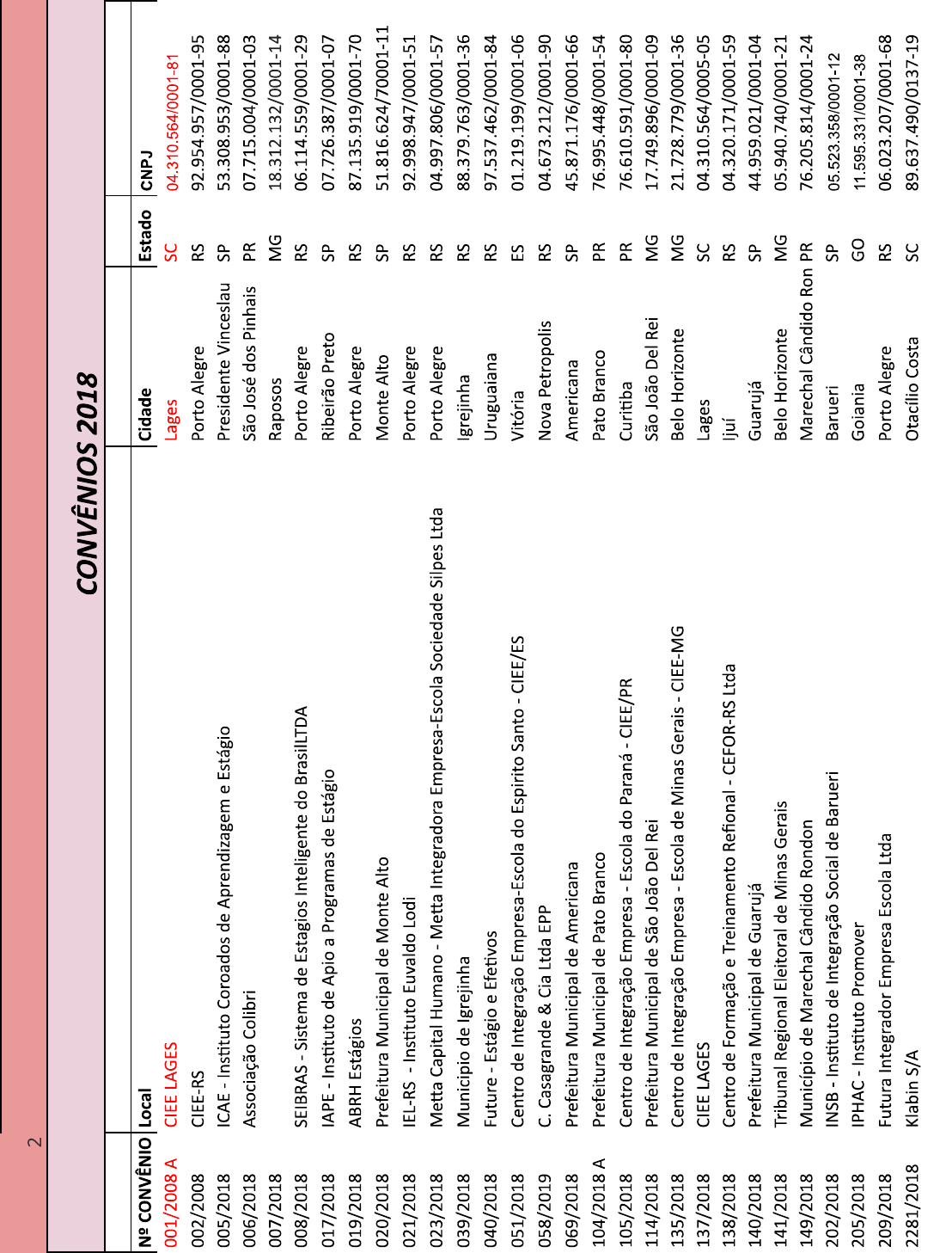 <p>2 CONVÊNIOS 2018 CONVÊNIO Local Cidade Estado CNPJ 001/2008 A CIEE LAGES Lages SC 04.310.564/0001-81 002/2008 CIEE-RS Porto Alegre RS 92.954.957/0001-95 005/2018 ICAE Instituto Coroados de Aprendizagem e Estágio Presidente Vinceslau SP 53.308.953/0001-88 006/2018 Associação Colibri São José dos Pinhais PR 07.715.004/0001-03 007/2018 Raposos MG 18.312.132/0001-14 008/2018 SEIBRAS Sistema de Estagios Inteligente do BrasilLTDA Porto Alegre RS 06.114.559/0001-29 017/2018 IAPE - Instituto de Apio a Programas de Estágio Ribeirão Preto SP 07.726.387/0001-07 019/2018 ABRH Estágios Porto Alegre RS 87.135.919/0001-70 020/2018 Prefeitura Municipal de Monte Alto Monte Alto SP 51.816.624/70001-11 021/2018 IEL-RS Instituto Euvaldo Lodi Porto Alegre RS 92.998.947/0001-51 023/2018 Metta Capital Humano Metta Integradora Empresa-Escola Sociedade Silpes Ltda Porto Alegre RS 04.997.806/0001-57 039/2018 Municipio de Igrejinha Igrejinha RS 88.379.763/0001-36 040/2018 Future Estágio e Efetivos Uruguaiana RS 97.537.462/0001-84 051/2018 Centro de Integração Empresa-Escola do Espirito Santo CIEE/ES Vitória ES 01.219.199/0001-06 058/2019 C. Casagrande & Cia Ltda EPP Nova Petropolis RS 04.673.212/0001-90 069/2018 Prefeitura Municipal de Americana Americana SP 45.871.176/0001-66 104/2018 A Prefeitura Municipal de Pato Branco Pato Branco PR 76.995.448/0001-54 105/2018 Centro de Integração Empresa Escola do Paraná CIEE/PR Curitiba PR 76.610.591/0001-80 114/2018 Prefeitura Municipal de São João Del Rei São João Del Rei MG 17.749.896/0001-09 135/2018 Centro de Integração Empresa Escola de Minas Gerais CIEE-MG Belo Horizonte MG 21.728.779/0001-36 137/2018 CIEE LAGES Lages SC 04.310.564/0005-05 138/2018 Centro de Formação e Treinamento Refional CEFOR-RS Ltda RS 04.320.171/0001-59 140/2018 Prefeitura Municipal de Guarujá SP 44.959.021/0001-04 141/2018 Tribunal Regional Eleitoral de Minas Gerais Belo Horizonte MG 05.940.740/0001-21 149/2018 Município de Marechal Cândido Rondon Marechal Cândido Ron PR 76.205.814/0001-24 202/2018 INSB - Instituto de Integração Social de Barueri Barueri SP 05.523.358/0001-12 205/2018 IPHAC - Instituto Promover Goiania GO 11.595.331/0001-38 209/2018 Futura Integrador Empresa Escola Ltda Porto Alegre RS 06.023.207/0001-68 2281/2018 Klabin S/A Otacílio Costa SC 89.637.490/0137-19</p><p>CONVÊNIOS 2019 001/2019 CIEE - Centro de Integração Empresa Escola Goias GO 61.600.839/0009-02 002/2019 Prefeitura Municipal de Bituruna Bituruna PR 81.648.859/0001-03 006/2019 CIDE Capacitação Inserção e Desenvolvimento Salvador BA 03.935.660/0001-52 007/2019 Anchieta e Kuntz Ltda- Empregos pela Net Santo Ângelo RS 15.225.566/0001-99 013/2019 Estado de Santa Catarina Poder Judiciário Florianópolis SC 83.845.701/0001-59 020/2019 Fundação Movimento Universitário de Desenvolvimento Econômico e Social - MUDES Rio de Janeiro RJ 33.663.519/0001-09 021/2019 CIEE Centro de Integração Empresa Escola Goiânia GO 61.600.839/0009-02 031/2019 Núcleo Brasileiro de Estágios Ltda -NUBE São Paulo SP 02.704.396/0001-83 088/2019 Habil Gestão de Pessoas Ltda Estância Velha RS 09.046.812/0001-42 124/2019 Agência Talentos do Sul Porto Alegre RS 14.960.479/0001-12 267/2019 Integrar - Associação de Integração Empresa Escola Porto Alegre RS 05.449.614/0001-79 279/2019 Centro de Desenvolvimento Profissional CEDEP Cajamar SP 07.232.304/0001-23 357/2019 Instituto Euvaldo Lodi - IEL Rio Branco AC 02.373.341/0001-38 398/2019 Prefeitura Municipal de Claro de Poções Claro dos Poções MG 21.498.274/0001-22 444/2019 Fundação de Assistência Social de Ponta Grossa Ponta Grossa PR 76.175.884/0001-87 497/2019 IEL - Núcleo Regional RR Boa vista RR 02.777.249/0001-33 534/2019 A Associação de Pais e Amigos dos São João del Rei MG 17.750.092/0001-20 536/2019 A Escola Municipal do Bom Menino São Francisco MG 01.886.923/0001-55 709/2019 Agente de integração BANESTAGIO Bauer Banco de Estágios e Processamentos de Dados Porto Alegre RS 91.316.224/0001-62 738/2019 Prefeitura Municipal de Balneario Camburiú Balneário Camburiú SC 83.102.285/0001-07 924/2019 GHB Gestão de Pessoas e Estágios RS 09.524.278/0001-32 965/2019 Centro de Integração Empresa Escola / CIEE - PE Recife PE 10.998.292/0001-57 981/2019 Prefeitura Municipal de Buenópolis Buenópolis MG 17.694.852/0001-29 988/2019 Moreno Pagan & Cia Ltda Interhativa Recursos Humanos Cascavel PR 05.695.512/0001-33 1038/2019 Estagio Sul Recursos Humanos Porto Alegre RS 05.555.705/0001-99 1055/2019 Associação da Vila Militar - AVM Curitiba PR 76.713.593/0001-03 1069/2019 Múnicipio de Nova Friburgo Nova Friburgo RJ 28.606.630/0001-23 1078/2019 Instituto Euvaldo Lodi Nucleo Regional do Parana Curitiba PR 75.047.399/0001-65 1081/2019 Fundação Ulbra - FULBRA Canoas RS 03.286.299/0001-80 1119/2019 Instituto Euvaldo Lodi - NR/MS Campo Grande MS 15.411.218/0001-06 1160/2019 Instituto Euvaldo Lodi - IEL-ES Vitória ES 28.164.937/0001-11</p><p>1195/2019 Centro Educacional Dom LTDA Erechim RS 01.512.312/0001-47 1370/2019 Prefeitura Municipal de Tijucas do Sul Tijucas do Sul PR 76.105.584/0001-21 1490/2019 ADM2 Estratégias Empresariais Ltda Pelotas RS 09.240.886/0001-15 1492/2019 Zuna Tratamento de Dados Online Ltda Z - ESTAGIOS Porto Alegre RS 31.726.192/0001-41 1515/2019 Skill Consultoria e Recursos Humanos LTDA Campo Grande MS 09.581.972/0001-91 1574/2019 Município de Erechim Erechim RS 87.613.477/0001-20 1621/2019 Escola Chave do Saber São João Del Rei MG 32.788.172/0001-68 1623/2019 Colégio Pirâmide Lauro de Freitas BA 04.247.021/0001-67 1750/2019 Município de Campo Grande Campo Grande MS 03.501.509/0001-06 1789/2019 Centro Municipal de Educação Infantil- Cmei Dona Brechó Paranaiguara GO 09.135.201/0001-70 1838/2019 Município de Francisco Dumont Francisco Dumont MG 16.828.488/0001-88 1928/2019 PRO-SERVI Serviços de Assessoria e Seleção de Pessoal Ltda São Leopoldo RS 91.099.986/0001-54 2008/2019 Municipio de Londrina Lo