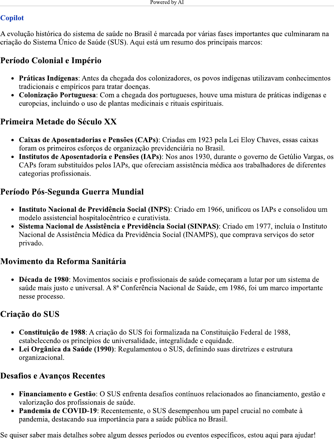 <p>Powered by AI Copilot A evolução histórica do sistema de saúde no Brasil é marcada por várias fases importantes que culminaram na criação do Sistema Único de Saúde (SUS). Aqui está um resumo dos principais marcos: Período Colonial e Império Práticas Indígenas: Antes da chegada dos colonizadores, os povos indígenas utilizavam conhecimentos tradicionais e empíricos para tratar doenças. Colonização Portuguesa: Com a chegada dos portugueses, houve uma mistura de práticas indígenas e europeias, incluindo o uso de plantas medicinais e rituais espirituais. Primeira Metade do Século XX Caixas de Aposentadorias e Pensões (CAPs): Criadas em 1923 pela Lei Eloy Chaves, essas caixas foram os primeiros esforços de organização previdenciária no Brasil. Institutos de Aposentadoria e Pensões (IAPs): Nos anos 1930, durante o governo de Getúlio Vargas, os CAPs foram substituídos pelos IAPs, que ofereciam assistência médica aos trabalhadores de diferentes categorias profissionais. Período Pós-Segunda Guerra Mundial Instituto Nacional de Previdência Social (INPS): Criado em 1966, unificou os IAPs e consolidou um modelo assistencial hospitalocêntrico e curativista. Sistema Nacional de Assistência e Previdência Social (SINPAS): Criado em 1977, incluía o Instituto Nacional de Assistência Médica da Previdência Social (INAMPS), que comprava serviços do setor privado. Movimento da Reforma Sanitária Década de 1980: Movimentos sociais e profissionais de saúde começaram a lutar por um sistema de saúde mais justo e universal. A Conferência Nacional de Saúde, em 1986, foi um marco importante nesse processo. Criação do SUS Constituição de 1988: A criação do SUS foi formalizada na Constituição Federal de 1988, estabelecendo os princípios de universalidade. integralidade e equidade. Lei Orgânica da Saúde (1990): Regulamentou o SUS, definindo suas diretrizes e estrutura organizacional. Desafios e Avanços Recentes Financiamento e Gestão: O SUS enfrenta desafios contínuos relacionados ao financiamento, gestão e valorização dos profissionais de saúde. Pandemia de COVID-19: Recentemente, o SUS desempenhou um papel crucial no combate à pandemia, destacando sua importância para a saúde pública no Brasil. Se quiser saber mais detalhes sobre algum desses períodos ou eventos específicos, estou aqui para ajudar!</p>