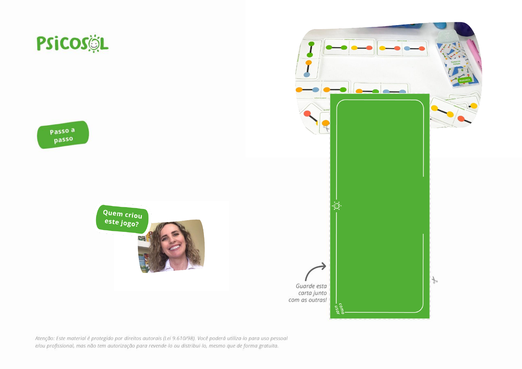 <p>Solange Moll</p><p>Psicopedagoga, Psicomotricista</p><p>Relacional, Mediadora do PEI</p><p>(Programa de Enriquecimento</p><p>Instrumental) e Professora</p><p>Alfabetizadora. É produtora</p><p>de conteúdo e responsável</p><p>pela Psicosol.</p><p>página 1 de 5</p><p>D</p><p>istrib</p><p>u</p><p>ir a</p><p>m</p><p>e</p><p>sm</p><p>a</p><p>q</p><p>u</p><p>a</p><p>n</p><p>tid</p><p>a</p><p>d</p><p>e</p><p>d</p><p>e</p><p>p</p><p>e</p><p>ça</p><p>s e</p><p>n</p><p>tre o</p><p>s jo</p><p>ga</p><p>d</p><p>o</p><p>re</p><p>s.</p><p>O</p><p>s jo</p><p>ga</p><p>d</p><p>o</p><p>res d</p><p>e</p><p>verã</p><p>o</p><p>u</p><p>n</p><p>ir a</p><p>s figu</p><p>ra</p><p>s q</p><p>u</p><p>e te</p><p>n</p><p>h</p><p>a</p><p>m</p><p>a</p><p>s m</p><p>e</p><p>sm</p><p>a</p><p>s se</p><p>q</p><p>u</p><p>ên</p><p>cia</p><p>s d</p><p>e</p><p>co</p><p>res.</p><p>G</p><p>a</p><p>n</p><p>h</p><p>a</p><p>o</p><p>jo</p><p>go</p><p>q</p><p>u</p><p>em</p><p>fo</p><p>r o</p><p>p</p><p>rim</p><p>eiro</p><p>a</p><p>fica</p><p>r se</p><p>m</p><p>n</p><p>e</p><p>n</p><p>h</p><p>u</p><p>m</p><p>a</p><p>p</p><p>e</p><p>ça</p><p>.</p><p>D</p><p>o</p><p>m</p><p>in</p><p>ó</p><p>d</p><p>e</p><p>A</p><p>te</p><p>n</p><p>çã</p><p>o</p><p>Dominó de Atenção</p><p>1 Imprima todas as páginas (esta</p><p>inclusive se você quiser</p><p>guardar a carta com a</p><p>sugestão de uso!);</p><p>3 Para a embalagem (página 2),</p><p>também dobre nas linhas</p><p>contínuas e cole nas áreas</p><p>hachuradas.</p><p>2 Recorte nas linhas</p><p>tracejadas;</p><p>4 Para aumentar a durabilidade das</p><p>cartas você pode aplicar papel</p><p>Contact ou plastificar!</p><p>D</p><p>o</p><p>m</p><p>in</p><p>ó</p><p>d</p><p>e</p><p>A</p><p>te</p><p>n</p><p>çã</p><p>o</p><p>D</p><p>o</p><p>m</p><p>in</p><p>ó</p><p>d</p><p>e</p><p>A</p><p>te</p><p>n</p><p>çã</p><p>o</p><p>C</p><p>o</p><p>m</p><p>o</p><p>u</p><p>sa</p><p>r:</p><p>D</p><p>is</p><p>tr</p><p>ib</p><p>u</p><p>ir</p><p>a</p><p>m</p><p>es</p><p>m</p><p>a</p><p>q</p><p>u</p><p>a</p><p>n</p><p>ti</p><p>d</p><p>a</p><p>d</p><p>e</p><p>d</p><p>e</p><p>p</p><p>e</p><p>ça</p><p>s</p><p>e</p><p>n</p><p>tr</p><p>e</p><p>o</p><p>s</p><p>jo</p><p>ga</p><p>d</p><p>o</p><p>re</p><p>s.</p><p>O</p><p>s</p><p>jo</p><p>ga</p><p>d</p><p>o</p><p>re</p><p>s</p><p>d</p><p>ev</p><p>e</p><p>rã</p><p>o</p><p>u</p><p>n</p><p>ir</p><p>a</p><p>s</p><p>fi</p><p>gu</p><p>ra</p><p>s</p><p>q</p><p>u</p><p>e</p><p>te</p><p>n</p><p>h</p><p>a</p><p>m</p><p>a</p><p>s</p><p>m</p><p>es</p><p>m</p><p>a</p><p>s</p><p>se</p><p>q</p><p>u</p><p>ên</p><p>ci</p><p>a</p><p>s</p><p>d</p><p>e</p><p>co</p><p>re</p><p>s.</p><p>G</p><p>a</p><p>n</p><p>h</p><p>a</p><p>o</p><p>jo</p><p>go</p><p>q</p><p>u</p><p>em</p><p>fo</p><p>r</p><p>o</p><p>p</p><p>ri</p><p>m</p><p>ei</p><p>ro</p><p>a</p><p>fi</p><p>ca</p><p>rs</p><p>e</p><p>m</p><p>n</p><p>e</p><p>n</p><p>h</p><p>u</p><p>m</p><p>a</p><p>p</p><p>e</p><p>ça</p><p>.</p><p>Dominó de</p><p>Atenção</p><p>página 2 de 5</p><p>w</p><p>w</p><p>w</p><p>.p</p><p>sico</p><p>so</p><p>l.co</p><p>m</p><p>B</p><p>om</p><p>Jogo!</p><p>XX XX</p><p>XX XX</p><p>XX XX</p><p>Jogo</p><p>________________</p><p>Jogo</p><p>________________</p><p>Jogo</p><p>________________</p><p>Jogo</p><p>________________</p><p>Jogo</p><p>________________</p><p>Jogo</p><p>________________</p><p>Dominó de Atenção Dominó de Atenção</p><p>DOMINÓ DE ATENÇÃO DOMINÓ DE ATENÇÃO</p><p>Dominó de Atenção página 3 de 5</p><p>DOMINÓ DE ATENÇÃO DOMINÓ DE ATENÇÃO</p><p>DOMINÓ DE ATENÇÃO DOMINÓ DE ATENÇÃO</p><p>XX XX</p><p>XX XX</p><p>XX XX</p><p>Jogo</p><p>________________</p><p>Jogo</p><p>________________</p><p>Jogo</p><p>________________</p><p>Jogo</p><p>________________</p><p>Jogo</p><p>________________</p><p>Jogo</p><p>________________</p><p>Dominó de Atenção Dominó de Atenção</p><p>DOMINÓ DE ATENÇÃO DOMINÓ DE ATENÇÃO</p><p>Dominó de Atenção página 4 de 5</p><p>DOMINÓ DE ATENÇÃO DOMINÓ DE ATENÇÃO</p><p>DOMINÓ DE ATENÇÃO DOMINÓ DE ATENÇÃO</p><p>XX XX</p><p>XX XX</p><p>XX XX</p><p>Jogo</p><p>________________</p><p>Jogo</p><p>________________</p><p>Jogo</p><p>________________</p><p>Jogo</p><p>________________</p><p>Jogo</p><p>________________</p><p>Jogo</p><p>________________</p><p>Dominó de Atenção Dominó de Atenção</p><p>DOMINÓ DE ATENÇÃO DOMINÓ DE ATENÇÃO</p><p>Dominó de Atenção página 5 de 5</p><p>DOMINÓ DE ATENÇÃO DOMINÓ DE ATENÇÃO</p><p>DOMINÓ DE ATENÇÃO DOMINÓ DE ATENÇÃO</p>
