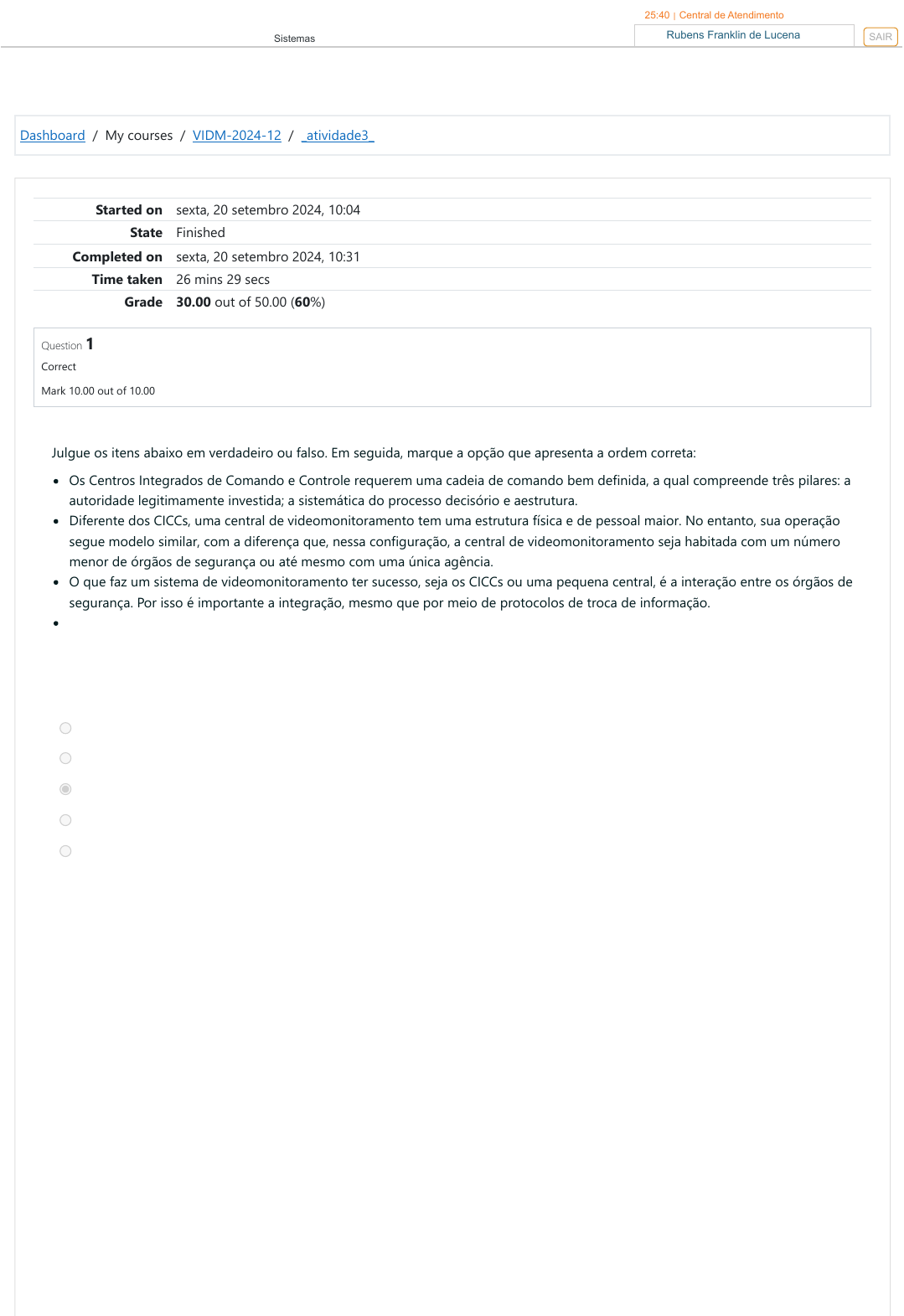 <p>Dashboard / My courses / VIDM-2024-12 / _atividade3_</p><p>Started on sexta, 20 setembro 2024, 10:04</p><p>State Finished</p><p>Completed on sexta, 20 setembro 2024, 10:31</p><p>Time taken 26 mins 29 secs</p><p>Grade 30.00 out of 50.00 (60%)</p><p>Question 1</p><p>Correct</p><p>Mark 10.00 out of 10.00</p><p>Julgue os itens abaixo em verdadeiro ou falso. Em seguida, marque a opção que apresenta a ordem correta:</p><p>Os Centros Integrados de Comando e Controle requerem uma cadeia de comando bem definida, a qual compreende três pilares: a</p><p>autoridade legitimamente investida; a sistemática do processo decisório e aestrutura.</p><p>Diferente dos CICCs, uma central de videomonitoramento tem uma estrutura física e de pessoal maior. No entanto, sua operação</p><p>segue modelo similar, com a diferença que, nessa configuração, a central de videomonitoramento seja habitada com um número</p><p>menor de órgãos de segurança ou até mesmo com uma única agência.</p><p>O que faz um sistema de videomonitoramento ter sucesso, seja os CICCs ou uma pequena central, é a interação entre os órgãos de</p><p>segurança. Por isso é importante a integração, mesmo que por meio de protocolos de troca de informação.</p><p>Vários órgãos de segurança com interesse em informações em tempo real dividem o espaço de uma central de</p><p>videomonitoramento com visão geral de todas as situações que ocorrem na cidade e interagem entre si, por meios de</p><p>procedimentos e protocolos já definidos.</p><p>Select one:</p><p>a. V-V-V-F</p><p>b. F-V-V-V</p><p>c. V-F-V-V</p><p>d. F-V-F-V</p><p>e. V-V-V-V</p><p>Sua resposta está correta.</p><p>The correct answer is:</p><p>V-F-V-V</p><p>25:40 | Central de Atendimento</p><p>SAIRRubens Franklin de LucenaSistemas</p><p>20/09/2024, 10:31 _atividade3_: Attempt review</p><p>https://eadsegen.mj.gov.br/mod/quiz/review.php?attempt=3384386&cmid=16027 1/3</p><p>https://eadsegen.mj.gov.br/my/</p><p>https://eadsegen.mj.gov.br/course/view.php?id=3290</p><p>https://eadsegen.mj.gov.br/mod/quiz/view.php?id=16027</p><p>https://seguranca.sinesp.gov.br/sinesp-seguranca/logout?goto=null</p><p>https://seguranca.sinesp.gov.br/sinesp-seguranca/private/welcome.jsf</p><p>https://seguranca.sinesp.gov.br/sinesp-seguranca/private/welcome.jsf</p><p>https://seguranca.sinesp.gov.br/sinesp-seguranca/private/welcome.jsf</p><p>https://seguranca.sinesp.gov.br/sinesp-seguranca/private/welcome.jsf</p><p>Question 2</p><p>Correct</p><p>Mark 10.00 out of 10.00</p><p>Question 3</p><p>Incorrect</p><p>Mark 0.00 out of 10.00</p><p>Considerando o uso das câmeras da central de videomonitoramento, em uma operação de trânsito, julgue os itens a seguir em</p><p>verdadeiros (V) ou falsos (F); em seguida marque a sequência correta:</p><p>Controlar o fluxo de veículos.</p><p>Controlar a direção dos veículos.</p><p>Controlar o tempo dos semáforos.</p><p>Controlar infrações de trânsito.</p><p>Select one:</p><p>a. F-F-V-V</p><p>b. V-F-F-V</p><p>c. V-V-F-F</p><p>d. V-F-V-V</p><p>e. V-V-V-V</p><p>Sua resposta está correta.</p><p>The correct answer is: V-F-V-V</p><p>Os requisitos para o registro das informações do sistema de videomonitoramento apresentadas no curso são:</p><p>Select one:</p><p>a. A data do fato, a equipe e o relatório detalhado.</p><p>b. O tempo de armazenamento das imagens, registro das informações e a exportação das imagens.</p><p>c. O tempo de armazenamento das imagens, registro das informações e o relatório detalhado.</p><p>d. Exportação das imagens, registro das informações e a data do fato.</p><p>Sua resposta está incorreta.</p><p>The correct answer is: O tempo de armazenamento das imagens, registro das informações e a exportação das imagens.</p><p>25:40 | Central de Atendimento</p><p>SAIRRubens Franklin de LucenaSistemas</p><p>20/09/2024, 10:31 _atividade3_: Attempt review</p><p>https://eadsegen.mj.gov.br/mod/quiz/review.php?attempt=3384386&cmid=16027 2/3</p><p>https://seguranca.sinesp.gov.br/sinesp-seguranca/logout?goto=null</p><p>https://seguranca.sinesp.gov.br/sinesp-seguranca/private/welcome.jsf</p><p>https://seguranca.sinesp.gov.br/sinesp-seguranca/private/welcome.jsf</p><p>https://seguranca.sinesp.gov.br/sinesp-seguranca/private/welcome.jsf</p><p>https://seguranca.sinesp.gov.br/sinesp-seguranca/private/welcome.jsf</p><p>CORRETA</p><p>X</p><p>Question 4</p><p>Incorrect</p><p>Mark 0.00 out of 10.00</p><p>Question 5</p><p>Correct</p><p>Mark 10.00 out of 10.00</p><p>Qual o prazo ideal que o sistema de monitoramento deve armazenar as imagens?</p><p>Select one:</p><p>a. 30 dias para videomonitoramento e 90 dias para câmeras de OCR.</p><p>b. 30 dias para todas as imagens.</p><p>c. 30 dias para videomonitoramento e no mínimo seis meses para câmeras OCR.</p><p>d. 10 dias para videomonitoramento e seis meses para câmeras de OCR.</p><p>Sua resposta está incorreta.</p><p>The correct answer is: 30 dias para videomonitoramento e no mínimo seis meses para câmeras OCR.</p><p>O fornecimento de cópias de imagens da central de videomonitoramento está sujeito aos seguintes requisitos:</p><p>Select one:</p><p>a. Solicitação formal (ofício); a autorização; a identificação da imagem que foi disponibilizada (câmera, data, hora, dia e</p><p>tempo de gravação) e data e hora em que a cópia da imagem foi disponibilizada.</p><p></p><p>b. Solicitação informal do solicitante; a autorização do juiz da comarca; a identificação da imagem que foi disponibilizada</p><p>(câmera, data e hora) e data e hora em que a cópia da imagem foi disponibilizada.</p><p>c. Solicitação formal (ofício); a autorização do juiz da comarca; relatório detalhado; a identificação da imagem que foi</p><p>disponibilizada (câmera, data, hora, dia e tempo de gravação) e data em que a cópia da imagem foi disponibilizada.</p><p>d. Solicitação formal (boletim de ocorrência); a identificação da imagem que foi disponibilizada (câmera, data, hora, dia e te