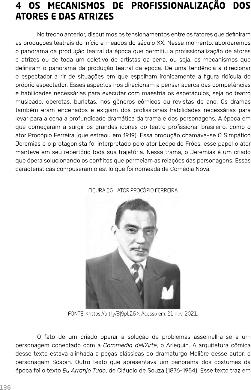 <p>4 os MECANISMOS DE PROFISSIONALIZAÇÃO DOS ATORES E DAS ATRIZES No trecho anterior, discutimos os tensionamentos entre os fatores que definiram as produções teatrais do início e meados do século XX. Nesse momento, abordaremos panorama da produção teatral da época que permitiu a profissionalização de atores e atrizes ou de toda um coletivo de artistas da cena, ou seja, os mecanismos que definiram o panorama da produção teatral da época. De uma tendência a direcionar espectador a rin de situações em que espelham ironicamente a figura ridícula do próprio espectador. Esses aspectos nos direcionam a pensar acerca das competências e habilidades necessárias para executar com maestria os espetáculos, seja no teatro musicado, operetas, burletas, nos gêneros cômicos ou revistas de ano. Os dramas também eram encenados e exigiam dos profissionais habilidades necessárias para levar para a cena a profundidade dramática da trama e dos personagens. A época em que começaram a surgir os grandes ícones do teatro profissional brasileiro, como Procópio Ferreira (que estreou em 1919). Essa produção chamava-se Simpático Jeremias e protagonista foi interpretado pelo lator Leopoldo Fróes, esse papel ator manteve em seu repertório toda sua trajetória. Nessa trama, Jeremias é um criado que ópera solucionando os conflitos que permeiam as relações das personagens. Essas características compuseram estilo que foi nomeada de Comédia Nova. FIGURA 26 - ATOR PROCÓPIO FERREIRA FONTE: <https://bit.ly/39pLZ6> Acesso em: 21 nov. 2021. O fato de um criado operar a solução de problemas assemelha-se a um personagem conectado com a Commedia dell'Arte, Arlequin. A arquitetura cômica desse texto estava alinhada a peças clássicas do dramaturgo Molière desse autor, personagem Scapin. Outro texto que apresentava um panorama dos costumes da época foi texto Eu Arranjo Tudo, de Cláudio de Souza (1876-1954). Esse texto traz em 136</p><p>sua narrativa as traquinagens de um personagem chamado Bernardo que é responsável por todas as tarefas de seu local de trabalho e passa a confundir as tarefas e acaba solucionando as confissões que surgem. Essa comédia estreou em 22 de novembro de 1915, no Teatro Trianon. protagonista desta comédia também conecta a tradição cômica brasileira com a Commédia dell'Arte nessa espécie de trapalhão inteligente. Diversos costumes da época eram postos em cena nessa trama. Teatro Profissional dos anos de 1920 aos anos de 1950 foi marcado pela maestria de profissionais que conseguiram grande prestígio e competições por atuações de destaque. Os astros e estrelas surgiram nessa época com suas atuações espetaculares que arrastavam multidões. A fama e idolatria de atores da época permeava as condições da profissionalização de atores e atrizes. Astro era uma palavra utilizada com frequência e possui vários significados, dependendo seus usos e contextos. Os atores e atrizes considerados astros ou estrelas de teatro ocupavam lugares de prestígio, com destaque para as figuras masculinas e as figuras femininas ainda eram associadas a objetos de desejo ou objetos sexuais de uma sociedade estruturalmente preconceituosa e machista. De um local de destaque, grandeza, ou tirania a uma acepção de figura pejorativa. Em astronomia astro é todo corpo celeste que possui luz própria. Nesse sentido, o astro estava associado a aquele ator ou atriz que obtivesse enorme destaque em suas atuações artísticas. Os astros e estrelas orbitavam em rotas de enorme fama e geralmente, buscavam manter seu sucesso em carreiras longas. A corrida para chegar ao destaque ou manter-se no foco da cena modernista com todas as pompas que um astro ou estrela idealizavam talvez fosse uma tarefa difícil e um preço alto a pagar. Essas duas palavras, estrela e astro, são importantes para pensar a profissionalização de artista da cena. Uma constituição de atores e atrizes que reunissem habilidades múltiplas, com capacidade de atuar, dançar, cantar e com capacidade para atuar em comédias e dramas com versatilidade. Há uma certa subordinação a toda essa iluminação atribuída a um profissional da cena. Um artista da cena busca relacionar- se com seu público de maneira a cativar popularidade e influenciar gostos. Um astro poderia ser associado ao elemento sol, no sistema solar, anuncia metaforicamente que o ou atriz carrega em sua aura segredo mágico da atuação e da cena, sua personalidade estaria a habilidade de comunicação com seu público, de modo que deveria deter importantes elementos geradores de influência. A qualificação de um profissional da cena deveria abarcar domínio técnico e maestria em sua arte. ator e atriz dependia ainda de outros profissionais para que sua arte pudesse ser realizada. Escolas de arte dramática ofereciam cursos com apurado técnico, mas a maior escola de formação de profissionais da cena era a prática cotidiana, palco habitado pela cena teatral e os processos criativos ou produzir a apresentação de determinado espetáculo em determinado espaço. Neste sentido, a prática teatral seria ainda uma escola ou espaço para a formação e qualificação dos profissionais da cena. Assim, o astro e a estrela eram suportados por uma equipe preparada para que a encenação pudesse ocorrer com sucesso. astro e a estela de teatro "[...] além de 137</p><p>sujeito da cena e em cena, senhor de uma forma de expressão encantadora que a plateia adorava acompanhar, o astro era líder de sua categoria, artífice de sua companhia, mago da bilheteria, empresário e forjador do próprio ofício" (BRANDÃO, 2012, p. 459). astro e a estrela eram considerados artistas que construíam uma promissora carreira e conseguiam viver de sua arte estabelecendo relações entre as obras de arte teatrais e seu público. Os principais grandes astros e estrelas desse período foram João Caetano, Estela Sezefreda, Gabriela da Cunha, Eugênia Câmara, A