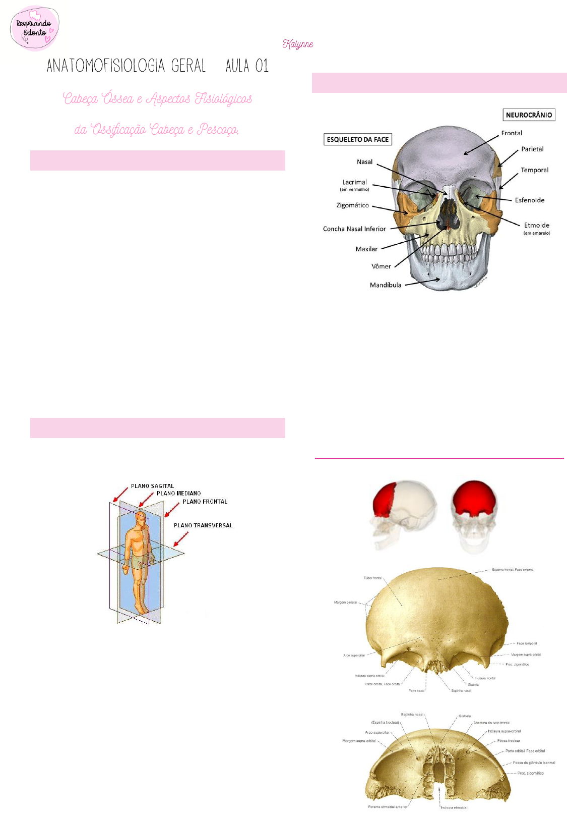 <p>P2-ODONTOLOGIA UNINASSAU-RN - @respirando_odonto</p><p>–</p><p>INTRODUÇÃO:</p><p>• Anatomia: ramo da ciência que se ocupa do estudo da</p><p>morfologia, da estrutura e da arquitetura do corpo</p><p>humano.</p><p>• Fisiologia: ciência que estuda os processos ou funções</p><p>dos organismos vivos.</p><p>• A anatomia é um símbolo de um mistério que, durante</p><p>toda a história intrigou questionamentos daqueles que,</p><p>incessantemente, ansiavam por descobrir o que se</p><p>esconde sob o manto o qual chamamos de pele.</p><p>• Séc. II: proibiu-se o uso de cadáver humano e</p><p>predominou a prática de dissecação de animais. Galeno</p><p>trabalhou como médico, a escola de Galeno reinou por</p><p>toda a Europa.</p><p>• Em 1543, foi produzido o primeiro livro Atlas de</p><p>Anatomia- “De Humani Corports Fabrica” por Andreas</p><p>Vesaltus.</p><p>• Atualmente, a disciplina de anatomia é de caráter</p><p>obrigatório para todos os cursos da área da saúde.</p><p>PLANOS:</p><p>• Superfície imaginária que atravessa o corpo humano</p><p>secciona o corpo, tornando possível a sua observação.</p><p>OS 14 OSSOS QUE FORMAM O ESQUELETO DA FACE:</p><p>• Divisão em pares e ímpares:</p><p>1. Osso nasal (2)</p><p>2. Cornetos nasais inferior (2)</p><p>3. Osso lacrimal (2)</p><p>4. Osso zigomático (2)</p><p>5. Osso palatino (2)</p><p>6. Maxila (2)</p><p>7. Vômer</p><p>8. Mandíbula</p><p>CRÂNIO VISTA FRONTAL:</p><p>• Frontal: o osso frontal forma, essencialmente, a fronte</p><p>(testa); o teto da cavidade nasal e as órbitas.</p><p>• Borda supra-orbitária: uma borda definida acima de cada</p><p>órbita.</p><p>• Arco superciliar: proeminência que se superpõe ao seio</p><p>frontal.</p><p>O osso frontal articula-se com doze ossos: Esfenoide, Etmoide,</p><p>Parietais (2), Nasais (2), Maxilares (2), Lacrimais (2) e zigomáticos</p><p>(2).</p><p>OSSO FRONTAL:</p><p>P2-ODONTOLOGIA UNINASSAU-RN - @respirando_odonto</p><p>MAXILA:</p><p>• Maxilas: direita e esquerda, ocupam quase toda a face.</p><p>Cada maxila apresenta um corpo, um processo frontal,</p><p>que se articula com o osso frontal, um processo palatino</p><p>que, juntamente com a lâmina horizontal do osso</p><p>palatino, forma o palato duro; processo alveolar, em</p><p>cujos alvéolos estão implantados os dentes, e um</p><p>processo zigomático.</p><p>OSSOS NASAIS:</p><p>• É formado por dois pequenos ossos oblongos, colocados</p><p>lado a lado, que, juntos, forma a asa do nariz. Situam-se</p><p>na parte central e superior da face, junto à parte superior</p><p>das maxilas.</p><p>OSSO VÔMER:</p><p>• Forma o septo nasal posteriormente. É um osso</p><p>ímpar dentro da cavidade nasal. Encontra-se na</p><p>parte inferior e posterior da cavidade nasal e</p><p>forma parte do septo.</p><p>OSSO LACRIMAL:</p><p>• Osso par situado na parte anterior da face interna das</p><p>cavidades orbitárias. Constituído por uma pequena</p><p>lâmina óssea. Formado praticamente por tecido</p><p>compacto.</p><p>OSSO ZIGOMÁTICO:</p><p>• É um osso par do crânio humano que forma parte da</p><p>órbita ocular e é também conhecido como o “osso da</p><p>bochecha” ou “maçã do rosto”.</p><p>OSSO PALATINO:</p><p>• Está situado atrás da cavidade nasal entre o maxila e o</p><p>esfenoide. Ele contribui na formação das paredes de três</p><p>cavidades: nasal, fissura labiopalatal e da fissura orbital</p><p>inferior.</p><p>P2-ODONTOLOGIA UNINASSAU-RN - @respirando_odonto</p><p>CAVIDADE ORBITÁRIA:</p><p>CALOTA- VISTA SUPERIOR:</p><p>BASE-VISTA SUPERIOR E INFERIOR:</p><p>ESFENÓIDE:</p><p>• Processos clinóides anteriores e posteriores, fossa</p><p>hipofisária, forame redondo, forame oval, forame</p><p>espinhoso, canal óptico.</p><p>ETMÓIDE:</p><p>• Possui uma lâmina horizontal, a lâmina crivosa, uma</p><p>lâmina perpendicular, que, juntamente com o vômer,</p><p>constitui o septo nasal ósseo.</p><p>CALOTA-VISTA POSTERIOR:</p><p>P2-ODONTOLOGIA UNINASSAU-RN - @respirando_odonto</p><p>OSSO TEMPORAL:</p><p>• Direito e esquerdo, constituem as paredes laterais do</p><p>crânio; são formados por uma porção escamosa, que se</p><p>articula com o parietal na sutura escamosa, uma porção</p><p>mastoidea (processo mastoide), porção timpânica e</p><p>porção petrosa.</p><p>MANDÍBULA:</p><p>• É um osso ímpar e móvel, articula-se com os temporais</p><p>através dos côndilos, formando a articulação têmporo-</p><p>mandibular. A mandíbula consta de um corpo, em forma</p><p>de ferradura, que apresenta os alvéolos da arcada</p><p>dentária inferior, e dois ramos, continuação do corpo</p><p>numa angulação conhecida como ângulo da mandíbula.</p><p>O ramo da mandíbula apresenta um côndilo, que se</p><p>articula com a fossa mandibular do temporal, e um</p><p>processo coronóide; entre o côndilo e o processo</p><p>coronóide há uma incisura mandibular.</p><p>OSSO HIÓIDE:</p><p>• É um osso pequeno em forma de ferradura, é singular,</p><p>pois é a única parte do esqueleto que não se liga</p><p>diretamente a nenhum outro osso. Localizado na região</p><p>do pescoço, debaixo da mandíbula, ligado ao processo</p><p>estiloide do osso temporal pelos músculos estilohióides e</p><p>por ligamentos. O osso hióide tem: um corpo, dois cornos</p><p>menores e dois cornos maiores. O osso hióide sustenta a</p><p>língua e proporciona inserção para alguns de seus</p><p>ligamentos.</p><p>REFEREÊNCIAS:</p><p>Aula teórica de Anatomofisiologia Geral.</p><p>Faculdade Maurício de Nassau, odontologia, 2019.</p>