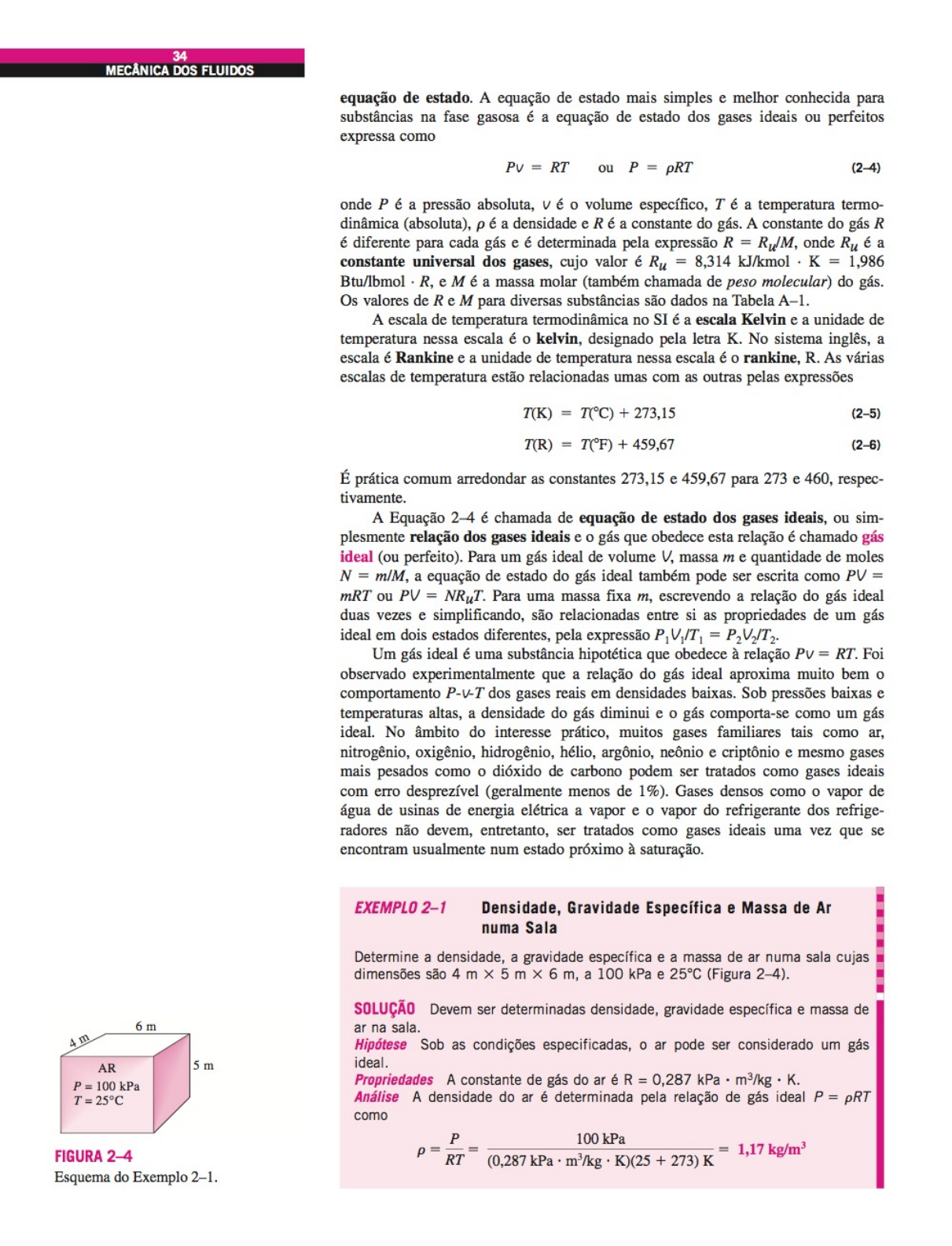 <p>34 MECÂNICA DOS FLUIDOS equação de estado. A equação de estado mais simples e melhor conhecida para substâncias na fase gasosa é a equação de estado dos gases ideais ou perfeitos expressa como ou P pRT (2-4) onde P é a pressão absoluta, é o volume específico, T é a temperatura termo- dinâmica (absoluta), p é a densidade e R é a constante do gás. A constante do gás R é diferente para cada gás e é determinada pela expressão R = onde Ru é a constante universal dos gases, cujo valor é Ru = 8,314 kJ/kmol K = 1,986 Btu/lbmol R, e M é a massa molar (também chamada de peso molecular) do gás. Os valores de R e M para diversas substâncias são dados na Tabela A-1. A escala de temperatura termodinâmica no SI é a escala Kelvin e a unidade de temperatura nessa escala é o kelvin, designado pela letra K. No sistema inglês, a escala é Rankine e a unidade de temperatura nessa escala é o rankine, R. As várias escalas de temperatura estão relacionadas umas com as outras pelas expressões (2-5) T(R) (2-6) É prática comum arredondar as constantes 273,15 e 459,67 para 273 e 460, respec- tivamente. A Equação 2-4 é chamada de equação de estado dos gases ideais, ou sim- plesmente relação dos gases ideais e o gás que obedece esta relação é chamado gás ideal (ou perfeito). Para um gás ideal de volume V, massa m e quantidade de moles N = m/M, a equação de estado do gás ideal também pode ser escrita como PV = mRT ou PV = Para uma massa fixa m. escrevendo a relação do gás ideal duas vezes e simplificando, são relacionadas entre si as propriedades de um gás ideal em dois estados diferentes, pela expressão Um gás ideal é uma substância hipotética que obedece à relação Pv RT. Foi observado experimentalmente que a relação do gás ideal aproxima muito bem o comportamento P-v-T dos gases reais em densidades baixas. Sob pressões baixas e temperaturas altas, a densidade do gás diminui e o gás comporta-se como um gás ideal. No âmbito do interesse prático, muitos gases familiares tais como ar, nitrogênio, oxigênio, hidrogênio, hélio, e criptônio e mesmo gases mais pesados como o dióxido de carbono podem ser tratados como gases ideais com erro desprezível (geralmente menos de 1%). Gases densos como o vapor de água de usinas de energia elétrica a vapor e o vapor do refrigerante dos refrige- radores não devem, entretanto, ser tratados como gases ideais uma vez que se encontram usualmente num estado próximo à saturação. EXEMPLO 2-1 Densidade, Gravidade Específica e Massa de Ar numa Sala Determine a densidade, a gravidade específica e a massa de numa sala cujas dimensões a 100 kPa e 25°C (Figura 2-4). SOLUÇÃO Devem ser determinadas densidade, gravidade específica e massa de 6 m ar na sala. m Hipótese Sob as condições especificadas, o pode ser considerado um gás AR ideal. P = 100 kPa Propriedades A constante de gás do é R = 0,287 K. T 25°C Análise A densidade do ar é determinada pela relação de gás ideal como P 100 kPa p = FIGURA 2-4 Esquema do Exemplo 2-1.</p><p>35 CAPÍTULO 2 Então, a gravidade específica do torna-se 0,00117 1000 Finalmente, o volume e a massa de na sala são Discussão Observe que convertemos a temperatura em °C para a unidade K antes de usá-la na relação do gás ideal. 2-3 PRESSÃO DE VAPOR E CAVITAÇÃO Está bem estabelecido que temperatura e pressão são propriedades dependentes para substâncias puras durante os processos de mudança de fase e há uma corres- pondência biunívoca entre temperaturas e pressões. Sob dada pressão, a temperatura em que uma substância pura muda de fase é chamada de temperatura de satu- ração De maneira semelhante, numa dada temperatura, a pressão sob a qual uma substância pura muda de fase é denominada pressão de saturação Sob uma pressão absoluta de 1 atmosfera (1 atm ou 101,325 kPa), por exemplo, a tem- peratura de saturação da água é 100°C. Reciprocamente, a uma temperatura de 100°C, a pressão de saturação da água é 1 atm. A pressão de vapor de uma substância pura é definida como a pressão exercida por seu vapor em equilíbrio de fase com seu líquido numa dada tempe- ratura. é uma propriedade da substância pura e é idêntica à pressão de saturação do líquido Devemos ter cuidado para não confundir pressão de vapor com pressão parcial. A pressão parcial é definida como a pressão de um gás ou vapor numa mistura com outros gases. Por exemplo, an atmosférico é uma mis- tura de an seco e vapor de água, e a pressão atmosférica é a soma da pressão parcial do seco e da pressão parcial do vapor de água. A pressão parcial do vapor de água constitui uma pequena fração da pressão atmosférica (geralmente abaixo de 3%) visto que o contém mais nitrogênio e oxigênio. A pressão parcial de um vapor deve ser menor ou igual à pressão de vapor se não houver líquido presente. TABELA 2-2 Entretanto, quando ambos, vapor e líquido, estão presentes e o sistema está em Pressão de saturação (ou de vapor) equilíbrio, a pressão parcial do vapor deve ser igual à pressão de vapor e o sistema é da água a várias temperaturas dito saturado. A taxa de evaporação de corpos de água abertos, tais como lagos, é Pressão de controlada pela diferença entre a pressão de vapor e a pressão parcial. Por exemplo, Temperatura Saturação a pressão de vapor da água a 20°C é 2,34 kPa. Portanto, um balde de água a 20°C T, °C kPa deixado em um compartimento com ar seco sob 1 atm continuará a evaporar até que -10 0,260 uma de duas coisas aconteça: a água evapora completamente (não há água sufi- -5 0,403 ciente para estabelecer o equilíbrio de fase no compartimento), ou ocorre evapo- 0 0,611 ração até que a pressão parcial do vapor de água no compartimento aumente para 5 0,872 2,34 kPa, ponto em que é estabelecido o equilíbrio de fase. 10 1,23 Para processos de mudança de fase entre as fases de líquido 