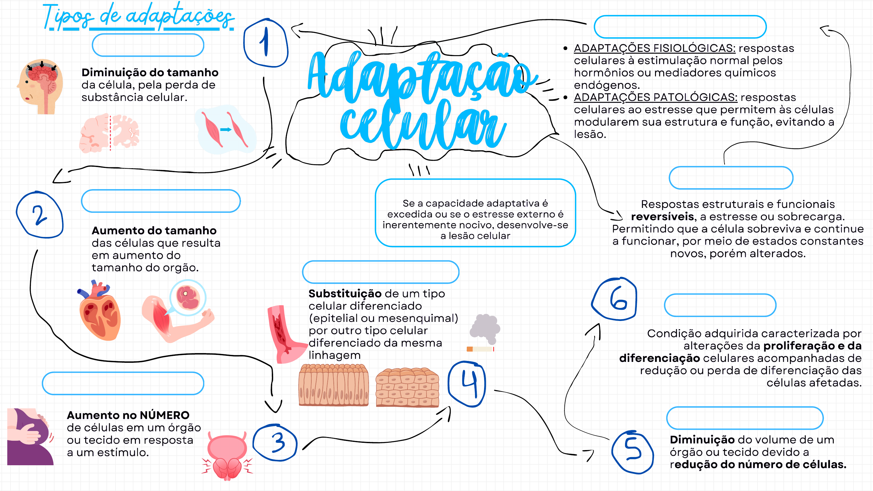 <p>C L A S S I F I C A Ç ÃO</p><p>CONC E I T O</p><p>A T R O F I A</p><p>H I P E R T O F R I A</p><p>M E T A P L A S I A</p><p>H I P E R P L A S I A</p><p>O B S E R V A Ç ÃO :</p><p>H I P O P L A S I A</p><p>D I S P L A S I A</p><p>ATROFIA</p><p>Núm</p><p>ero e tam</p><p>anho de</p><p>células</p><p>Tam</p><p>anho/peso do órgão</p><p>Útero pós gestação</p><p>Ducto tireoglosso,</p><p>notocorda</p><p>Atrofia urogenital</p><p>na menopausa</p><p>Desuso: imobilização</p><p>Compressão: tumores, cistos, aneurismas</p><p>Obstrução vascular: isquemia</p><p>Substâncias tóxicas: metais pesados</p><p>(chumbo)</p><p>Hormônios: Redução GH, GHRH, ST, TRH, TSH,</p><p>T3 e T4</p><p>Desnervação: poliomielite</p><p>Inflamações: artrite reumatóide</p><p>Mecanismo</p><p>Perda de estímulo trófico</p><p>(físico, hormonal,</p><p>desnervação)</p><p>Fluxo sanguíneo e/ou</p><p>nutrientes</p><p>Síntese proteíca</p><p>Degradação proteica</p><p>Autofagia (“comer a si</p><p>próprio”) é o processo no</p><p>qual a célula privada de</p><p>nutrientes digere seus</p><p>próprios componentes no</p><p>intuito de encontrar</p><p>nutrição e sobreviver</p><p>Degradação</p><p>excede a síntese</p><p>Células com função</p><p>diminuída, não</p><p>estão mortas</p><p>Volume de um órgão ou</p><p>tecido</p><p>Número de células</p><p>Embriogênese: defeito de</p><p>formação de um órgão ou parte</p><p>dele (hipoplasia pulmonar, renal,</p><p>etc.)</p><p>Hipoplasia de esmalte</p><p>Formação incompleta ou defeituosa da</p><p>matriz orgânica do esmalte dentário em</p><p>desenvolvimento</p><p>Após o nascimento: diminuição no</p><p>ritmo de renovação celular x</p><p>aumento da taxa de morte celular</p><p>célula</p><p>sensível a</p><p>determinado</p><p>estresse</p><p>Reprogramação</p><p>genética de células</p><p>indiferenciadas</p><p>(células-tronco)</p><p>presentes na maioria</p><p>dos tecidos</p><p>Estresse</p><p>resistente</p><p>Mecanismo</p><p>Epitélio escamoso</p><p>Metaplasia Estímulo</p><p>Estratificado</p><p>Acidez suco gástrico</p><p>(esôfago de Barrett)</p><p>Se persistir, predispõe</p><p>transformação maligna do</p><p>epitélio</p><p>Aumento de célula Mudança celular</p><p>Hiperplasia</p><p>Alteração anormal na forma, tamanho</p><p>e no padrão de crescimento das células</p><p>Metaplasia</p><p>LESÕES</p><p>PRÉ-CANCEROSAS</p><p>DISPLASIA</p><p>Alteração na</p><p>expressão dos</p><p>genes que regulam</p><p>a proliferação e</p><p>diferenciação</p><p>celular</p><p>Colo</p><p>uterino</p><p>Brônquios</p><p>Gástrica</p><p>Associadas a</p><p>tecidos</p><p>metaplásicos</p><p>Ocorre se o tecido</p><p>contém</p><p>populações</p><p>celulares capazes</p><p>de se dividir</p><p>Fisiológica</p><p>Compensatório</p><p>Hormonal</p><p>Crescimento</p><p>do tecido</p><p>residual após a</p><p>remoção ou</p><p>perda da</p><p>porção de um</p><p>órgão.</p><p>Aumento da</p><p>capacidade</p><p>funcional de</p><p>um tecido</p><p>Maioria causada por</p><p>estimulação</p><p>excessiva hormonal ou por</p><p>fatores do crescimento.</p><p>A hipertrofia e a hiperplasia podem</p><p>ocorrer concomitantemente, como por</p><p>exemplo, no útero durante a gravidez.</p><p>Síntese proteica</p><p>Células com divisões</p><p>limitadas, aumentam</p><p>de tamanho</p><p>(células musculares</p><p>estriadas</p><p>esquelética e do</p><p>coração)</p><p>Hepatócitos: células lábeis</p><p>(se adaptam a</p><p>condições diversas)</p><p>Proliferação do</p><p>epitélio glandular</p><p>da mama feminina</p><p>na puberdade e</p><p>durante a gravidez</p><p>Hiperplasia Mamária</p><p>Glândulas mamarias pelo ↑ da</p><p>prolactina na gestação e</p><p>amamentação</p><p>Hepatectomia parcial:</p><p>produção de fatores de</p><p>crescimento que se ligam a</p><p>receptores nas células</p><p>sobreviventes e ativam vias</p><p>de sinalização que</p><p>estimulam a proliferação</p><p>celular</p><p>ADAPTAÇÃO</p><p>CELULAR</p><p>Fisiológica</p><p>Patológica</p><p>Inanição: deficiência nutrição</p><p>Atrofia causada por</p><p>redução gradual do</p><p>suprimento sanguíneo</p><p>pode progredir até o</p><p>ponto no qual as células</p><p>são lesadas de modo</p><p>irreversível e morrem,</p><p>frequentemente por</p><p>apoptose.</p><p>HIPERTROFIA</p><p>HIPERPLASIA</p><p>METAPLASIA</p><p>HIPOPLASIA</p><p>Senilidade - junto à atrofiaFisiológica:</p><p>involução do timo</p><p>na puberdade,</p><p>gônadas do</p><p>climatério</p><p>Patológica: medula óssea (agentes</p><p>tóxicos, infecções), anemias</p><p>hipoplásicas, AIDS</p><p>outro tipo</p><p>celular mais</p><p>capaz de</p><p>suportar o</p><p>ambiente</p><p>hostil</p><p>Metaplasia</p><p>epitelial mais</p><p>comum:</p><p>Epitélio colunar</p><p>Vias aéreas</p><p>Tecido Normal</p><p>Esôfago</p><p>Útero</p><p>Tabagismo</p><p>Estrógeno (após a</p><p>menarca e gravidez)</p><p>Perde importantes</p><p>mecanismos de proteção</p><p>Mucosas do:Patológica</p><p>Hiperplasia de Tonsilas Palatinas</p><p>Resultado de infecções de</p><p>repetição na infância,</p><p>aumenta o número de</p><p>células de defesa</p><p>Hiperplasia Benigna de Próstata</p><p>Embora essas formas de hiperplasia</p><p>sejam anormais, o processo</p><p>permanece controlado porque não</p><p>há mutações em genes</p><p>que regulam a divisão celular e a</p><p>hiperplasia regride se a estimulação</p><p>hormonal é eliminada.</p><p>Fisiológica</p><p>Causada pelo aumento da demanda funcional ou por fatores de</p><p>crescimento ou estimulação hormonal específica.</p><p>Fisiculturismo</p><p>(hipertrofia muscular</p><p>esquelética)</p><p>Útero durante</p><p>a gravidez</p><p>Na hipertrofia pura não há novas</p><p>células, apenas</p><p>células maiores contendo</p><p>quantidades aumentadas de</p><p>proteínas</p><p>estruturais e organelas</p><p>Patológica</p><p>Hipertensão ou</p><p>doença de valva</p><p>aórtica</p><p>Mecani
