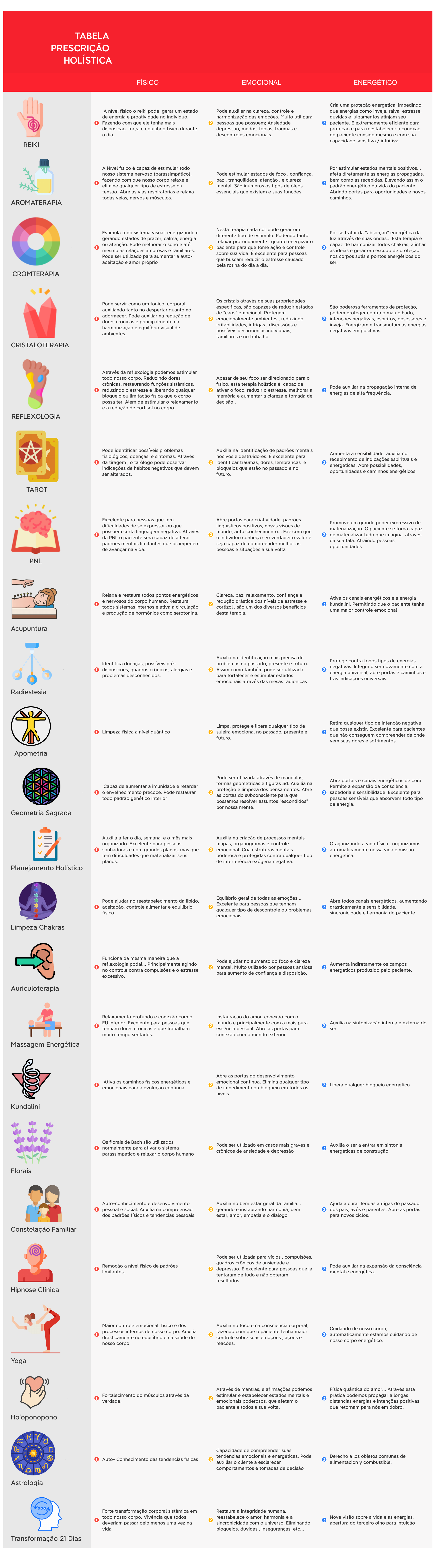 <p>FÍSICO EMOCIONAL ENERGÉTICO</p><p>TABELA</p><p>PRESCRIÇÃO</p><p>HOLÍSTICA</p><p>REIKI</p><p>Cria uma proteção energética, impedindo</p><p>que energias como inveja, raiva, estresse,</p><p>dúvidas e julgamentos atinjam seu</p><p>paciente. É extremamente eficiente para</p><p>proteção e para reestabelecer a conexão</p><p>do paciente consigo mesmo e com sua</p><p>capacidade sensitiva / intuitiva.</p><p>Pode auxiliar na clareza, controle e</p><p>harmonização das emoções. Muito util para</p><p>pessoas que possuem; Ansiedade,</p><p>depressão, medos, fobias, traumas e</p><p>descontroles emocionais.</p><p>A nível físico o reiki pode gerar um estado</p><p>de energia e proatividade no individuo.</p><p>Fazendo com que ele tenha mais</p><p>disposição, força e equilibrio físico durante</p><p>o dia.</p><p>AROMATERAPIA</p><p>A Nível físico é capaz de estimular todo</p><p>nosso sistema nervoso (parassimpático),</p><p>fazendo com que nosso corpo relaxe e</p><p>elimine qualquer tipo de estresse ou</p><p>tensão. Abre as vias respiratórias e relaxa</p><p>todas veias, nervos e músculos.</p><p>Por estimular estados mentais positivos...</p><p>afeta diretamente as energias propagadas,</p><p>bem como as recebidas. Elevando assim o</p><p>padrão energético da vida do paciente.</p><p>Abrindo portas para oportunidades e novos</p><p>caminhos.</p><p>Pode estimular estados de foco , confiança,</p><p>paz , tranquilidade, atenção , e clareza</p><p>mental. São inúmeros os tipos de óleos</p><p>essenciais que existem e suas funções.</p><p>CROMTERAPIA</p><p>Por se tratar da "absorção" energética da</p><p>luz através de suas ondas... Esta terapia é</p><p>capaz de harmonizar todos chakras, alinhar</p><p>as ideias e gerar um escudo de proteção</p><p>nos corpos sutis e pontos energéticos do</p><p>ser.</p><p>Nesta terapia cada cor pode gerar um</p><p>diferente tipo de estimulo. Podendo tanto</p><p>relaxar profundamente , quanto energizar o</p><p>paciente para que tome ação e controle</p><p>sobre sua vida. É excelente para pessoas</p><p>que buscam reduzir o estresse causado</p><p>pela rotina do dia a dia.</p><p>Estimula todo sistema visual, energizando e</p><p>gerando estados de prazer, calma, energia</p><p>ou atenção. Pode melhorar o sono e até</p><p>mesmo as relações amorosas e familiares.</p><p>Pode ser utilizado para aumentar a auto-</p><p>aceitação e amor próprio</p><p>CRISTALOTERAPIA</p><p>São poderosa ferramentas de proteção,</p><p>podem proteger contra o mau olhado,</p><p>intenções negativas, espíritos, obsessores e</p><p>inveja. Energizam e transmutam as energias</p><p>negativas em positivas.</p><p>Os cristais através de suas propriedades</p><p>especificas, são capazes de reduzir estados</p><p>de "caos" emocional. Protegem</p><p>emocionalmente ambientes , reduzindo</p><p>irritabilidades, intrigas , discussões e</p><p>possíveis desarmonias individuais,</p><p>familiares e no trabalho</p><p>Pode servir como um tônico corporal,</p><p>auxiliando tanto no despertar quanto no</p><p>adormecer. Pode auxiliar na redução de</p><p>dores crônicas e principalmente na</p><p>harmonização e equilíbrio visual de</p><p>ambientes.</p><p>REFLEXOLOGIA</p><p>Pode auxiliar na propagação interna de</p><p>energias de alta frequência.</p><p>Apesar de seu foco ser direcionado para o</p><p>físico, esta terapia holística é capaz de</p><p>ativar o foco, reduzir o estresse, melhorar a</p><p>memória e aumentar a clareza e tomada de</p><p>decisão .</p><p>Através da reflexologia podemos estimular</p><p>todo nosso corpo. Reduzindo dores</p><p>crônicas, restaurando funções sistêmicas,</p><p>reduzindo o estresse e liberando qualquer</p><p>bloqueio ou limitação física que o corpo</p><p>possa ter. Além de estimular o relaxamento</p><p>e a redução de cortisol no corpo.</p><p>TAROT</p><p>Aumenta a sensibilidade, auxilia no</p><p>recebimento de indicações espirituais e</p><p>energéticas. Abre possibilidades,</p><p>oportunidades e caminhos energéticos.</p><p>Auxilia na identificação de padrões mentais</p><p>nocivos e destruidores. É excelente para</p><p>identificar traumas, dores, lembranças e</p><p>bloqueios que estão no passado e no</p><p>futuro.</p><p>Pode identificar possíveis problemas</p><p>fisiológicos, doenças, e sintomas. Através</p><p>da tiragem , o tarólogo pode observar</p><p>indicações de hábitos negativos que devem</p><p>ser alterados.</p><p>PNL</p><p>Promove um grande poder expressivo de</p><p>materialização. O paciente se torna capaz</p><p>de materializar tudo que imagina através</p><p>da sua fala. Atraindo pessoas,</p><p>oportunidades</p><p>Abre portas para criatividade, padrões</p><p>linguísticos positivos, novas visões de</p><p>mundo, auto-conhecimento... Faz com que</p><p>o individuo conheça seu verdadeiro valor e</p><p>seja capaz de compreender melhor as</p><p>pessoas e situações a sua volta</p><p>Excelente para pessoas que tem</p><p>dificuldades de se expressar ou que</p><p>possuem certa linguagem negativa. Através</p><p>da PNL o paciente será capaz de alterar</p><p>padrões mentais limitantes que os impedem</p><p>de avançar na vida.</p><p>Acupuntura</p><p>Ativa os canais energéticos e a energia</p><p>kundalini. Permitindo que o paciente tenha</p><p>uma maior controle emocional .</p><p>Clareza, paz, relaxamento, confiança e</p><p>redução drástica dos níveis de estresse e</p><p>cortizol , são um dos diversos benefícios</p><p>desta terapia.</p><p>Relaxa e restaura todos pontos energéticos</p><p>e nervosos do corpo humano. Restaura</p><p>todos sistemas internos e ativa a circulação</p><p>e produção de hormônios como serotonina.</p><p>Radiestesia</p><p>Protege contra todos tipos de energias</p><p>negativas. Integra o ser novamente com a</p><p>energia universal, abre portas e caminhos e</p><p>trás indicações universais.</p><p>Auxilia na identificação mais precisa de</p><p>problemas no passado, presente e 