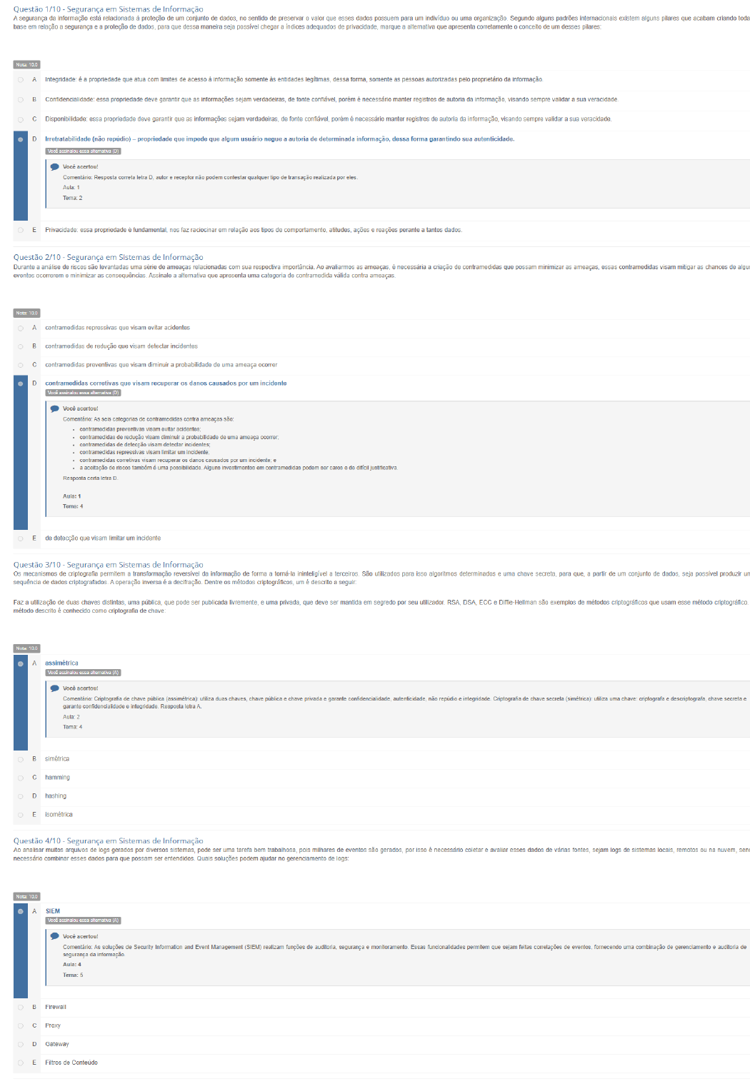 <p>Questão 1/10 Segurança em Sistemas de Informação A segurança da informação está relacionada à proteção de um conjunto de dados, no sentido de preservar valor que esses dados possuem para um indivíduo ou uma Segundo alguns padrões internacionais existem alguns pilares que acabam criando toda base em relação a segurança e proteção de dados, para que dessa maneira seja possível chegar a índices adequados de marque a alternativa que apresenta corretamente 0 conceito de um desses Nota: 10.0 A Integridade é propriedade que atua com limites de acesso à informação somente às entidades dessa forma, somente as pessoas autorizadas pelo proprietário da B Confidencialidade: essa propriedade deve garantir que as informações sejam verdadeiras, de fonte porém é necessário manter registros de autoria da visando sempre validar a sua C Disponibilidade: essa propriedade deve garantir que as informações sejam verdadeiras, de fonte porém é necessário manter registros de autoria da visando sempre validar sua veracidade D Irretratabilidade (não repúdio) propriedade que impede que algum usuário negue a autoria de determinada informação, dessa forma garantindo sua autenticidade. Você acertou! Resposta correta letra D. autor receptor não podem contestar qualquer tipo de transação realizada por Aula 1 Tema 2 E Privacidade: essa propriedade é nos faz raciocinar em relação aos tipos de comportamento, ações reações perante a tantos Questão 2/10 Segurança em Sistemas de Informação Durante análise de riscos são levantadas uma série de ameaças relacionadas com sua respectiva importância Ao avaliarmos as ameaças, é necessária a criação de contramedidas que possam minimizar as ameaças, essas contramedidas visam mitigar as chances de algur eventos ocorrerem e minimizar as Assinale a alternativa que apresenta uma categoria de contramedida contra Nota 10.0 A contramedidas repressivas que visam evitar acidentes B contramedidas de redução que visam detectar incidentes C contramedidas preventivas que visam diminuir a probabilidade de uma ameaça ocorrer D contramedidas corretivas que visam recuperar os danos causados por um incidente assinalou essa alternativa (D) Você acertou! Comentário As seis categorias de contramedidas contra ameaças são: contramedidas preventivas visam evitar acidentes: contramedidas de redução visam diminuir probabilidade de uma ameaça contramedidas de detecção visam detectar incidentes: contramedidas repressivas visam limitar um contramedidas corretivas visam recuperar os danos causados por um incidente e aceitação de riscos também uma Alguns investimentos em contramedidas podem ser caros de justificativa Resposta certa letra D. Aula: Tema: 4 E de detecção que visam limitar um incidente Questão 3/10 Segurança em Sistemas de Informação Os mecanismos de criptografia permitem a transformação da informação de forma a torná-la ininteligível a terceiros. São utilizados para isso algoritmos determinados e uma chave secreta, para que, a partir de um conjunto de dados, seja possível produzir un sequência de dados A operação inversa a Dentre os métodos um é descrito a Faz utilização de duas chaves uma pública, que pode ser publicada livremente, e uma que deve ser mantida em segredo por seu utilizador. ECC e Diffie-Hellman são exemplos de criptográficos que usam esse método método descrito é conhecido como criptografia de Nota 10.0 A assimétrica assinalou essa alternativa (A) Você acertou! Criptografia de chave pública (assimétrica) utiliza duas chave pública chave privada garante não repudio Criptografia de chave secreta utiliza uma chave criptografa descriptografa, chave secreta e garante confidencialidade Resposta letra A Aula 2 Tema 4 B simétrica C hamming D hashing E isométrica Questão 4/10 Segurança em Sistemas de Informação Ao analisar muitos arquivos de logs gerados por diversos pode ser uma tarefa bem trabalhosa, pois milhares de eventos são gerados, por isso é necessário coletar e avaliar esses dados de várias sejam logs de sistemas remotos ou na nuvem, send necessário combinar esses dados para que possam ser Quais soluções podem ajudar no gerenciamento de logs: A SIEM alternativa (A) Você acertou! Comentário As soluções de Security Information and Event Management (SIEM) realizam funções de segurança e Essas funcionalidades permitem que sejam feitas correlações de fornecendo uma combinação de gerenciamento e auditoria de segurança da informação Aula: Tema B Firewall C Proxy D Gateway E Filtros de Conteúdo</p><p>Questão 5/10 Segurança em Sistemas de Informação termo que traduzido é "traga seu próprio refere-se à propriedade de em que as organizações deixam em aberto a seus colaboradores utilizar seus próprios dispositivos para trabalhar na organização. o termo que estamos falando é 10.0 A VPN B Sandbox C BYOD Você acertou! BYOD está vinculado à mobilidade um tipo de fenômeno global que deve envolver vários aspectos como: serviços, políticas de segurança usabilidade tecnologias deve propiciar que os funcionários de uma organização desempenhem executem suas atividades profissionais fazendo uso de seus próprios meios como notebooks tablets entre Aula: 5 D Consumerização E Internet das Coisas Questão 6/10 Segurança em Sistemas de Informação Código malicioso é um tipo de código para computadores ou script que se hospeda na internet que é tendo por finalidade estancia vulnerabilidades em sistemas e gerar portas de acesso à violações de roubo de dados e além de outros danos prejuízos possíveis a sistemas de informações, aplicativos, redes de computadores e serviços. Vamos dar atenção especial esses códigos Complete as lacunas com seu respectivo conceito e assinale a alternativa que apresenta sequência que completa corretamente as 1) Phising 2) Worm 3) Cavalo de 4) Ransonware 5) Spam ( são programas maliciosos: um tipo de 