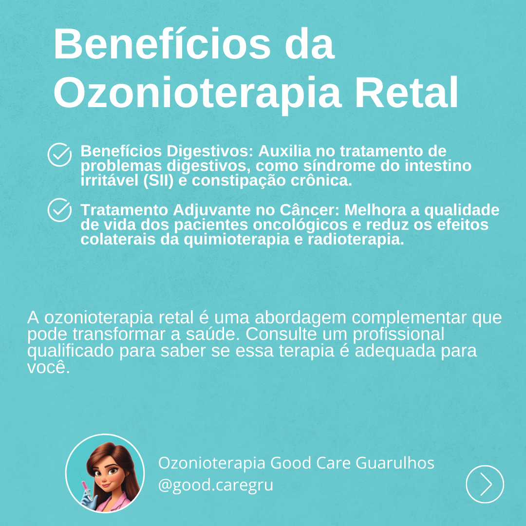 <p>Benefícios da Ozonioterapia Retal Benefícios Digestivos: Auxilia no tratamento de problemas digestivos, como síndrome do intestino irritável (SII) e constipação crônica. Tratamento Adjuvante no Câncer: Melhora a qualidade de vida dos pacientes oncológicos e reduz os efeitos colaterais da quimioterapia e radioterapia. A ozonioterapia retal é uma abordagem complementar que pode transformar a saúde. Consulte um profissional qualificado para saber se essa terapia é adequada para você. Ozonioterapia Good Care Guarulhos @good.caregru</p>