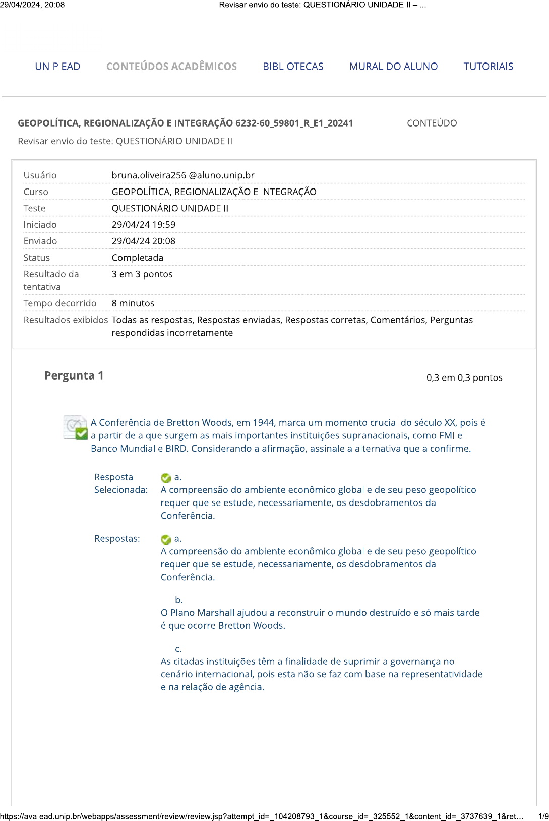<p>29/04/2024, 20:08 Revisar envio do teste: QUESTIONÁRIO UNIDADE - UNIP EAD CONTEÚDOS ACADÊMICOS BIBLIOTECAS MURAL DO ALUNO TUTORIAIS GEOPOLÍTICA, REGIONALIZAÇÃO E INTEGRAÇÃO 6232-60_59801_R_E1_20241 CONTEÚDO Revisar envio do teste: QUESTIONÁRIO UNIDADE Usuário bruna.oliveira256@aluno.unip.br Curso GEOPOLÍTICA, REGIONALIZAÇÃO E INTEGRAÇÃO Teste QUESTIONÁRIO UNIDADE Iniciado 29/04/24 19:59 Enviado 29/04/24 20:08 Status Completada Resultado da 3 em 3 pontos tentativa Tempo decorrido 8 minutos Resultados exibidos Todas as respostas, Respostas enviadas, Respostas corretas, Comentários, Perguntas respondidas incorretamente Pergunta 1 0,3 em 0,3 pontos A Conferência de Bretton Woods, em 1944, marca um momento crucial do século XX, pois é a partir dela que surgem as mais importantes instituições supranacionais, como FMI e Banco Mundial e BIRD. Considerando a afirmação, assinale a alternativa que a confirme. Resposta a. Selecionada: A compreensão do ambiente econômico global e de seu peso geopolítico requer que se estude, necessariamente, os desdobramentos da Conferência. Respostas: a. A compreensão do ambiente econômico global e de seu peso geopolítico requer que se estude, necessariamente, os desdobramentos da Conferência. b. Plano Marshall ajudou a reconstruir o mundo destruído e só mais tarde é que ocorre Bretton Woods. C. As citadas instituições têm a finalidade de suprimir a governança no cenário internacional, pois esta não se faz com base na representatividade e na relação de agência.</p><p>29/04/2024, 20:08 Revisar envio do teste: QUESTIONÁRIO UNIDADE d. A Conferência constitui uma tentativa fracassada de socorrer a Europa em ruínas. Idealizada e executada "no auge da Guerra Fria, quando os Estados Unidos punham em prática a Doutrina Truman, o Plano Marshall, além de reconstituir e desenvolver o aparelho produtivo europeu, abriu caminho para a penetração do capital norte-americano na Europa e serviu de obstáculo à expansão comunista na região, particularmente na Itália e na França. Paralelamente, processou-se o rearmamento da Europa e. O FMI e o Banco Mundial são instituições criadas com a finalidade de proteger do sistema os países de economias mais pobres. Comentário da Resposta: A. resposta: Comentário: sistema internacional contemporâneo foi forjado nas estratégias de reformulação da economia internacional (e das próprias relações internacionais) alimentadas pelo poder da potência (EUA) fomentadora e diretora de Bretton Woods. Pergunta 2 0,3 em 0,3 pontos Assinale a alternativa cuja sentença apresente a dimensão espacial do processo de transformação social, principalmente de mudança nas formas socioeconômicas locais, em virtude de processos globais. Observação: há um encadeamento entre territorialização: dimensão espacial das ações; desterritorialização: dimensão espacial das mudanças impostas aos lugares, deles retirando sua essência; e reterritorialização: associada às determinações e imposições de novas formas e conteúdos aos lugares. Resposta C. Selecionada: As relações econômicas, predominantemente as financeiras, sob a globalização tornam-se cada vez mais desterritorializadas, desligadas dos processos culturais locais. Respostas: a. A reterritorialização dos processos sociais pode acontecer sem a desterritorialização, posto que seja um processo independente, de reconfiguração das relações. b. A desterritorialização é a marca dos processos concentradores da globalização, embora aumentem as chances dos pequenos empreendedores, investidores em segmentos muito competitivos e de crescente valor agregado, colocam no lugar dos negócios de ponta, estruturas, funções e formas tradicionais. C. As relações econômicas, predominantemente as financeiras, sob a globalização tornam-se cada vez mais desterritorializadas, desligadas dos processos culturais locais. d. Algumas organizações funcionam basicamente no espaço virtual, podendo desligar-se do espaço geográfico. 2/9</p><p>29/04/2024, 20:08 Revisar envio do teste: QUESTIONÁRIO UNIDADE e. Não é possível abordar a globalização como acontecimento social de múltiplas dimensões, econômica, política, cultural, espacial, não sendo também possível ser explicada pelos processos de desterritorialização (perda dos vínculos que deram sentido social ao grupo, ao lugar) e de reterritorialização (formas sociais que são transplantadas, substitutas); ambos raramente associados. Comentário da Resposta: C. resposta: Comentário: Alternativa correta, pois apresenta um traço importante do capital financeiro contemporâneo (fictício): sua transnacionalidade e sua lógica de interesses globais, não locais. Pergunta 3 0,3 em 0,3 pontos Assinale a alternativa que apresenta uma caracterização correta de Colonialismo, Imperialismo e globalização. Resposta a. Selecionada: Colonialismo, imperialismo e globalização no período moderno seriam modos capitalistas de controle de territórios por causa de suas riquezas e, portanto, daqueles que eram, até então, seus antigos donos, governos e povos. Respostas: a. Colonialismo, imperialismo e globalização no período moderno seriam modos capitalistas de controle de territórios por causa de suas riquezas e, portanto, daqueles que eram, até então, seus antigos donos, governos e povos. b. No colonialismo, territórios e povos foram dominados como extensão absoluta de poder da no imperialismo ocorreu imposição e controle de governos e mercados, enquanto na globalização o principal objetivo dos Estados poderosos é implantar estruturas administrativas, alfandegárias e tributárias para poder extrair riquezas dos territórios sob domínio metropolitano. C. As relações estabelecidas entre Portugal e o território do atual Brasil (até a proclamação da independência), do Reino Unido com os países da Ásia (como a Índia até a proclamação da independênci