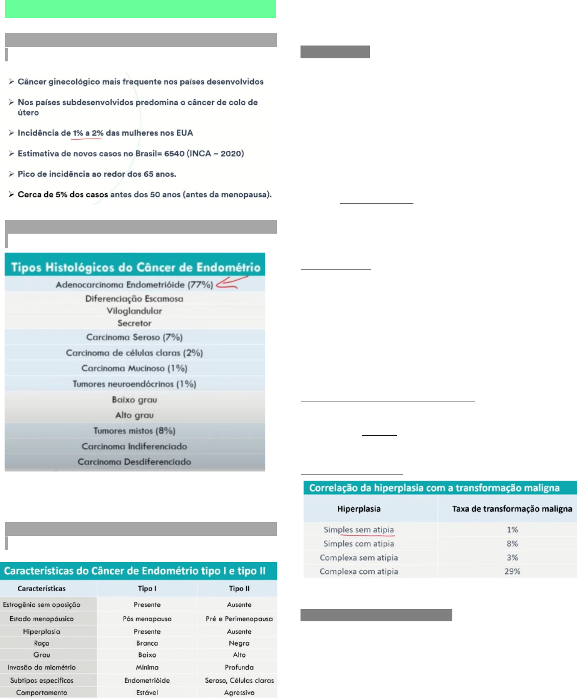 <p>ADRIANA ANDRIAN – 11º TERMO</p><p>CANCER DE ENDOMETRIO .</p><p>EPIDEMIOLOGIA .</p><p>TIPOS .</p><p>CARACTERISTICAS .</p><p>CANCER TIPO 1</p><p>- tem exposição ao estrogênio sem oposição da progesterona</p><p>O estrogênio estimula a proliferação do endométrio</p><p>A progesterona inibi a proliferação do endométrio, ou seja se não tem a progesterona, o estrogênio fica livre para proliferar o endométrio surge células neoplásicas que pode se tornar cancer</p><p>- mais frequente nas mulheres POS MENOPAUSA > 60/65 nos</p><p>- lesão precursora é a hiperplasia</p><p>- raça branca</p><p>- invasão do endométrio é MÍNIMA</p><p>- subtipo ENDOMETRIOIDE</p><p>- comportamento estável</p><p>- bom prognostico</p><p>FISIOPATOLOGIA</p><p>- exposição do endométrio ao estimulo do estrógeno sem opiscao da progesterona</p><p>- vai começar a surgir células neoplásicas no endométrio</p><p>- evoluindo para o câncer</p><p>- estrógeno sem progesterona leva a HIPERPLASIA DO ENDOMETRIO e ela é a lesão percurssora do câncer de endometrio</p><p>HIPERPLASIA ENDOMETRIAL – OMS 2014</p><p>- HIPERPLASIA SEM ATIPIA (não neoplásica)</p><p>- HIPERPLASIA ATIPICA (neoplasia intraepitelial endometrial)</p><p>CLASSIFICAÇÃO DE 1994</p><p>CANCER TIPO 2 – menos frequente</p><p>- relacionado com mutação genetica</p><p>- NÃO tem exposição ao estrogênio sem oposição da progesterona</p><p>- mais frequente nas mulheres PRE e PERIMENOPAUSA – mulheres mais jovens</p><p>- hiperplasia NÃO é lesão precursora</p><p>- raça negra</p><p>- invasão do endométrio é PROFUNDA</p><p>- subtipo SERORO, CELULAS CLARAS</p><p>- comportamento agressivo</p><p>- ruim prognostico</p><p>ATENÇÃO:</p><p>NA CONDUTA VOCE LEVA EM CONSIDERAÇÃO SE A PACIENTE TEM PROLE CONSTITUIDA OU NÃO</p><p>- SE TEM: retirada do utero para evitar que vire câncer</p><p>PACIENTE COM HIPERPLASIA DO ENDOMÉTRIO</p><p>NÃO TEM ATIPIA: aborda fatores de risco</p><p>Terapia medicamentosa PROGESTERONA</p><p>Observar</p><p>- Depois acompanha com biopsia de 6/6 meses</p><p>- reavaliar o tto</p><p>TEM ATIPIA: risco grande de neoplasia</p><p>Tem prole constituída ou não?</p><p>- Se tem: histerectomia</p><p>- Não tem: conduta conservadora</p><p>Afastar fatores de risco</p><p>Tto medicamentoso PROGESTERONA</p><p>- Acompanha com biopsia de 3/3 meses</p><p>- reavaliar o tto</p><p>FATORES DE RISCO .</p><p>FATORES DE PROTEÇÃO .</p><p>ESTRATEGIAS DE PREVENÇÃO .</p><p>NÃO TEM RASTREAMENTO, NÃO ADIANTA FAZER USG NA POPULAÇÃO EM GERAL</p><p>agora síndrome de Lynch e Cowden, usg anual e biopsia como rastreamento – elas tem um altíssimo risco de desenvolver câncer</p><p>quem usa tamoxifeno so avaliação clinica, agora se apresentar sangramento faz investigação</p><p>CLINICA .</p><p>DIAGNSOTICO .</p><p>- paciente esta com sangramentos pós menopausa</p><p>- solicita: USG (verificar a espessura endometrial)</p><p>- sem TH: < 4-5 mm atrofia</p><p>≥ 4-5 mm biopsia</p><p>- com TH: < 8 mm atrofia</p><p>≥ 8 mm biopsia</p><p>BIOPSIA .</p><p>AMBULATORIAL: cateter pipelle: Retira uma amostra</p><p>Curetagem</p><p>*HISTEROSCOPIA: voce consegue visualizar tem acurácia</p><p>Melhor</p><p>OUTROS EXAMES:</p><p>DIAGNOSTICO DIFERENCIAL .</p><p>- a causa de sangramento pos menopausa é o CÂNCER DE ENDOMÉTRIO</p><p>- a causa mais frequente é a ATROFIA ENDOMETRIAL</p><p>DISSEMINAÇÃO .</p><p>- *Extensão continua: podendo atingir a vagina e as trompas</p><p>- hematogênica</p><p>- linfática</p><p>- peritoneal</p><p>AVALIAÇÃO PRE OPERATORIA .</p><p>- avaliação pre operatória NÃO é estadiamento</p><p>ESTADIAMENTO .</p><p>- é cirúrgico</p><p>- objetivo da cirurgia é retirar o câncer por inteiro</p><p>- e quando vc retira vc esta avaliando a real extensão dele, retirar com margem</p><p>I – TUMOR RESTRITO AO CORPO UTERINO</p><p>IA – invasão de menos de metade do miométrio +frequente</p><p>IB- invasão de no mínimo metade do miométrio</p><p>...</p><p>TRATAMENTO CIRURGICO .</p><p>- * estadiamentos inicias: via laparoscópica histerectomia total + salpingooforectomia bilateral</p><p>- estadiamento avancado: via laparotomica – cirurgia aberta</p><p>image5.png</p><p>image6.png</p><p>image7.png</p><p>image8.png</p><p>image9.png</p><p>image10.png</p><p>image11.png</p><p>image12.png</p><p>image13.png</p><p>image1.png</p><p>image2.png</p><p>image3.png</p><p>image4.png</p>