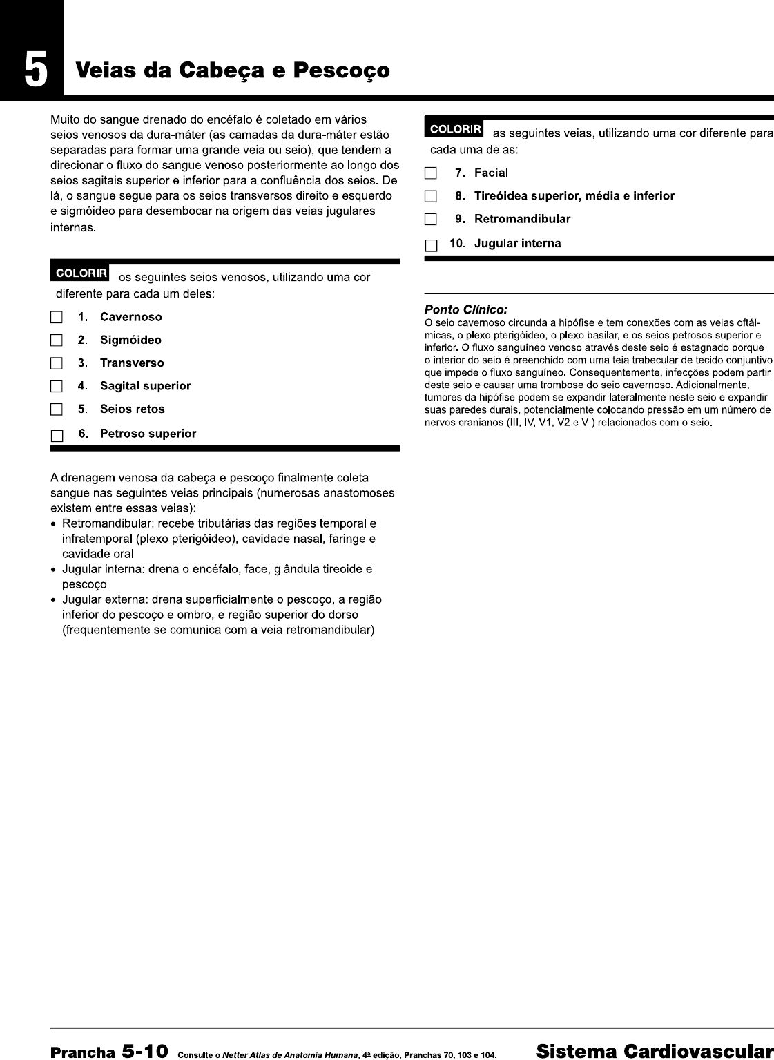 <p>5 Veias da Cabeça e Pescoço Muito do sangue drenado do encéfalo é coletado em vários COLORIR seios venosos da dura-máter (as camadas da dura-máter estão as seguintes veias, utilizando uma cor diferente para separadas para formar uma grande veia ou seio), que tendem a cada uma delas: direcionar o fluxo do sangue venoso posteriormente ao longo dos 7. Facial sagitais superior e inferior para a confluência dos De lá, o sangue segue para os seios transversos direito e esquerdo 8. Tireóidea superior, média e inferior e sigmóideo para desembocar na origem das jugulares 9. Retromandibular internas. 10. Jugular interna COLORIR os seguintes venosos, utilizando uma diferente para cada um deles: Ponto Clínico: 1. Cavernoso cavernoso circunda a hipófise e tem conexões com as oftál- 2. Sigmóideo micas, o plexo o plexo basilar. e os petrosos superior e inferior. fluxo sanguíneo venoso através deste é estagnado porque 3. Transverso o interior do é preenchido com uma teia trabecular de tecido conjuntivo que impede o fluxo sanguíneo. infecções podem partir 4. Sagital superior deste e causar uma trombose do cavernoso. tumores da hipófise podem se expandir lateralmente neste e expandir 5. retos suas paredes durais, potencialmente colocando pressão em um número de nervos cranianos (III, IV, V1. V2 e VI) relacionados com o 6. Petroso superior A drenagem venosa da cabeça e pescoço finalmente coleta sangue nas seguintes veias principais (numerosas anastomoses existem entre essas veias): Retromandibular: recebe tributárias das regiões temporal e infratemporal (plexo cavidade nasal, faringe e cavidade oral Jugular interna: drena o encéfalo, face, glândula tireoide e pescoço Jugular externa: drena superficialmente o pescoço, a região inferior do pescoço e ombro, e região superior do dorso (frequentemente se comunica com a veia retromandibular) Prancha 5-10 Consulte o Netter Atlas de Anatomia Humana, edição, Pranchas 70, 103 e 104. Sistema Cardiovascular</p><p>Veias da Cabeça e Pescoço 5 Veia Artéria oftálmica carótida superior interna 1 Plexo basilar 6 Forame jugular Seio petroso inferior Veia oftálmica superior 2 Veia angular Tentório do 3 cerebelo 5 Veia cerebral Confluência dos seios magna 4 Plexo pterigóideo Veia temporal A. Seios venosos da dura-máter (fossas do crânio) superficial Veias maxilares 9 7 Foice do cérebro Veia Veia cerebral 10 4 lingual magna 8 Veia jugular externa 5 (cortada) 3 Veia 1 sub- clávia Confluência dos 6 seios Seio occipital B. Resumo das veias Seio petroso inferior 2 Forame jugular C. Seios venosos da dura-máter (vista lateral) Netter Anatomia para Colorir Prancha 5-10</p>