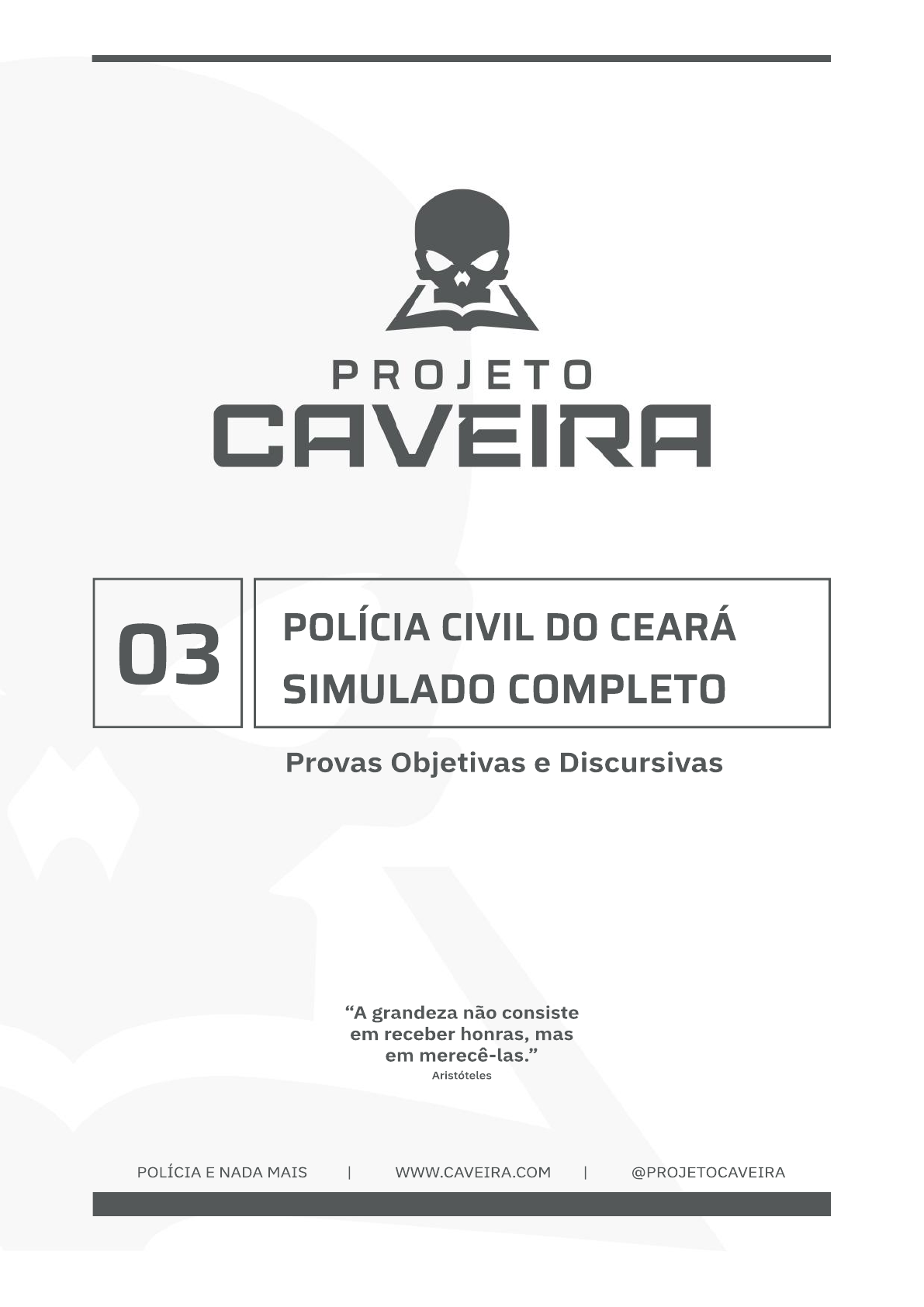 <p>POLÍCIA CIVIL DO CEARÁ03 SIMULADO COMPLETO</p><p>POLÍCIA E NADA MAIS | WWW.CAVEIRA.COM | @PROJETOCAVEIRA</p><p>Provas Objetivas e Discursivas</p><p>“A grandeza não consiste</p><p>em receber honras, mas</p><p>em merecê-las.”</p><p>Aristóteles</p><p>293886.18/04/2023</p><p>089.420.824-16.98603</p><p>PROJETO CAVEIRA 3º SIMULADO COMPLETO – PCCE – 2023 – PRÉ-EDITAL</p><p>1</p><p>CONHECIMENTOS BÁSICOS</p><p>Língua Portuguesa</p><p>Acorrentados</p><p>Quem coleciona selos para o filho do amigo;</p><p>quem acorda de madrugada e estremece no desgosto de</p><p>si mesmo ao lembrar que há muitos anos feriu a quem</p><p>amava; quem chora no cinema ao ver o reencontro de pai</p><p>e filho; quem segura sem temor uma lagartixa e lhe faz</p><p>com os dedos uma carícia; quem se detém no caminho</p><p>para ver melhor a flor silvestre; quem se ri das próprias</p><p>rugas; quem decide aplicar-se ao estudo de uma língua</p><p>morta depois de um fracasso sentimental; quem procura</p><p>na cidade os traços da cidade que passou; quem se deixa</p><p>tocar pelo símbolo da porta fechada; quem costura roupa</p><p>para os lázaros; quem envia bonecas às filhas dos</p><p>lázaros; quem diz a uma visita pouco familiar: Meu pai só</p><p>gostava desta cadeira; quem manda livros aos</p><p>presidiários; quem se comove ao ver passar de cabeça</p><p>branca aquele ou aquela, mestre ou mestra, que foi a fera</p><p>do colégio; quem escolhe na venda verdura fresca para</p><p>o canário; quem se lembra todos os dias do amigo morto;</p><p>quem jamais negligencia os ritos da amizade; quem</p><p>guarda, se lhe deram de presente, o isqueiro que não</p><p>mais funciona; quem, não tendo o hábito de beber, liga o</p><p>telefone internacional no segundo uísque a fim de</p><p>conversar com amigo ou amiga; quem coleciona pedras,</p><p>garrafas e galhos ressequidos; quem passa mais de dez</p><p>minutos a fazer mágicas para as crianças; quem guarda</p><p>as cartas do noivado com uma fita; quem sabe construir</p><p>uma boa fogueira; quem entra em delicado transe diante</p><p>dos velhos troncos, dos musgos e dos liquens; quem</p><p>procura decifrar no desenho da madeira o hieróglifo da</p><p>existência; quem não se acanha de achar o pôr-do-sol</p><p>uma perfeição; quem se desata em sorriso à visão de</p><p>uma cascata; quem leva a sério os transatlânticos que</p><p>passam; quem visita sozinho os lugares onde já foi feliz</p><p>ou infeliz; quem de repente liberta os pássaros do viveiro;</p><p>quem sente pena da pessoa amada e não sabe explicar</p><p>o motivo; quem julga adivinhar o pensamento do cavalo;</p><p>todos eles são presidiários da ternura e andarão por toda</p><p>a parte acorrentados, atados aos pequenos amores da</p><p>armadilha terrestre.</p><p>(CAMPOS, Paulo Mendes. O anjo bêbado. Rio de Janeiro: Sabiá,</p><p>1969.).</p><p>1. Acerca da estrutura textual, é possível afirmar que:</p><p>A) O narrador surpreende pela objetividade com que trata</p><p>os fatos apresentados.</p><p>B) Por meio da exposição de fatos, a progressão textual</p><p>é comprometida propositalmente.</p><p>C) Por meio da narrativa, o texto produz um efeito de</p><p>“estranhamento” a partir de marcas subjetivas.</p><p>D) O tema abordado é explorado a partir da exposição de</p><p>fatos e dinâmica narrativa, predominantemente.</p><p>E) O narrador facilita a leitura com um linguajar bem</p><p>sórdido.</p><p>2. “[...] todos eles são presidiários da ternura e andarão</p><p>por toda a parte acorrentados, atados aos pequenos</p><p>amores da armadilha terrestre.”. O fragmento destacado</p><p>anteriormente promove, no contexto:</p><p>A) A compreensão do sentido das sequências anteriores.</p><p>B) Uma quebra de expectativa, causando surpresa ao</p><p>leitor.</p><p>C) A continuidade do mesmo procedimento estrutural</p><p>anterior.</p><p>D) Uma segmentação do texto de caráter opositivo aos</p><p>fatos anteriores.</p><p>E) Um trecho do texto que possui caráter de transição</p><p>estrutural do termo posterior.</p><p>3. Em relação ao conto de Paulo Mendes Campos,</p><p>analise as afirmativas a seguir.</p><p>I. O cotidiano é apresentado sob uma nova perspectiva,</p><p>saindo do comum, do habitual.</p><p>II. A subjetividade característica do gênero textual</p><p>apresentado é reforçada, também, pela escolha do</p><p>campo semântico utilizado no texto.</p><p>III. O tema abordado é constituído a partir de elementos</p><p>descritivos que compõem um cenário em que o próprio</p><p>leitor pode se reconhecer, tendo em vista a</p><p>universalidade da matéria tratada.</p><p>Está(ão) correta(s) apenas a(s) afirmativa(s):</p><p>A) I.</p><p>B) III.</p><p>C) I e II.</p><p>D) II e III.</p><p>E) II.</p><p>4. Em todas os itens a seguir, é mostrado um fragmento</p><p>do texto e uma reescrita. Analise-os.</p><p>I. “quem acorda de madrugada e estremece no desgosto</p><p>de si mesmo ao lembrar que há muitos anos feriu a quem</p><p>amava” / “quem labuta de madrugada e trepida no</p><p>desgosto de si mesmo ao lembrar que há muitos anos</p><p>feriu a quem amava”.</p><p>II. “quem escolhe na venda verdura fresca para o canário”</p><p>/ “quem decide na venda verdura fresca para o canário”.</p><p>III. “quem, não tendo o hábito de beber, liga o</p><p>telefone internacional no segundo uísque a fim de</p><p>conversar com amigo ou amiga” / “quem, não possuindo</p><p>a intermitência de beber, liga o telefone internacional na</p><p>segunda dose a fim de conversar com o amigo ou amiga”.</p><p>O(s) item(ns) que mantém (mantêm) o sentido original é</p><p>(são):</p><p>A) I e II.</p><p>B) III.</p><p>C) II e III.</p><p>D) II</p><p>E) I.</p><p>293886.18/04/2023</p><p>089.420.824-16.98603</p><p>PROJETO CAVEIRA 3º SIMULADO COMPLETO – PCCE – 2023 – PRÉ-EDITAL</p><p>2</p><p>5. Na sequência “quem guarda, se lhe deram de</p><p>presente, o isqueiro que não mais funciona”, temo