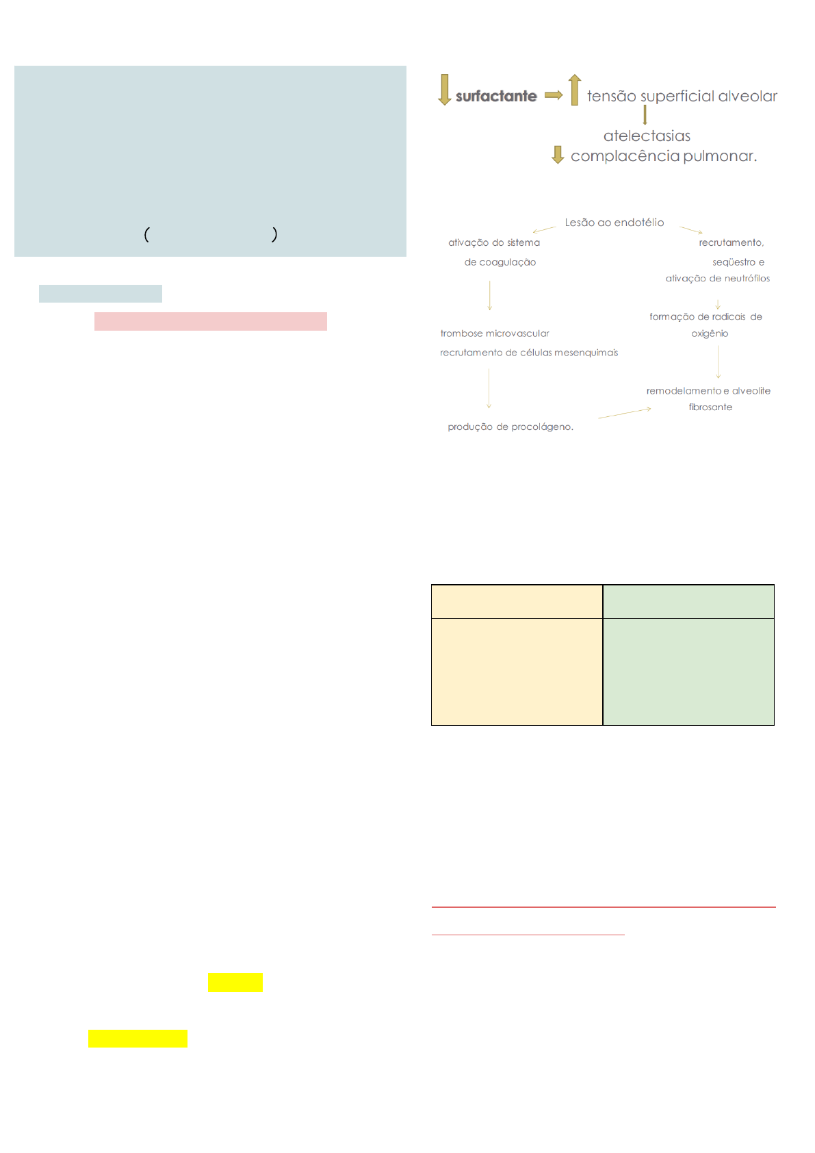 <p>Insuficiência respiratória e</p><p>Síndrome da Angústia</p><p>Respiratória Aguda</p><p>( SARA ou SDRA )</p><p>Fisiopatologia</p><p>LESÃO PULMONAR AGUDA</p><p>Danos epiteliais ou endoteliais que</p><p>podem iniciar devido a várias</p><p>condições. Ela se manifesta da seguinte</p><p>forma:</p><p>1) Início agudo de dispneia</p><p>2) Diminuição da pressão parcial de</p><p>oxigênio arterial - hipoxemia</p><p>3) Desenvolvimento de infiltrados</p><p>pulmonares causados por danos</p><p>capilares alveolares: edema</p><p>pulmonar não cardiogênico</p><p>bilaterais nos RXs</p><p>Assim, ocorre uma inflamação difusa da</p><p>membrana alvéolo-capilar devido ao</p><p>extravasamento de fluido rico em</p><p>proteínas para o espaço alveolar.</p><p>A fisiopatologia envolve os pneumócitos</p><p>tipo I e tipo II:</p><p>● Pneumócitos tipo I: células</p><p>pavimentosas, com pequena</p><p>quantidade de citoplasma</p><p>● Pneumócitos tipo II: células ovais</p><p>e volumosas, produzem o</p><p>surfactante</p><p>Para o desenvolvimento da lesão,</p><p>ocorre um balanço entre mediadores</p><p>pró-inflamatórios e anti-inflamatórios</p><p>Pró-inflamatórios Anti-inflamatórios</p><p>TNF-a, IL-1, IL-6,</p><p>IL-8</p><p>IL-10,</p><p>antagonistas do</p><p>receptor de IL-1 e</p><p>do receptor do</p><p>TNF solúvel</p><p>Essa lesão pulmonar aguda pode</p><p>progredir para a síndrome da angústia</p><p>respiratória aguda.</p><p>Síndrome da Angústia Respiratória</p><p>Aguda (SARA ou SDRA)</p><p>● O que a causa? Dano capilar e</p><p>epitelial alveolar difuso. É</p><p>caracterizada como um edema</p><p>pulmonar de causa não</p><p>cardiogênica, mas sim</p><p>inflamatória. Aparece em até 7d</p><p>do fator desencadeante. A morte</p><p>acontece por disfunção de</p><p>múltiplos órgãos sistêmicos</p><p>● Seu diagnóstico é clínico. Excluir</p><p>causas de edema</p><p>cardíaco/IC/sobrecarga volêmica</p><p>● Evolução:</p><p>1) Início rápido de insuficiência</p><p>respiratória com risco de morte</p><p>2) Cianose</p><p>3) Hipoxemia arterial severa</p><p>refratária à oxigenoterapia: pode</p><p>progredir para falência múltipla</p><p>de órgãos</p><p>● Quais são as alterações</p><p>histológicas? Dano alveolar</p><p>difuso (DAD)</p><p>● Pode acontecer em diversos</p><p>contextos clínicos, sendo a lesão</p><p>ocorrendo de forma direta ou</p><p>indireta (sistêmica)</p><p>● Doença progressiva causada por</p><p>dano alveolar difuso no contexto</p><p>de sepse, trauma severo ou</p><p>infecção pulmonar difusa</p><p>● Tratar a causa e fornecer uma</p><p>terapia de suporte > ventilação</p><p>protetora e terapia conservadora</p><p>de fluidos</p><p>🤓 Não é igual à síndrome da angústia</p><p>respiratória nos recém-nascidos, que é</p><p>causada por deficiência primária de</p><p>surfactante > contexto, TTO e</p><p>patologias diferentes!</p><p>● Explicando a patogenia:</p><p>○ Por causa da lesão, a</p><p>integridade da barreira</p><p>feita pela membrana</p><p>capilar-alveolar está</p><p>comprometida</p><p>■ Consequência aguda:</p><p>aumento da</p><p>transudação alveolar</p><p>e da permeabilidade</p><p>vascular, perda da</p><p>capacidade de</p><p>difusão e</p><p>anormalidades do</p><p>surfactante por causa</p><p>de dano aos</p><p>pneumócitos tipo II</p><p>○ Neutrófilos: liberadores de</p><p>produtos que causam dano</p><p>ao epitélio e ao endotélio</p><p>alveolar > contribui para a</p><p>exsudação = perda de</p><p>surfactante = dificuldade na</p><p>expansibilidade dos</p><p>alvéolos. Papel central na</p><p>patogenia. O macrófago</p><p>ativado libera mediadores</p><p>pró-inflamatórios e</p><p>quimiocinas que vão</p><p>realizar uma quimiotaxia de</p><p>monócitos e neutrófilos. Os</p><p>neutrófilos vão liberar</p><p>mediadores tóxicos que vão</p><p>provocar injúria ao alvéolo e</p><p>à perda da membrana. Vai</p><p>culminar em edema</p><p>intersticial e edema</p><p>intra-alveolar. Também</p><p>ocorre agregação</p><p>plaquetária, formação de</p><p>microtrombos, coagulação</p><p>intra-alveolar > favorece a</p><p>formação da membrana</p><p>hialina</p><p>○ Seu grau é relacionado com</p><p>o balanço entre os fatores</p><p>protetores e destrutivos</p><p>● Morfologia:</p><p>○ Fase aguda: pulmões</p><p>vermelho-escuros, firmes,</p><p>sem ar, pesados. Congestos,</p><p>células epiteliais alveolares</p><p>necrosadas, edema e</p><p>hemorragia intersticial e</p><p>intra-alveolar, acúmulo de</p><p>neutrófilos nos capilares ao</p><p>microscópio. O achado</p><p>característico é a</p><p>membrana hialina</p><p>revestindo os ductos</p><p>alveolares</p><p>○ Estágio de organização:</p><p>proliferação vigorosa de</p><p>pneumócitos tipo II na</p><p>tentativa de REGENERAR ></p><p>não é comum acontecer, é</p><p>mais notado a organização</p><p>dos exsudatos de fibrina</p><p>com fibrose intra-alveolar</p><p>○ O espessamento dos septos</p><p>alveolares ocorre devido à</p><p>proliferação das células</p><p>intersticiais e ao depósito</p><p>de colágeno</p><p>● Fatores relacionados a um ruim</p><p>prognóstico: idade avançada,</p><p>sepse, falência multissistêmica</p><p>● Achados histológicos</p><p>característicos:</p><p>1) Edema alveolar</p><p>2) Necrose epitelial</p><p>3) Acúmulo neutrofílico</p><p>4) Presença de membrana</p><p>hialina revestindo os ductos</p><p>alveolar</p><p>O recrutamento ativa resposta</p><p>inflamatória, que é tóxica ao pneumócito</p><p>tipo I: ele morre e EXACERBA a resposta</p><p>inflamatória [debris celulares]</p><p>● Fases: resumindo</p><p>○ Fase exsudativa</p><p>■ Resposta imune inata</p><p>> destruição da</p><p>barreira</p><p>alvéolo-capilar ></p><p>edema rico em</p><p>proteínas</p><p>○ Fase proliferativa</p><p>■ Restauração da</p><p>homeostase</p><p>○ Fase fibrótica</p><p>■ Aumento de</p><p>mortalidade e tempo</p><p>de ventilação</p><p>mec