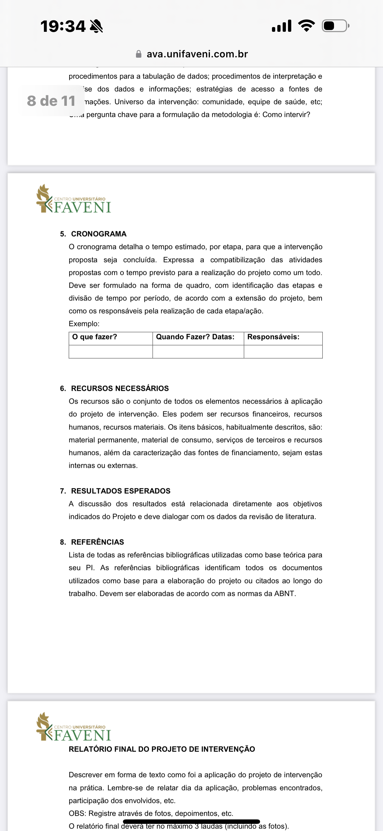 <p>19:34 procedimentos para a tabulação de dados; procedimentos de interpretação e dos dados e informações; estratégias de acesso a fontes de 8 de 11 mações. Universo da intervenção: comunidade, equipe de saúde, etc; pergunta chave para a formulação da metodologia é: Como intervir? CENTRO UNIVERSITÁRIO FAVENI 5. CRONOGRAMA cronograma detalha o tempo estimado, por etapa, para que a intervenção proposta seja concluída. Expressa a compatibilização das atividades propostas com o tempo previsto para a realização do projeto como um todo. Deve ser formulado na forma de quadro, com identificação das etapas e divisão de tempo por período, de acordo com a extensão do projeto bem como os responsáveis pela realização de cada etapa/ação. Exemplo: o que fazer? Quando Fazer? Datas: Responsáveis: 6. RECURSOS NECESSÁRIOS Os recursos são o conjunto de todos os elementos necessários à aplicação do projeto de intervenção. Eles podem ser recursos financeiros, recursos humanos, recursos materiais. Os itens básicos, habitualmente descritos, são: material permanente, material de consumo, serviços de terceiros e recursos humanos, além da caracterização das fontes de financiamento, sejam estas internas ou externas. 7. RESULTADOS ESPERADOS A discussão dos resultados está relacionada diretamente aos objetivos indicados do Projeto e deve dialogar com os dados da revisão de literatura. 8. REFERÊNCIAS Lista de todas as referências bibliográficas utilizadas como base teórica para seu PI. As referências bibliográficas identificam todos os documentos utilizados como base para a elaboração do projeto ou citados ao longo do trabalho. Devem ser elaboradas de acordo com as normas da ABNT. CENTRO UNIVERSITÁRIO FAVENI RELATÓRIO FINAL DO PROJETO DE INTERVENÇÃO Descrever em forma de texto como foi a aplicação do projeto de intervenção na prática. Lembre-se de relatar dia da aplicação, problemas encontrados, participação dos envolvidos, etc. OBS: Registre através de fotos, depoimentos, etc. relatório final ter no 3 laudas (incluindo as fotos).</p>