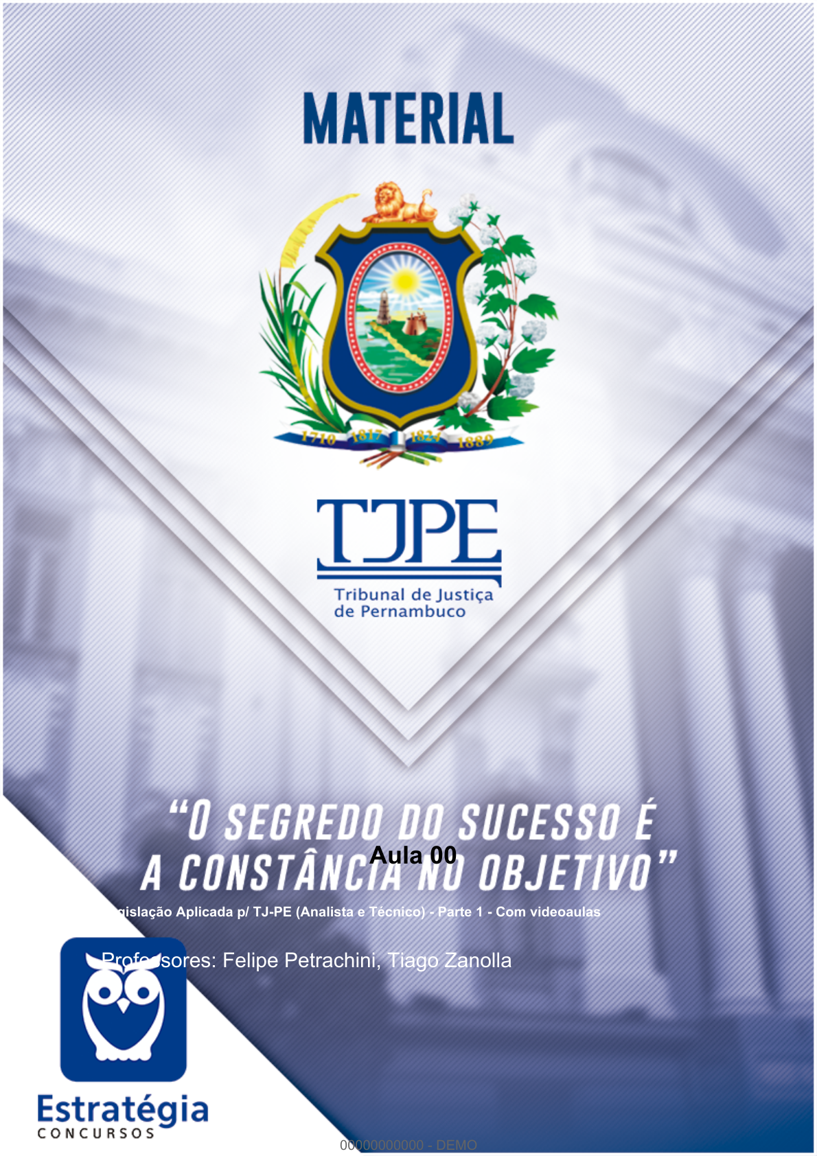 <p>Aula 00</p><p>Legislação Aplicada p/ TJ-PE (Analista e Técnico) - Parte 1 - Com videoaulas</p><p>Professores: Felipe Petrachini, Tiago Zanolla</p><p>00000000000 - DEMO</p><p>Legislação Específica para o TJ-PE</p><p>Teoria e exercícios comentados</p><p>Prof. Felipe Cepkauskas Petrachini Aula 00</p><p>Prof. Felipe Cepkauskas Petrachini www.estrategiaconcursos.com.br</p><p>Página 1 de 46</p><p>Aula 00 – Lei nº 6.123 de 20 de julho de 1968.</p><p>SUMÁRIO PÁGINA</p><p>Sumário</p><p>Apresentação .................................................................................................. 1</p><p>Meus Pãezinhos .............................................................................................. 3</p><p>Considerações sobre o Curso ......................................................................... 4</p><p>Vídeo Aulas ..................................................................................................... 5</p><p>1. Lei 6.123 de 20 de julho de 1968 (Estatuto dos Servidores Públicos do</p><p>Estado do Pernambuco) ............................................................................................. 6</p><p>1.1 Provimento ........................................................................................... 15</p><p>1.1.1 Nomeação ..................................................................................... 16</p><p>1.1.2 Concurso Público .......................................................................... 20</p><p>1.1.3 Posse e Exercício .......................................................................... 25</p><p>Questões Comentadas .................................................................................. 37</p><p>Questões Propostas ...................................................................................... 43</p><p>Apresentação</p><p>Olá a todos. Eu me chamo Felipe e serei responsável por parte dos diplomas</p><p>legais referentes à disciplina de Legislação Institucional.</p><p>Tenho 26 anos e atualmente exerço o cargo de Agente Fiscal de Rendas do</p><p>Estado de São Paulo (vulgo “Fiscal do ICMS”). Sou formado em Direito pela</p><p>Universidade de São Paulo, mais conhecida como Largo São Francisco. E sim, isso</p><p>00000000000</p><p>00000000000 - DEMO</p><p>Legislação Específica para o TJ-PE</p><p>Teoria e exercícios comentados</p><p>Prof. Felipe Cepkauskas Petrachini Aula 00</p><p>Prof. Felipe Cepkauskas Petrachini www.estrategiaconcursos.com.br</p><p>Página 2 de 46</p><p>significa que perdi horas de sono ao longo de meses a fio para fazer a FUVEST.</p><p>Bons tempos aqueles...</p><p>Ingressei no serviço público em 2009, no cargo de Assistente Técnico</p><p>Administrativo do Ministério da Fazenda. Fiquei mais de dois anos no cargo, onde</p><p>aprendi desde furar papel até os meandros mais específicos da ciência do Direito</p><p>Tributário. De tanto choramingar, a partir de fevereiro comecei a supervisionar parte</p><p>do setor onde trabalhava, ganhando um aumento singelo (sim, essas coisas existem</p><p>no serviço público se você for ambicioso).</p><p>Em abril de 2012 fui nomeado para o cargo de Técnico Judiciário Área</p><p>Administrativa do Tribunal Regional do Trabalho. Lembro-me até hoje de que</p><p>mesmo estando na posição 1237, e já passados mais de três anos da prova, ainda</p><p>assim chegou minha vez. Mas lógico, se tivesse ido melhor, teria sido chamado</p><p>mais cedo.</p><p>Passei em 16º lugar no concurso de AFTM de São Paulo, ingressando na</p><p>Prefeitura lá para agosto de 2012 e ali fiquei até (finalmente) ingressar na Secretaria</p><p>da Fazenda do Estado de São Paulo (vulgo ICMS SP), cargo agora, em março de</p><p>2014.</p><p>Fora isso, fui chamado para ser Oficial de Justiça do Tribunal de Justiça de</p><p>São Paulo (não lembro a posição de cabeça, mas demorou pacas pra chamar e eu</p><p>já estava na Prefeitura quando isso aconteceu) e Escrevente Técnico Judiciário na</p><p>Circunscrição de Mauá, que também é longe pacas de onde eu moro. Também fui</p><p>convidado (recentemente) a ocupar a vaga de Técnico do INSS na Agência de</p><p>Atibaia (8º lugar)</p><p>Prometendo não me alongar muito, fiquei em 4º lugar no concurso de</p><p>Assistente de Licitação para a FURP (Fundação do Remédio Popular), concurso</p><p>este do qual também não pude assumir e, fui chamado para ser Técnico da</p><p>SPPREV, em um concurso bastante peculiar (se tiver a curiosidade, pegue a lista de</p><p>aprovados e veja as notas do pessoal, coisa de louco ), e, por fim, fui nomeado em</p><p>2010 (ou 11 ) para exercer o cargo de Técnico do Ministério Público da União.</p><p>00000000000</p><p>00000000000 - DEMO</p><p>Legislação Específica para o TJ-PE</p><p>Teoria e exercícios comentados</p><p>Prof. Felipe Cepkauskas Petrachini Aula 00</p><p>Prof. Felipe Cepkauskas Petrachini www.estrategiaconcursos.com.br</p><p>Página 3 de 46</p><p>Mas pra fazer tudo isso, não é necessário nenhum lampejo de genialidade ou</p><p>dom divino. Alias, boa parte dos meus conhecidos me tomam por alguém bastante</p><p>"desligado", de maneira que alguns ainda se espantam em saber que eu ainda não</p><p>me esqueci de respirar. O que eu sou, em verdade, é teimoso.</p><p>E pra ser bem sincero, já levei fumo também em concurso. Fui tão mal na</p><p>prova do BACEN da época que fiz que fiquei com vergonha. Mas foi só vergonha,</p><p>não desisti por causa disso, nem você deve se sua vez ainda não chegou. Aliás, o</p><p>desastre da época foi o que me animou a estudar mais profundamente disciplinas</p><p>como contabilidade geral, que me auxiliaram anos depois na obtenção do cargo de</p><p>Agente Fiscal de Rendas, o qual exerço hoje.</p><p>A vaga está lá disponível para quem quiser pegar, e já adianto: não é</p><p>necessário nenhum lampejo de genialidade ou dom divino (embora ambos ajudem</p><p>muito). Eu tive a oport