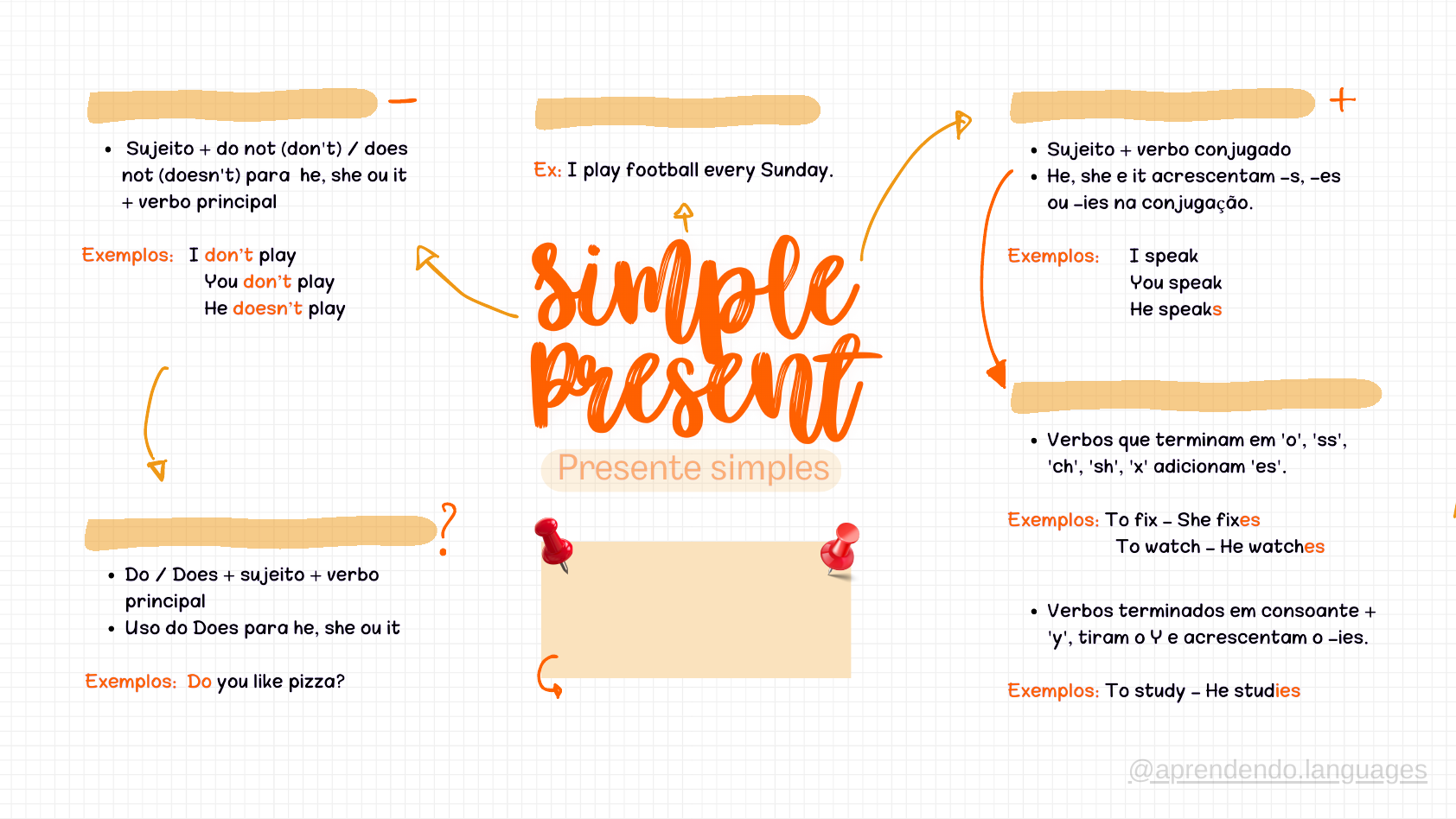 <p>R E G R A D O - E S O U - I E S</p><p>A lways : S emp r e</p><p>Never : Nunca</p><p>Often : F r equen temen te</p><p>A Ç Õ E S H A B I T U A I S F O R M A A F I R M A T I V AF O R M A N E G A T I V A</p><p>F O R M A I N T E R R O G A T I V A</p><p>P A L A V R A S - C H A V E</p><p>normalmente usadas nas</p><p>frases em simple present</p><p>@aprendendo.languages</p><p>U S O</p><p>E S T R U T U R A</p><p>F O R M A N E G A T I V A</p><p>F O R M A I N T E R R O G A T I V A</p><p>P A L A V R A S - C H A V E</p><p>ye s t e r day</p><p>la s t wee k</p><p>l a s t y ea r</p><p>normalmente usadas nas</p><p>frases em simple past</p><p>F O R M A A F I R M A T I V A</p><p>@aprendendo.languages</p><p>U S O D E F O R M A G E R A L</p><p>F O R M A A F I R M A T I V A</p><p>F O R M A N E G A T I V A</p><p>F O R M A I N T E R R O G A T I V A</p><p>E S T R U T U R A D O V E R B O</p><p>P A L A V R A S - C H A V E</p><p>Now : Ago ra</p><p>At t he moment : Ne s se momen to</p><p>S t i l l : A i nda</p><p>normalmente usadas nas</p><p>frases em presente contínuo</p><p>@aprendendo.languages</p><p>S I G N I F I C A D O N O P R E S E N T S I M P L EF O R M A A F I R M A T I V A</p><p>F O R M A N E G A T I V A</p><p>F O R M A I N T E R R O G A T I V A</p><p>P A L A V R A S - C H A V E</p><p>H o j e : t o d a y</p><p>A g o r a : n o w</p><p>A q u i : h e r e</p><p>@aprendendo.languages</p><p>S U B J E C T P R O N O U N S O B J E C T P R O N O U N S</p><p>@aprendendo.languages</p><p>(Estes, Estas)</p><p>Usado para algo plural e</p><p>perto do falante.</p><p>Exemplo: These are my shoes.</p><p>(Estes são meus sapatos)</p><p>(Esse, Essa, Aquele, Aquela)</p><p>Usado para algo singular e</p><p>longe do falante.</p><p>Exemplo: That is your car.</p><p>(Aquele é seu carro)</p><p>(Esses, Essas, Aqueles/as)</p><p>Usado para algo plural e longe</p><p>do falante.</p><p>Exemplo: Those are their bags.</p><p>(Aquelas são as bolsas deles)</p><p>@aprendendo.languages</p><p>T H I S</p><p>T H E S E</p><p>T H A T</p><p>T H O S E</p><p>(Este, Esta, Isto)</p><p>Usado para algo singular e</p><p>perto do falante.</p><p>Exemplo: This is my book.</p><p>(Este é meu livro)</p><p>A / A N</p><p>I M P O R T A N T E</p><p>S u b s t a n t i v o s i n c o n t á v e i s : N ã o</p><p>u s a m a r t i g o s i n d e f i n i d o s .</p><p>E x e m p l o : w a t e r</p><p>T H E</p><p>@aprendendo.languages</p><p>Wh-Questions</p><p>W H O</p><p>Q u e m</p><p>E x e m p l o : W h o i s y o u r t e a c h e r ?</p><p>W H A T</p><p>O q u e / Q u a l</p><p>E x e m p l o : W h a t i s y o u r n a m e ?</p><p>W H E N</p><p>Q u a n d o</p><p>E x e m p l o : W h e n i s y o u r b i r t h d a y ?</p><p>W H E R E</p><p>O n d e</p><p>E x e m p l o : W h e r e d o y o u l i v e ?</p><p>W H Y</p><p>P o r q u e</p><p>E x e m p l o : W h y a r e y o u l a t e ?</p><p>W H I C H</p><p>Q u a l</p><p>E x e m p l o : W h i c h c o l o r d o y o u</p><p>p r e f e r ?</p><p>W H O S E</p><p>D e q u e m</p><p>E x e m p l o : W h o s e b o o k i s t h i s ?</p><p>H O W</p><p>C o m o</p><p>E x e m p l o : H o w a r e y o u ?</p><p>@aprendendo.languages</p><p>E S T R U T U R AU S O</p><p>v e r b o s e m o T O</p><p>E x e m p l o s : G o , O p e n .</p><p>D o n ' t + v e r b o n a f o r m a b a s e .</p><p>E x e m p l o : D o n ' t b e l a t e</p><p>É u s a d o p a r a d a r o r d e n s , i n s t r u ç õ e s ,</p><p>c o n s e l h o s , p e d i d o s o u p a r a f a z e r</p><p>s u g e s t õ e s . E l e p o d e s e r a f i r m a t i v o o u</p><p>n e g a t i v o .</p><p>L e t ' s n o t : U s a d o p a r a f a z e r</p><p>s u g e s t õ e s n e g a t i v a s .</p><p>E x e m p l o : L e t ' s n o t g o t h e r e .</p><p>F O R M A N E G A T I V A</p><p>@aprendendo.languages</p><p>A T A B O V E</p><p>I N</p><p>(Dentro de, em)</p><p>Exemplo: The book is in the</p><p>bag. (O livro está dentro</p><p>da bolsa)</p><p>(Em, No, Na) - Específico</p><p>Exemplo: I am at the bus</p><p>stop. (Estou no ponto de</p><p>ônibus)</p><p>O N</p><p>Sobre, Em cima de - Superfícies</p><p>Exemplo: The phone is on</p><p>the table. (O telefone está</p><p>sobre a mesa)</p><p>E x i s t e m m a i s p r e p o s i ç õ e s</p><p>d e l u g a r c o m o : U n d e r ,</p><p>b e l o w , b e t w e e n , b e h i n d . . .</p><p>(Acima de) - Nível mais alto</p><p>Exemplo: The lamp is above</p><p>the table. (A lâmpada está</p><p>acima da mesa)</p><p>@aprendendo.languages</p><p>F O R B Y</p><p>I N</p><p>(Em)</p><p>Meses: in January.</p><p>Anos: in 2024 .</p><p>Estações: in the summer.</p><p>Séculos: in the 21st.</p><p>Exemplo: We met in 2015.</p><p>(Nós nos conhecemos em</p><p>2015)</p><p>(Por, durante)</p><p>Exemplo: I lived there for</p><p>five years. (Eu morei lá</p><p>por cinco anos)</p><p>O N</p><p>(Em, No, Na) - Específico</p><p>Dias da semana: on Monday.</p><p>Datas: on March 15th.</p><p>Feriados com "day": on</p><p>Christmas Day.</p><p>Exemplo: I have a meeting</p><p>on Tuesday. (Tenho uma</p><p>reunião na terça-feira)</p><p>E x i s t e m m a i s p r e p o s i ç õ e s</p><p>d e t e m p o c o m o : u n t i l ,</p><p>s i n c e , d u r i n g , a g o . . .</p><p>(Até)</p><p>Exemplo: Finish the report</p><p>by Friday. (Termine o</p><p>relatório até sexta-feira)</p><p>@aprendendo.languages</p><p>Adjetivos Possessivos: Acompanham um substantivo.</p><p>Exemplo: This is my book.</p><p>Pronomes Possessivos: Substituem o substantivo.</p><p>Exemplo: This book is mine.</p><p>Mine (Meu, Minha)</p><p>Yours (Seu, Sua)</p><p>His (Dele)</p><p>Hers (Dela)</p><p>Its (Dele, Dela)</p><p>Ours (Nosso, Nossa)</p><p>Theirs (Deles, Delas)</p><p>A D J E T I V O S</p><p>P O S S E S S I V O S</p><p>I n d i c a m p o s s e o u p e r t e n c i m e n t o .</p><p>U s a d o s p a r a s u b s t i t u i r o</p><p>s u b s t a n t i v o q u e f o i m e n c i o n a d o</p><p>a n t e r i o r m e n t e .</p><p>D E F I N I Ç Ã O A D J E T I V O E P R O N O M E P O S S E S S I V O</p><p>My (Meu, Minha)</p><p>Your (Seu, Sua)</p><p