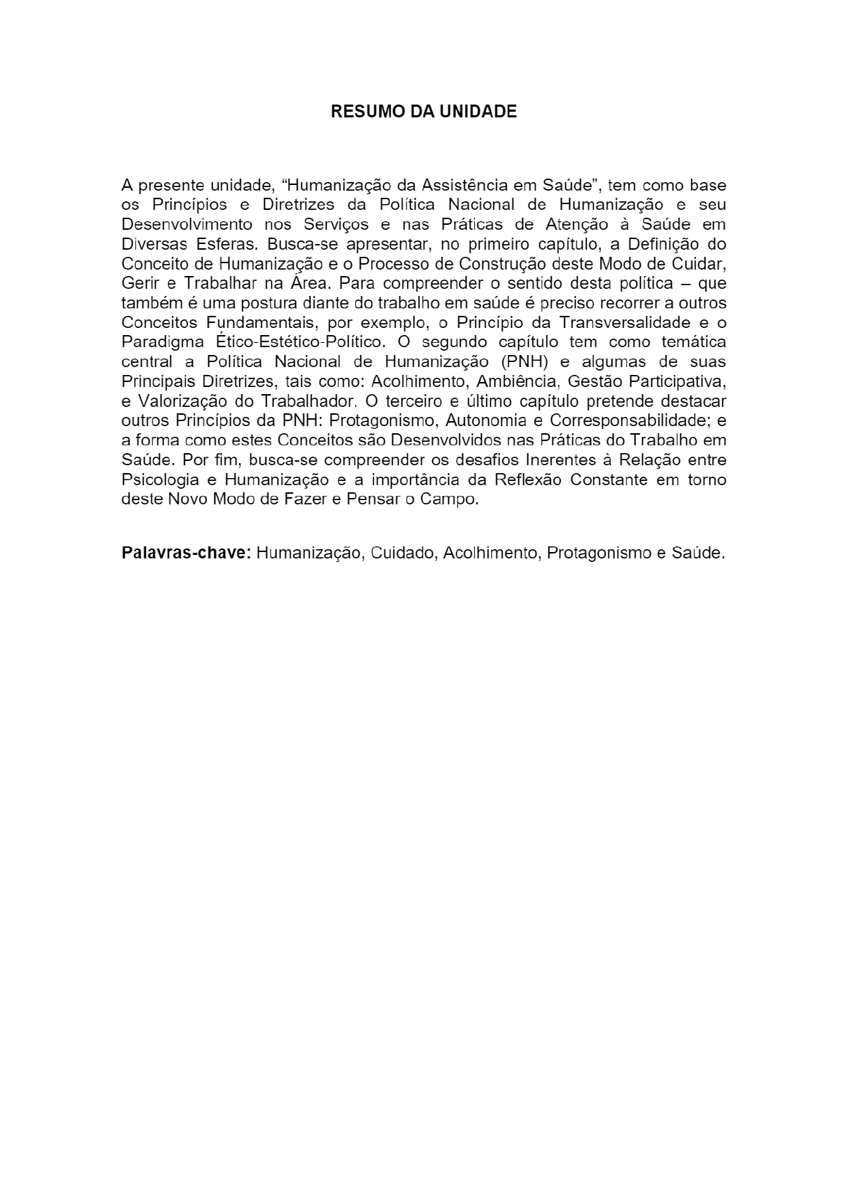 <p>RESUMO DA UNIDADE A presente unidade, "Humanização da Assistência em Saúde", tem como base os Princípios e Diretrizes da Política Nacional de Humanização e seu Desenvolvimento nos Serviços e nas Práticas de Atenção à Saúde em Diversas Esferas. Busca-se apresentar, no primeiro capítulo, a Definição do Conceito de Humanização e o Processo de Construção deste Modo de Cuidar, Gerir e Trabalhar na Area. Para compreender o sentido desta política - que também é uma postura diante do trabalho em saúde é preciso recorrer a outros Conceitos Fundamentais, por exemplo, o Princípio da Transversalidade e o Paradigma Ético-Estético-Politico O segundo capítulo tem como temática central a Política Nacional de Humanização (PNH) e algumas de suas Principais Diretrizes, tais como: Acolhimento, Ambiência, Gestão Participativa, e Valorização do Trabalhador. terceiro e último capítulo pretende destacar outros Princípios da PNH: Protagonismo, Autonomia e Corresponsabilidade; e a forma como estes Conceitos são Desenvolvidos nas Práticas do Trabalho em Saúde. Por fim, busca-se compreender os desafios Inerentes à Relação entre Psicologia e Humanização e a importância da Reflexão Constante em torno deste Novo Modo de Fazer e Pensar o Campo. Palavras-chave: Humanização, Cuidado, Acolhimento, Protagonismo e Saúde.</p><p>ÍNDICE CAPÍTULO 1 - HUMANIZAÇÃO: UM OLHAR ÉTICO - ESTÉTICO - POLÍTICO 1.1. que é Humanização em Saúde? 1.2. Cuidado Humanizado 1.3. O Princípio da Transversalidade 1.4. A Indissociabilidade entre Atenção e Gestão 1.5. Paradigma CAPÍTULO 2- POLÍTICA NACIONAL DE HUMANIZAÇÃO (PNH) 2.1. Método Paideia 2.2. Acolhimento 2.3. Ambiência 2.4. Gestão Participativa e Cogestão 2.5. Valorização do Trabalhador 2.5.1. Saúde do Trabalhador da Saúde: alguns Apontamentos CAPÍTULO 3- PROTAGONISMO E PRODUÇÃO DE SAÚDE 3.1. Protagonismo e Corresponsabilidade 3.2. Psicologia e Humanização 3.3. Saúde da Mulher 3.4. Humanização Hospitalar 3.5. Práticas Humanizadas CONSIDERAÇÕES FINAIS REFERÊNCIAS</p><p>APRESENTAÇÃO DO MÓDULO A Humanização da Saúde é uma temática que envolve o compromisso dos profissionais com as pessoas, a partir de uma relação de cuidado, acolhimento e empatia. Essa atitude humana diante do outro é considerada uma Postura que transforma e potencializa as relações dentro de um serviço de saúde. É a partir da Política Nacional de Humanização (PNH), criada em 2003, que este novo modo de fazer saúde passa a ser reconhecido. Esse novo olhar para a saúde pressupõe que, em primeiro lugar, o usuário é um sujeito que necessita ser cuidado integralmente, respeitado em sua singularidade e reconhecido como parte ativa do processo de produção e promoção da saúde. A Humanização é descrita, no campo da saúde, como uma aposta É uma aposta ética porque envolve a atitude de usuários, gestores e profissionais de saúde comprometidos e corresponsáveis. É estética porque se refere ao processo de produção da saúde e de subjetividades autônomas e protagonistas. E é política porque está associada à organização social e institucional das práticas de atenção e gestão na rede do SUS. (PenseSuS/FIOCRUZ) Nesse sentido, é importante ressaltar que a PNH é "uma Política Pública no SUS voltada para ativação de dispositivos que favoreçam Ações de Humanização no âmbito da atenção e da Gestão da Saúde no Brasil" (Rede Humaniza SUS). De acordo com esta definição, entende-se que é uma política que não se restringe somente os trabalhadores, mas deve orientar todos aqueles que participam do processo de trabalho e da tomada de decisões. Assim, trabalhadores e gestores se alinham aos princípios e diretrizes da PNH para a construção de um trabalho coletivo que seja eficiente e eficaz; que compreenda a vida em sua complexidade e respeite a todos sem qualquer tipo de discriminação. CAMPOS (2005) traz uma importante reflexão acerca da humanização através da problematização do conceito e de uma análise do contexto</p><p>contemporâneo baseado na lógica a produtividade, do desenvolvimento econômico que pouco se atenta às questões humanas e sociais, o que contribui para o esquecimento das pessoas. Segundo o autor: A ordenação do espaço urbano há muito deixou de lado a preocupação com o bem-estar das pessoas. Em saúde é comum à redução de pessoas a objetos a serem manipulados pela clínica ou pela saúde pública. O humano diz respeito ao Sujeito e à centralidade da vida humana. (CAMPOS, 2005, p. 399). Essa é uma questão de grande relevância no campo da Psicologia, que trabalha diretamente com os conteúdos subjetivos e os desdobramentos das condições de vida, dificuldades e sofrimentos relacionados a uma sociedade desigual e excludente. Humanizar a saúde pode parecer uma obviedade, mas é um processo complexo que exige uma abertura das pessoas enquanto agentes da mudança. É uma postura ética que implica na forma como as relações são tecidas no cotidiano do trabalho; é uma transformação na forma de entender a saúde, o funcionamento das instituições e as práticas de trabalho e gestão. Não é uma ação isolada, mas um conjunto de princípios que visam reconhecer a autonomia, o valor e a importância que tem cada neste processo.</p><p>CAPÍTULO 1 - HUMANIZAÇÃO: UM OLHAR ÉTICO - ESTÉTICO - POLÍTICO</p><p>CAPÍTULO 1 - HUMANIZAÇÃO: UM OLHAR "Tornar-se humano pode se transformar em um ideal, e sufocar-se de acréscimos... Ser humano não deveria ser um ideal para o homem que é fatalmente humano, ser humano tem que ser o modo como eu, coisa viva, obedecendo por liberdade ao caminho do que é vivo, sou humana". (Clarice Lispector) 1.1. o que é Humanização em Saúde? A Humanização da Assistência em Saúde é uma temática que abarca desde os conceitos que embasam teoricamente seus princípios e diretrizes até sua aplicabilidade nos s