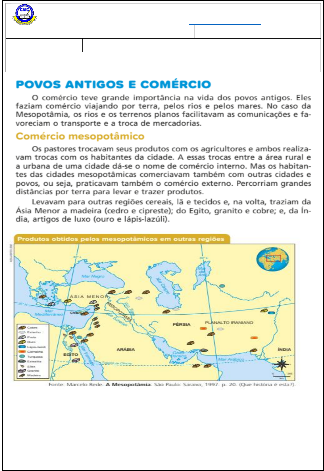 <p>O comércio entre os povos altera o modo de vida deles?</p><p>_____________________________________________________________________________________________</p><p>____________________________________________________________________________________________</p><p>_____________________________________________________________________________________________</p><p>ESCOLA MUNICIPAL DONA ELZA ALVES DE OLIVEIRA</p><p>RUA CARLOS MILIGRANA, 135, DISTRITO INDUSTRIAL - MATOZINHOS – MG</p><p>CEP 35.720 – 000 TELEFONE: (31) 3712-7515 EMAIL: caicmatozinhos2@yahoo.com.br</p><p>COMPONENTE CURRICULAR: História PROFª:</p><p>ANO: 4ª ANO TURMA: DATA:______/______/2024</p><p>NOME:</p><p>mailto:CAICMATOZINHOS2@YAHOO.COM.BR</p><p>Será que o comércio pelo Nilo a flora e a fauna locais ?</p><p>_____________________________________________________________________________________________</p><p>_____________________________________________________________________________________________</p><p>_____________________________________________________________________________________________</p><p>ESCOLA MUNICIPAL DONA ELZA ALVES DE OLIVEIRA</p><p>RUA CARLOS MILIGRANA, 135, DISTRITO INDUSTRIAL - MATOZINHOS – MG</p><p>CEP 35.720 – 000 TELEFONE: (31) 3712-7515 EMAIL: caicmatozinhos2@yahoo.com.br</p><p>COMPONENTE CURRICULAR: História PROFª:</p><p>ANO: 4ª ANO TURMA: DATA:______/______/2024</p><p>NOME:</p><p>mailto:CAICMATOZINHOS2@YAHOO.COM.BR</p><p>ESCOLA MUNICIPAL DONA ELZA ALVES DE OLIVEIRA</p><p>RUA CARLOS MILIGRANA, 135, DISTRITO INDUSTRIAL - MATOZINHOS – MG</p><p>CEP 35.720 – 000 TELEFONE: (31) 3712-7515 EMAIL: caicmatozinhos2@yahoo.com.br</p><p>COMPONENTE CURRICULAR: História PROFª:</p><p>ANO: 4ª ANO TURMA: DATA:______/______/2024</p><p>NOME:</p><p>mailto:CAICMATOZINHOS2@YAHOO.COM.BR</p><p>Responda no caderno.</p><p>4- O que é escambo?</p><p>5 Como se dava o escambo? Cite um exemplo</p><p>6 Hoje todo o comercio é feito com o uso de moeda?</p><p>7 Você já trocou um objeto com outra pessoa? Qual?</p><p>TRANSFORMAÇÕES REVERSÍVEIS E IRREVERSÍVEIS</p><p>ESCOLA MUNICIPAL DONA ELZA ALVES DE OLIVEIRA</p><p>RUA CARLOS MILIGRANA, 135, DISTRITO INDUSTRIAL - MATOZINHOS – MG</p><p>CEP 35.720 – 000 TELEFONE: (31) 3712-7515 EMAIL: caicmatozinhos2@yahoo.com.br</p><p>COMPONENTE CURRICULAR: Ciências da Natureza PROFª:</p><p>ANO: 4ª ANO TURMA: DATA:______/______/2024</p><p>NOME:</p><p>mailto:CAICMATOZINHOS2@YAHOO.COM.BR</p><p>Escreva uma frase que sintetize a charge abaixo do cartunista Maurício de Souza,</p><p>tendo em vista a temática “Transformações reversíveis e irreversíveis da matéria”.</p><p>_____________________________________________________________________________________________</p><p>_____________________________________________________________________________________________</p><p>_____________________________________________________________________________________________</p><p>1- Qual é a diferença entre transformações reversíveis e irreversíveis?</p><p>____________________________________________________________________________</p><p>____________________________________________________________________________</p><p>____________________________________________________________________________</p><p>2) Escreva se a transformação é reversível ou irreversível:</p><p>a) Queima de papel? _____________________________</p><p>b) O azedamento do leite? _________________________</p><p>c) Enferrujamento da palha de aço? __________________</p><p>d) Ferver a água?_________________________________</p><p>e) Amassar uma latinha de alumínio? _________________</p><p>f) Congelamento da água? _________________________</p><p>g) Dissolução do açúcar em água? ___________________</p><p>h) Ovo cozido? ___________________________________</p><p>3) A mãe de Paulinha estava preparando o almoço. Ela queria preparar algo diferente no</p><p>cardápio.</p><p>Ao quebrar os ovos para preparar a receita, achou interessante a característica deste</p><p>alimento. A gema e a clara eram bem molinhas e viscosas. Depois de um tempo, na panela,</p><p>percebeu que ele já tinha não tinha as mesmas características de antes. O que ocasionou essa</p><p>mudança? Perguntou Paulinha. Mas, o pior ainda estava por vir... Ao ler novamente a receita</p><p>percebeu que o ovo deveria estar cru, não cozido. E agora??? O que fazer?! Será que é uma</p><p>transformação reversível!? Vamos ajudar a desvendar as questões... Observe as imagens e</p><p>responda as questões</p><p>a) O ovo cru ainda pode ser transformado em ovo</p><p>cozido?</p><p>R:___________________________________</p><p>b) Quais características podemos perceber no</p><p>ovo cru?</p><p>R:____________________________________</p><p>c) O ovo cru pode virar um ovo cozido? Como?</p><p>R:_________________________________________________________________________</p><p>d) E o ovo cozido, pode voltar a ser um ovo cru? Por quê?</p><p>R:__________________________________________________________________</p><p>ESCOLA MUNICIPAL DONA ELZA ALVES DE OLIVEIRA</p><p>RUA CARLOS MILIGRANA, 135, DISTRITO INDUSTRIAL - MATOZINHOS – MG</p><p>CEP 35.720 – 000 TELEFONE: (31) 3712-7515 EMAIL: caicmatozinhos2@yahoo.com.br</p><p>COMPONENTE CURRICULAR: Ciências da Natureza PROFª:</p><p>ANO: 4ª ANO TURMA: DATA:______/______/2024</p><p>NOME:</p><p>mailto:CAICMATOZINHOS2@YAHOO.COM.BR</p><p>A população brasileira e sua diversidade cultural</p><p>Além de se encontrar distribuída de maneira desigual pelo território do país, outra importante</p><p>característica da população brasileira é sua grande diversidade cultural, resultado do processo histórico</p><p>de sua formação.</p><p>A população brasileira é o resultado da miscigenação de diferentes povos; indígenas, africanos,</p><p>europeus e alguns povos asiáticos.</p><p>A mistura de hábitos crenças e tradições desses povos formou a diversidade cultural do povo</p><p>brasileiro.</p><p>Os indíg