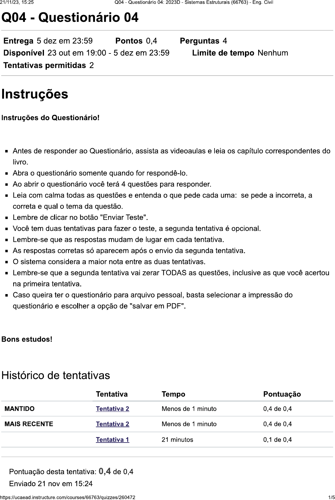 <p>21/11/23, 15:25 Q04 - Questionário 04: 2023D - Sistemas Estruturais (66763) Eng. Civil Q04 - Questionário 04 Entrega 5 dez em 23:59 Pontos 0,4 Perguntas 4 Disponível 23 out em 19:00 5 dez em 23:59 Limite de tempo Nenhum Tentativas permitidas 2 Instruções Instruções do Questionário! Antes de responder ao Questionário, assista as videoaulas e leia os capítulo correspondentes do livro. Abra o questionário somente quando for respondê-lo. Ao abrir o questionário você terá 4 questões para responder. Leia com calma todas as questões e entenda o que pede cada uma: se pede a incorreta, a correta e qual o tema da questão. Lembre de clicar no botão "Enviar Teste". Você tem duas tentativas para fazer o teste, a segunda tentativa é opcional. Lembre-se que as respostas mudam de lugar em cada tentativa. As respostas corretas só aparecem após o envio da segunda tentativa. sistema considera a maior nota entre as duas tentativas. Lembre-se que a segunda tentativa vai zerar TODAS as questões, inclusive as que você acertou na primeira tentativa. Caso queira ter o questionário para arquivo pessoal, basta selecionar a impressão do questionário e escolher a opção de "salvar em PDF". Bons estudos! Histórico de tentativas Tentativa Tempo Pontuação MANTIDO Tentativa 2 Menos de 1 minuto 0,4 de 0,4 MAIS RECENTE Tentativa 2 Menos de 1 minuto 0,4 de 0,4 Tentativa 1 21 minutos 0,1 de 0,4 Pontuação desta tentativa: 0,4 de 0,4 Enviado 21 nov em 15:24 https://ucaead.instructure.com/courses/66763/quizzes/260472 1/5</p><p>21/11/23, 15:25 Q04 Questionário 04: 2023D - Sistemas Estruturais (66763) - Eng. Civil Esta tentativa levou Menos de 1 minuto. Pergunta 1 0,1 0,1 pts Saber utilizar um método para a resolução de sistemas hiperestáticos é fundamental. Pois no final o que interessa é a resposta do problema. Para conseguirmos extrair todos os dados do problema precisamos principalmente encontrar as reações de apoio em um esquema estático. As reações em um sistema estático hiperestático nos dão as condições necessárias para traçarmos os diagramas. Sobre este contexto, resolva o problema a seguir. Quanto vale a reação vertical no apoio fixo? Use o método dos esforços. Considere que as propriedades da viga se mantenham iguais. (módulo de elasticidade e momento de inércia). 2.00 2.00 2.00 m 3.00 m 2.00 Correto! Aproximadamente 1,3 kN para cima. Aproximadamente 4.3 kN para cima. Aproximadamente 5.3 kN para cima. Aproximadamente 2.3 kN para Aproximadamente 3.3 kN para Pergunta 2 0,1/0,1 pts Conseguir encontrar as reações de apoio em uma estrutura é um passo fundamental para conseguirmos traçar os diagramas de esforços solicitantes. Para encontrar essas reações em estruturas https://ucaead.instructure.com/courses/66763/quizzes/260472 2/5</p><p>21/11/23, 15:25 Q04 - Questionário 04: 2023D - Sistemas Estruturais (66763) Eng. Civil hiperestáticas é preciso utilizar um dos métodos clássicos. Um deles é os métodos dos esforços no qual utilizamos sistemas virtuais que nos auxiliam a encontrar essas reações. Neste contexto, resolva o que se pede. Quanto vale a reação vertical no primeiro apoio móvel da esquerda para a direita? Use o método dos esforços. Considere que as propriedades da viga se mantenham iguais. (módulo de elasticidade e momento de inércia). 2 00 2.00 kN/m 2.00 m 3.00 m m Aproximadamente 6.7 kN para Aproximadamente 7.7 kN para cima Aproximadamente 9.7 kN para cima. Aproximadamente 8.7 kN para cima. Correto! Aproximadamente 5,7 kN para cima. Pergunta 3 0,1/0,1 pts Para utilizarmos o método dos esforços para resolver estruturas hiperestáticas podemos contar com a ajuda de tabelas. Nas tabelas encontramos resultados clássicos para que não precisemos resolver tudo a mão. Portanto, essas tabelas agilizam o procedimento. É possível aplicar o método dos esforços em estruturas diferentes umas das outras. Sobre a aplicação do método dos esforços em pórticos planos, marque a alternativa correta. método dos esforços só é possível de ser aplicado em vigas. https://ucaead.instructure.com/courses/66763/quizzes/260472 3/5</p><p>21/11/23, 15:25 Q04 Questionário 04: 2023D Sistemas Estruturais (66763) Eng. Civil método serve para somarmos esforços normais em diferentes esquemas estáticos e encontrar a flecha O método dos esforços é totalmente diferente se compararmos sua aplicação em vigas e Correto! O método dos esforços para pórticos planos é análogo ao método dos esforços para vigas. Os procedimentos seguem o mesmo raciocínio. Não é possível aplicar o método dos esforços para pórticos Pergunta 4 0,1/0,1 pts Um dos métodos comuns a ser utilizado para a resolução de estruturas hiperestáticas é o método dos esforços. Ele consiste na criação de casos isostáticos a partir da estrutura real, com exceção do caso principal cada um dos outros casos representará uma incógnita a ser encontrada. Por esta razão uma estrutura 3 vezes hiperestática resultará em um sistema linear 3x3. Baseado neste contexto responda a seguinte questão. Sobre o método dos esforços qual é a alternativa correta Correto! No método dos esforços aplicamos esforços virtuais unitários equivalentes ao vínculo que retiramos da estrutura. Cada um desses esforços unitários se tornará um caso a ser resolvido. No método dos esforços sempre colocamos momentos unitários iguais a 1 em um ponto aleatório https://ucaead.instructure.com/courses/66763/quizzes/260472 4/5</p><p>21/11/23, 15:25 Q04 - Questionário 04: 2023D - Sistemas Estruturais (66763) - Eng. Civil No método dos esforços não precisamos colocar nenhum esforço unitário No método dos esforços sempre colocamos forças unitárias iguais a 1 em um ponto aleatório. Cada um desses esforços unitários se tornará um caso a ser resolvido. No método dos esforços sempre colocamos reações unitários iguais a 1 em um ponto aleatório Pontuação do teste: 0,4 de 0,4