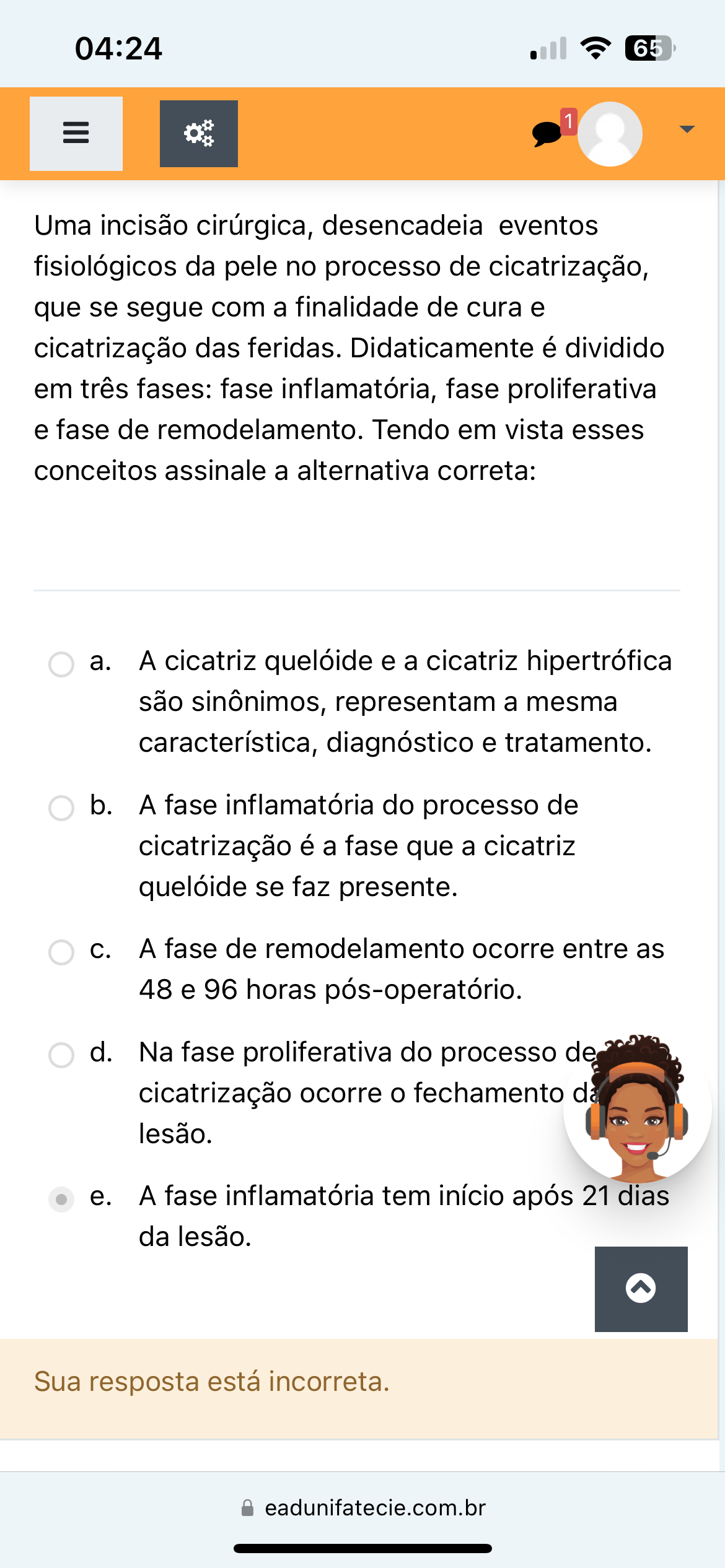 <p>04:24 65 1 Uma incisão cirúrgica, desencadeia eventos fisiológicos da pele no processo de cicatrização, que se segue com a finalidade de cura e cicatrização das feridas. Didaticamente é dividido em três fases: fase inflamatória, fase proliferativa e fase de remodelamento. Tendo em vista esses conceitos assinale a alternativa correta: a. A cicatriz quelóide e a cicatriz hipertrófica são sinônimos, representam a mesma característica, diagnóstico e tratamento. b. A fase inflamatória do processo de cicatrização é a fase que a cicatriz quelóide se faz presente. C. A fase de remodelamento ocorre entre as 48 e 96 horas pós-operatório. d. Na fase proliferativa do processo de cicatrização ocorre o fechamento dà lesão. e. A fase inflamatória tem início após 21 dias da lesão. Sua resposta está incorreta. eadunifatecie.com.br</p>