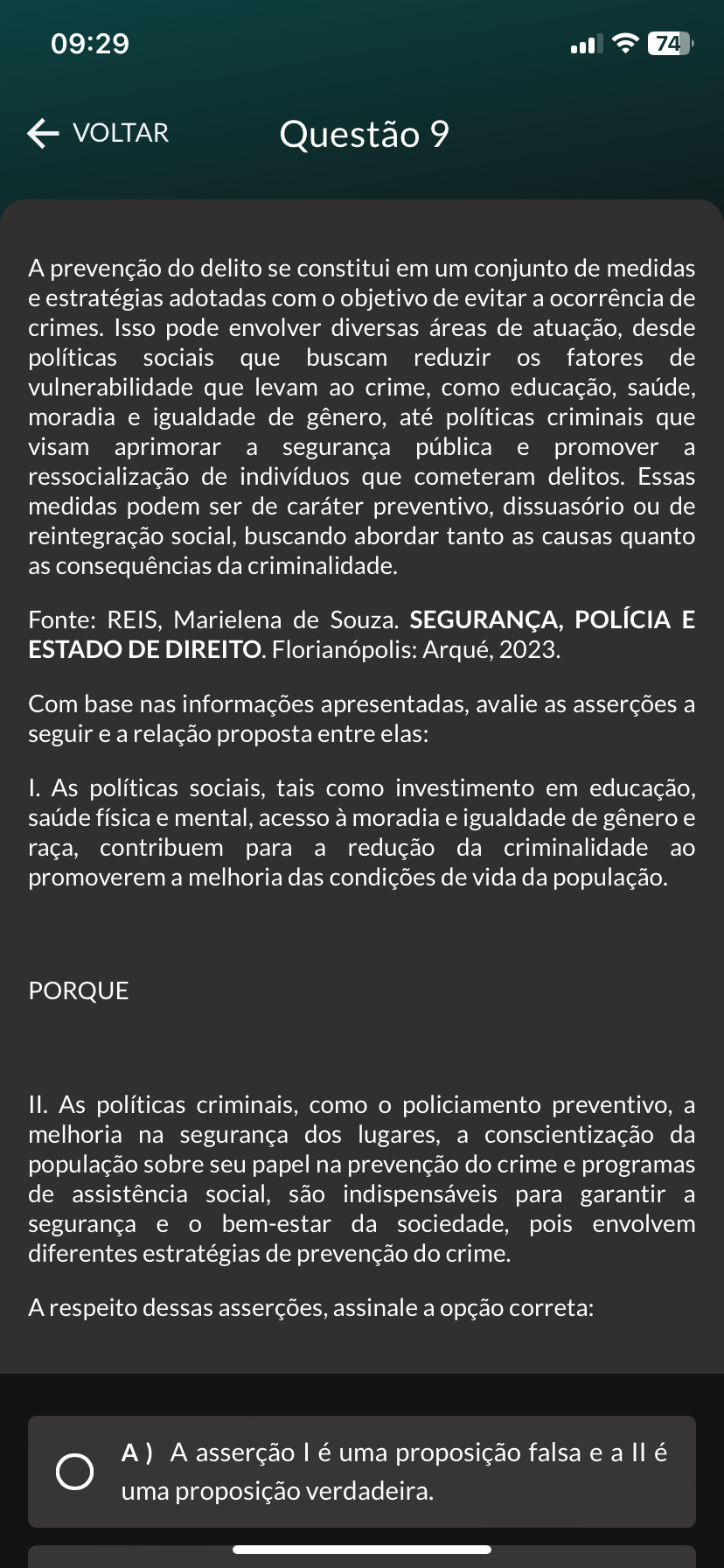 <p>09:29 74 VOLTAR Questão 9 A prevenção do delito se constitui em um conjunto de medidas e estratégias adotadas com objetivo de evitar a ocorrência de crimes. Isso pode envolver diversas áreas de atuação, desde políticas sociais que buscam reduzir os fatores de vulnerabilidade que levam ao crime, como educação, saúde, moradia e igualdade de gênero, até políticas criminais que visam aprimorar a segurança pública e promover a ressocialização de indivíduos que cometeram delitos. Essas medidas podem ser de caráter preventivo, dissuasório ou de reintegração social, buscando abordar tanto as causas quanto as consequências da criminalidade. Fonte: REIS, Marielena de Souza. SEGURANÇA, POLÍCIA E ESTADO DE DIREITO. Florianópolis: Arqué, 2023. Com base nas informações apresentadas, avalie as asserções a seguir e a relação proposta entre elas: I. As políticas sociais, tais como investimento em educação, saúde física e mental, acesso à moradia e igualdade de gênero e raça, contribuem para a redução da criminalidade ao promoverem a melhoria das condições de vida da população. PORQUE II. As políticas criminais, como O policiamento preventivo, a melhoria na segurança dos lugares, a conscientização da população sobre seu papel na prevenção do crime e programas de assistência social, são indispensáveis para garantir a segurança e bem-estar da sociedade, pois envolvem diferentes estratégias de prevenção do crime. A respeito dessas asserções, assinale a opção correta: A) A asserção é uma proposição falsa e a II é uma proposição verdadeira.</p>