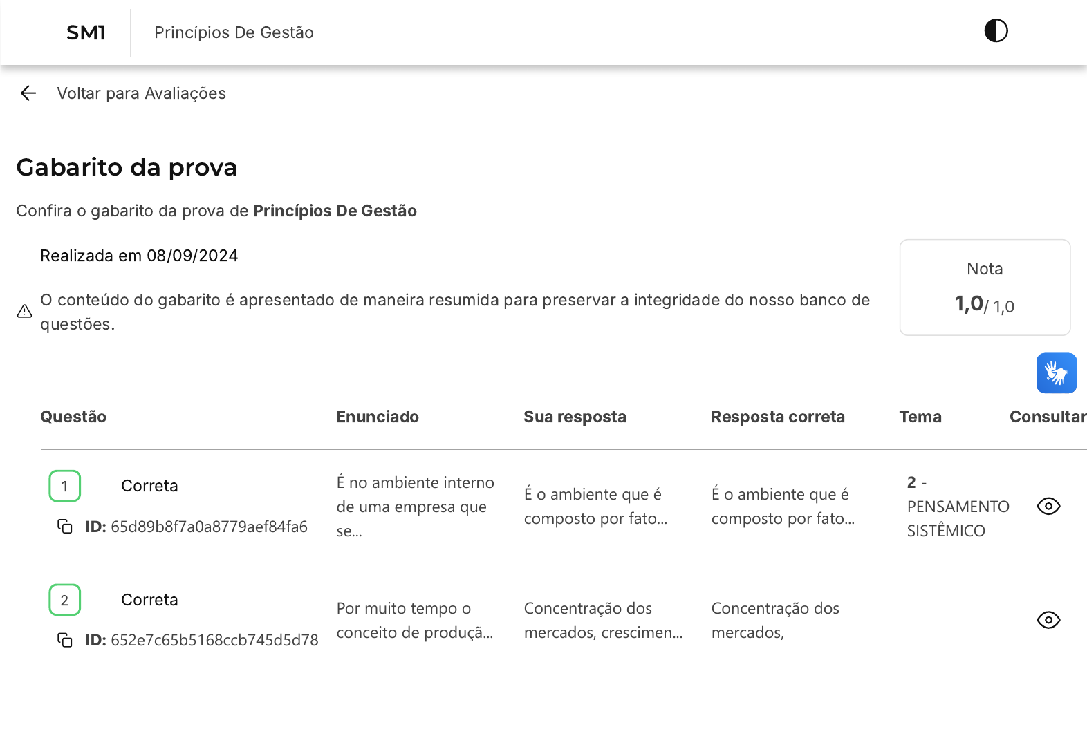 <p>08/09/24, 14:07 estacio.saladeavaliacoes.com.br/prova/66ddb83bece86d79419803f6/gabarito/</p><p>https://estacio.saladeavaliacoes.com.br/prova/66ddb83bece86d79419803f6/gabarito/ 1/3</p><p>Voltar para Avaliações</p><p>Gabarito da prova</p><p>Confira o gabarito da prova de Princípios De Gestão</p><p>Realizada em 08/09/2024</p><p>O conteúdo do gabarito é apresentado de maneira resumida para preservar a integridade do nosso banco de</p><p>questões.</p><p>Nota</p><p>1,0/ 1,0</p><p>Questão Enunciado Sua resposta Resposta correta Tema Consultar</p><p>Correta</p><p>ID: 65d89b8f7a0a8779aef84fa6</p><p>É no ambiente interno</p><p>de uma empresa que</p><p>se...</p><p>É o ambiente que é</p><p>composto por fato...</p><p>É o ambiente que é</p><p>composto por fato...</p><p>2 -</p><p>PENSAMENTO</p><p>SISTÊMICO</p><p>Correta</p><p>ID: 652e7c65b5168ccb745d5d78</p><p>Por muito tempo o</p><p>conceito de produçã...</p><p>Concentração dos</p><p>mercados, crescimen...</p><p>Concentração dos</p><p>mercados, crescimen...</p><p>2 -</p><p>PENSAMENTO</p><p>SISTÊMICO</p><p>1</p><p>2</p><p>SM1 Princípios De Gestão</p><p>https://estacio.saladeavaliacoes.com.br/avaliacoes/</p><p>08/09/24, 14:07 estacio.saladeavaliacoes.com.br/prova/66ddb83bece86d79419803f6/gabarito/</p><p>https://estacio.saladeavaliacoes.com.br/prova/66ddb83bece86d79419803f6/gabarito/ 2/3</p><p>Correta</p><p>ID: 652e6eedd2cc53390d80f0fa</p><p>Fernando reconhece as</p><p>limitações do modelo</p><p>de gest...</p><p>Apenas os itens I e II. Apenas os itens I e II.</p><p>2 -</p><p>PENSAMENTO</p><p>SISTÊMICO</p><p>Correta</p><p>ID: 65e75c2cec7d9144d04ee6c1</p><p>Marcos é um estudante</p><p>de engenharia que fre...</p><p>Buscar apoio</p><p>psicológico na</p><p>universidade pa...</p><p>Buscar apoio</p><p>psicológico na</p><p>universidade pa...</p><p>3 - O</p><p>COTIDIANO</p><p>DO GESTOR</p><p>Correta</p><p>ID: 65e76060ec7d9144d04f14d4</p><p>Pedro é um jovem</p><p>estudante do curso de</p><p>log&...</p><p>Participar de</p><p>workshops, cursos e</p><p>eventos de netwo...</p><p>Participar de</p><p>workshops, cursos e</p><p>eventos de netwo...</p><p>3 - O</p><p>COTIDIANO</p><p>DO GESTOR</p><p>Correta</p><p>ID: 652e6eedd2cc53390d80f10c</p><p>Defensor do</p><p>planejamento, Pedro</p><p>Paulo, um dos gest...</p><p>I, II e III, apenas. I, II e III, apenas.</p><p>3 - O</p><p>COTIDIANO</p><p>DO GESTOR</p><p>Correta</p><p>ID: 65d89b8f7a0a8779aef84f9a</p><p>Hard skills e soft skills</p><p>são duas categori...</p><p>Hard skills são</p><p>habilidades técnicas...</p><p>Hard skills são</p><p>habilidades técnicas...</p><p>2 -</p><p>PENSAMENTO</p><p>SISTÊMICO</p><p>Correta</p><p>ID: 652e6eedd2cc53390d80f100</p><p>João Ribeiro é diretor</p><p>de uma empresa de</p><p>médio por...</p><p>variáveis político-legais. variáveis político-legais.</p><p>2 -</p><p>PENSAMENTO</p><p>SISTÊMICO</p><p>3</p><p>4</p><p>5</p><p>6</p><p>7</p><p>8</p><p>08/09/24, 14:07 estacio.saladeavaliacoes.com.br/prova/66ddb83bece86d79419803f6/gabarito/</p><p>https://estacio.saladeavaliacoes.com.br/prova/66ddb83bece86d79419803f6/gabarito/ 3/3</p><p>Correta</p><p>ID: 652e6eedd2cc53390d80f20e</p><p>Em modelos</p><p>organizacionais</p><p>contemporâneos,</p><p>privile...</p><p>o fluxo da informação e</p><p>do conhecimento como</p><p>eleme...</p><p>o fluxo da informação e</p><p>do conhecimento como</p><p>eleme...</p><p>3 - O</p><p>COTIDIANO</p><p>DO GESTOR</p><p>Correta</p><p>ID: 65e7590eec7d9144d04ed5d1</p><p>Carlos é um jovem</p><p>ambicioso que sonha</p><p>em se...</p><p>Engajar-se em</p><p>programas de mentoria</p><p>para jovens em...</p><p>Engajar-se em</p><p>programas de mentoria</p><p>para jovens em...</p><p>3 - O</p><p>COTIDIANO</p><p>DO GESTOR</p><p>9</p><p>10</p><p>Encontrou algum problema?</p><p>Você pode copiar o ID da questão, acessar o Campus Virtual �SIA) e abrir um requerimento.</p>