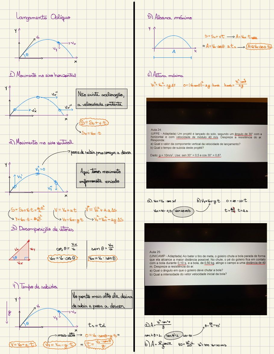 <p>S</p><p>- ObliguoLancamento 5) Alcance máximo</p><p>S >VX</p><p>· AVocstatsco te</p><p>I A X</p><p>3 ↑ ↑</p><p>2) Movimento no eixo horizontal 6) Altura máxima</p><p>Vo? sent</p><p>Y1 VVo2gAY o = Vorent/22g . hmai hmax= 2g</p><p>-</p><p>S</p><p>V Não existe aceleração</p><p>-</p><p>-</p><p>> a velocidade constante</p><p>VI</p><p>O v O 2</p><p>-</p><p>X</p><p>-</p><p>"w</p><p>mSotv .t</p><p>3(</p><p>↑</p><p>Y</p><p>↑ S = SotutcAVox.trotal</p><p>> Sx= Vox t</p><p>2) Movimento no eixo vertical</p><p>-parade subirpracomeçar a descer</p><p># Aquitemos movimento</p><p>uniformemente variado</p><p>2</p><p>X</p><p>a) Voy =Vo sen 30" 6) VVou-gt 0 = 20-20 ·t</p><p>1</p><p>a.t2</p><p>3= SotVot+ 2 V = Votat VVot2aAs Voy = 40-0</p><p>,</p><p>5 Vov= 20 m/s t= t= 21</p><p>> Y = Voy ·t-9th > V =Vor-gt >VIVor-ag</p><p>. 15</p><p>3) Decomposição de vetores</p><p>A</p><p>Vo VoY Vo</p><p>Vox mant⑦</p><p>4)Tempo de subida</p><p>Y1</p><p>No ponto mais alto ele deixa</p><p>Vo de subir e passa a descer</p><p>~</p><p>g</p><p>10</p><p>>VX</p><p>a</p><p>Vosenzo</p><p>3 to = td CA =</p><p>g 0=ygo</p><p>X</p><p>c mais alto > 0 = Vo . sent-g.t= se20 = 1 sendó1 20 = 90</p><p>t=</p><p>Vo : sent</p><p>at mVov-gt =E b) A Valente 40 400 vocog</p>