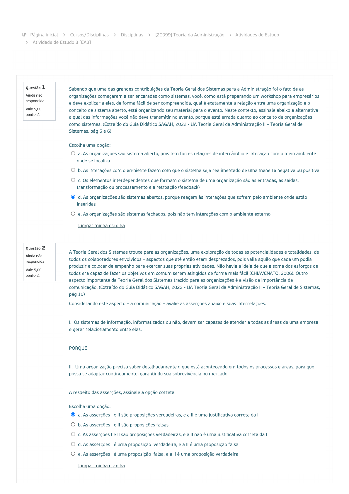 <p>Página inicial Cursos/Disciplinas > Disciplinas > [20999] Teoria da Administração > Atividades de Estudo Atividade de Estudo 3 [EA3] Questão 1 Sabendo que uma das grandes contribuições da Teoria Geral dos Sistemas para a Administração foi o fato de as Ainda não organizações começarem a ser encaradas como sistemas, você, como está preparando um workshop para empresários respondida e deve explicar a eles, de forma fácil de ser compreendida, qual é exatamente a relação entre uma organização e o Vale 5,00 conceito de sistema aberto, está organizando seu material para o evento. Neste contexto, assinale abaixo a alternativa ponto(s). a qual das informações você não deve transmitir no evento, porque está errada quanto ao conceito de organizações como sistemas. (Extraído do Guia Didático SAGAH, 2022 UA Teoria Geral da Administração Teoria Geral de Sistemas, pág 5 e 6) Escolha uma opção: a. As organizações são sistema aberto, pois tem fortes relações de intercâmbio e interação com o meio ambiente onde se localiza b. As interações com o ambiente fazem com que o sistema seja realimentado de uma maneira negativa ou positiva C. Os elementos interdependentes que formam o sistema de uma organização são as entradas, as saídas, transformação ou processamento e a retroação (feedback) d. As organizações são sistemas abertos, porque reagem às interações que sofrem pelo ambiente onde estão inseridas e. As organizações são sistemas fechados, pois não tem interações com o ambiente externo Limpar minha escolha Questão 2 A Teoria Geral dos Sistemas trouxe para as organizações, uma exploração de todas as potencialidades e totalidades, de Ainda não respondida todos os colaboradores envolvidos aspectos que até então eram desprezados, pois valia aquilo que cada um podia produzir e colocar de empenho para exercer suas próprias atividades. Não havia a ideia de que a soma dos esforços de Vale 5,00 ponto(s). todos era capaz de fazer os objetivos em comum serem atingidos de forma mais fácil (CHIAVENATO, 2006). Outro aspecto importante da Teoria Geral dos Sistemas trazido para as organizações é a visão da importância da comunicação. (Extraído do Guia Didático SAGAH, 2022 UA Teoria Geral da Administração II Teoria Geral de Sistemas, pág 10) Considerando este aspecto a comunicação avalie as asserções abaixo e suas interrelações. I. Os sistemas de informação, informatizados ou não, devem ser capazes de atender a todas as áreas de uma empresa e gerar relacionamento entre elas. PORQUE II. Uma organização precisa saber detalhadamente o que está acontecendo em todos os processos e áreas, para que possa se adaptar continuamente, garantindo sua sobrevivência no mercado. A respeito das asserções, assinale a opção correta. Escolha uma opção: a. As asserções e são proposições verdadeiras, e a é uma justificativa correta da b. As asserções I e II são proposições falsas As asserções e II são proposições verdadeiras, e a não é uma justificativa correta da d. As asserções é uma proposição verdadeira, e a é uma proposição falsa e. As asserções é uma proposição falsa, e a é uma proposição verdadeira Limpar minha escolha</p><p>Questão 3 A abordagem contingencial considera as influências ambientais determinantes para o desenvolvimento das atividades Ainda não na organização. No que se refere à complexidade, a abordagem contingencial não apresenta uma única forma de se respondida compreender a realidade. Em decorrência deste campo de visão, o tratamento das questões administrativas no Vale 5,00 ponto(s). contexto de "cada caso é um caso", pois a escola contingencial considera que nada é absoluto nas organizações. Tudo é relativo e depende das realidades do ambiente organizacional e do resultado das negociações realizadas pelas pessoas que têm poder de decisão nas organizações. Neste sentido, a partir da teoria da contingência, é possível identificar cinco instrumentos administrativos de grande influência no gerenciamento das organizações. (Extraído do Guia Didático SAGAH, 2022 - UA Teorias da Administração - Teoria Contingencial, pág. 3). Assim, são instrumentos de gerenciamento da abordagem contingencial, EXCETO: Escolha uma opção: a. A análise externa da organização b. processo ou ciclo administrativo C. Os cenários estratégicos d. Os modelos organizacionais e. o planejamento estratégico Limpar minha escolha Questão 4 De acordo com a teoria da contingência, não há uma única maneira de organizar e estruturar as organizações. Ainda não Enquanto a tecnologia impõe desafios internos à organização, o ambiente impõe desafios externos. Diante desses respondida desafios, é possível identificar três níveis organizacionais nas empresas. Abaixo relacione os níveis organizacionais às Vale 5,00 suas correspondências. (Extraído do Guia Didático SAGAH, 2022 UA Teorias da Administração - Teoria Contingencial, ponto(s). pág. 6). a. Nível institucional ou estratégico. b. Nível intermediário. C. Nível operacional. É responsável pela escolha e pela captação dos recursos necessários, bem como pela distribuição e pela colocação do que foi produzido pela empresa nos diversos segmentos do mercado. É o nível em que as decisões são tomadas e em que os objetivos da organização são estabelecidos, bem como as estratégias para ( ) É o nível em que as tarefas são executadas e em que as operações são realizadas, envolve trabalho básico relacionado diretamente com os produtos ou serviços da organização. A ordem correspondente CORRETA é: Escolha uma opção: a. a, b, C b. C, a, b C. b, C, a d. b, a, C e. a, C, b Limpar minha escolha</p><p>Questão 5 Como já se sabe, o ambiente externo influencia no gerenciamento da organização. Ele poderá agir tanto de forma Ainda não respondida positiva quanto negativa em relação às ativ
