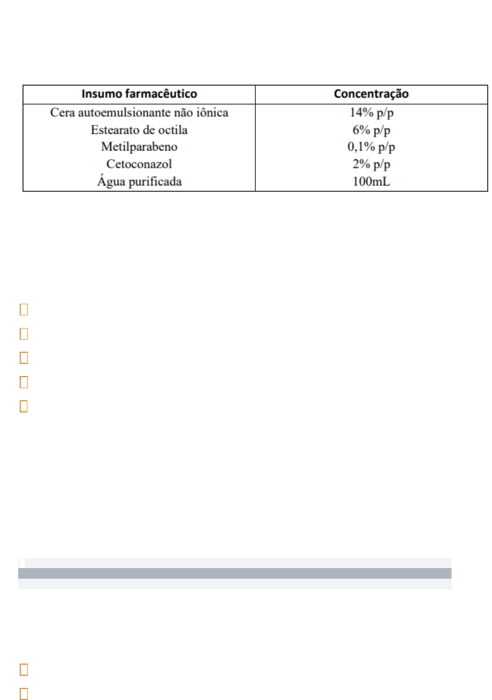 <p>Um farmacêutico magistral recebeu uma prescrição solicitando o produto a seguir:</p><p>Qual a quantidade de conservante a ser utilizada para o preparo de 300g da formulação?</p><p>Alternativas</p><p>A</p><p>42g</p><p>B</p><p>18g</p><p>C</p><p>0,3g</p><p>D</p><p>6g</p><p>E</p><p>0,03g</p><p>Responder</p><p> Gabarito Comentado (0)</p><p> Aulas</p><p> Comentários (0)</p><p> Estatísticas</p><p> Cadernos</p><p> Criar anotações</p><p> Notificar Erro</p><p>2</p><p>Q2903688</p><p>FarmáciaCálculos Farmacêuticos</p><p>Ano: 2010 Banca: CEPERJ Órgão: SESDEC-RJ Prova: CEPERJ - 2010 - SESDEC-RJ - Técnico de</p><p>Farmácia</p><p>Para se preparar 500mL de uma solução de bicarbonato de sódio a 3% , a quantidade de</p><p>NaHCO3, que deve ser pesada é:</p><p>Alternativas</p><p>A</p><p>15 g</p><p>B</p><p>https://www.qconcursos.com/questoes-de-concursos/disciplinas/farmacia-farmacia/calculos-farmaceuticos/questoes?msockid=0464772aee0f69c70cb663c1ef5468ab#question-belt-3010000-teacher-tab</p><p>https://www.qconcursos.com/questoes-de-concursos/disciplinas/farmacia-farmacia/calculos-farmaceuticos/questoes?msockid=0464772aee0f69c70cb663c1ef5468ab#question-belt-3010000-lessons-tab</p><p>https://www.qconcursos.com/questoes-de-concursos/disciplinas/farmacia-farmacia/calculos-farmaceuticos/questoes?msockid=0464772aee0f69c70cb663c1ef5468ab#question-belt-3010000-comments-tab</p><p>https://www.qconcursos.com/questoes-de-concursos/disciplinas/farmacia-farmacia/calculos-farmaceuticos/questoes?msockid=0464772aee0f69c70cb663c1ef5468ab#question-belt-3010000-statistics-tab</p><p>https://www.qconcursos.com/questoes-de-concursos/disciplinas/farmacia-farmacia/calculos-farmaceuticos/questoes?msockid=0464772aee0f69c70cb663c1ef5468ab#question-belt-3010000-notebooks-tab</p><p>https://www.qconcursos.com/questoes-de-concursos/disciplinas/farmacia-farmacia/calculos-farmaceuticos/questoes?msockid=0464772aee0f69c70cb663c1ef5468ab#question-belt-3010000-notes-tab</p><p>https://www.qconcursos.com/questoes-de-concursos/disciplinas/farmacia-farmacia/calculos-farmaceuticos/questoes?msockid=0464772aee0f69c70cb663c1ef5468ab#question-belt-3010000-notify-tab</p><p>https://www.qconcursos.com/questoes-de-concursos/questoes/bb53e13acd9</p><p>https://www.qconcursos.com/questoes-de-concursos/disciplinas/farmacia-farmacia</p><p>https://www.qconcursos.com/questoes-de-concursos/disciplinas/farmacia-farmacia/calculos-farmaceuticos</p><p>https://www.qconcursos.com/questoes-de-concursos/bancas/ceperj</p><p>https://www.qconcursos.com/questoes-de-concursos/institutos/sesdec-rj</p><p>https://www.qconcursos.com/questoes-de-concursos/provas/ceperj-2010-sesdec-rj-tecnico-de-farmacia</p><p>https://www.qconcursos.com/questoes-de-concursos/provas/ceperj-2010-sesdec-rj-tecnico-de-farmacia</p><p>150 g</p><p>C</p><p>4,5 g</p><p>D</p><p>25 g</p><p>E</p><p>1,5 g</p><p>Responder</p><p> Gabarito Comentado (0)</p><p> Aulas</p><p> Comentários (0)</p><p> Estatísticas</p><p> Cadernos</p><p> Criar anotações</p><p> Notificar Erro</p><p>3</p><p>Q2903671</p><p>FarmáciaCálculos Farmacêuticos</p><p>Ano: 2010 Banca: CEPERJ Órgão: SESDEC-RJ Prova: CEPERJ - 2010 - SESDEC-RJ - Técnico de</p><p>Farmácia</p><p>o conhecimento das diversas unidades de medidas é importante para a realização de</p><p>diferentes práticas diárias em um Serviço de Farmácia. Associe as unidades de medida de</p><p>massa e volume, apresentadas na coluna à esquerda, com seus equivalentes, listados na</p><p>Coluna à direita:</p><p>1- 1Kg</p><p>2- 1g</p><p>3- 1mg</p><p>4- 1L</p><p>5- 1mL</p><p>( ) 0,001g</p><p>( ) 1000mL</p><p>( ) 0,001L</p><p>( ) 1000mg</p><p>( ) 1000h</p><p>A sequência correta é:</p><p>https://www.qconcursos.com/questoes-de-concursos/disciplinas/farmacia-farmacia/calculos-farmaceuticos/questoes?msockid=0464772aee0f69c70cb663c1ef5468ab#question-belt-2903688-teacher-tab</p><p>https://www.qconcursos.com/questoes-de-concursos/disciplinas/farmacia-farmacia/calculos-farmaceuticos/questoes?msockid=0464772aee0f69c70cb663c1ef5468ab#question-belt-2903688-lessons-tab</p><p>https://www.qconcursos.com/questoes-de-concursos/disciplinas/farmacia-farmacia/calculos-farmaceuticos/questoes?msockid=0464772aee0f69c70cb663c1ef5468ab#question-belt-2903688-comments-tab</p><p>https://www.qconcursos.com/questoes-de-concursos/disciplinas/farmacia-farmacia/calculos-farmaceuticos/questoes?msockid=0464772aee0f69c70cb663c1ef5468ab#question-belt-2903688-statistics-tab</p><p>https://www.qconcursos.com/questoes-de-concursos/disciplinas/farmacia-farmacia/calculos-farmaceuticos/questoes?msockid=0464772aee0f69c70cb663c1ef5468ab#question-belt-2903688-notebooks-tab</p><p>https://www.qconcursos.com/questoes-de-concursos/disciplinas/farmacia-farmacia/calculos-farmaceuticos/questoes?msockid=0464772aee0f69c70cb663c1ef5468ab#question-belt-2903688-notes-tab</p><p>https://www.qconcursos.com/questoes-de-concursos/disciplinas/farmacia-farmacia/calculos-farmaceuticos/questoes?msockid=0464772aee0f69c70cb663c1ef5468ab#question-belt-2903688-notify-tab</p><p>https://www.qconcursos.com/questoes-de-concursos/questoes/6cd401cf738</p><p>https://www.qconcursos.com/questoes-de-concursos/disciplinas/farmacia-farmacia</p><p>https://www.qconcursos.com/questoes-de-concursos/disciplinas/farmacia-farmacia/calculos-farmaceuticos</p><p>https://www.qconcursos.com/questoes-de-concursos/bancas/ceperj</p><p>https://www.qconcursos.com/questoes-de-concursos/institutos/sesdec-rj</p><p>https://www.qconcursos.com/questoes-de-concursos/provas/ceperj-2010-sesdec-rj-tecnico-de-farmacia</p><p>https://www.qconcursos.com/questoes-de-concursos/provas/ceperj-2010-sesdec-rj-tecnico-de-farmacia</p><p>Alternativas</p><p>A</p><p>3 - 4 - 5 - 2 - 1</p><p>B</p><p>2 - 3 - 1 - 4 - 5</p><p>C</p><p>1 - 2 - 3 - 4 - 5</p><p>D</p><p>5 - 3 - 2 - 1 - 4</p><p>E</p><p>4 - 2 - 1 - 3 - 5</p><p>Responder</p><p> Gabarito Comentado (0)</p><p> Aulas</p><p> Comentários (0)</p><p> Estatísticas</p><p> Cadernos</p><p> Criar anotações</p><p> Notificar Erro</p><p
