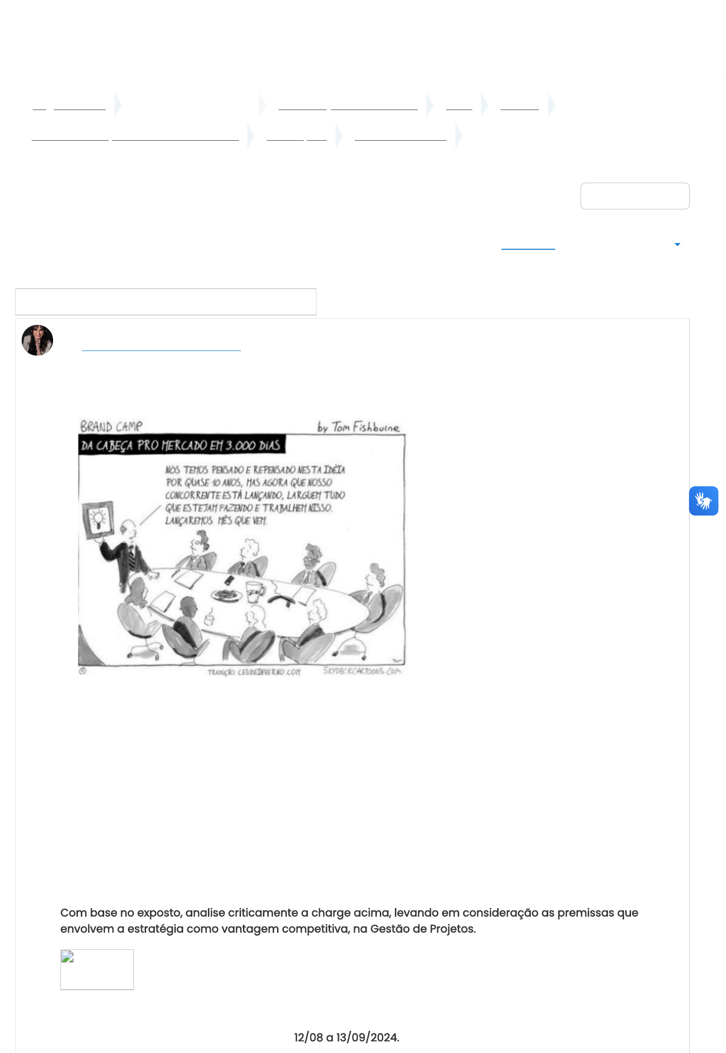 <p>...</p><p>Gestão De Projetos - 2024_03_EAD_A</p><p>Página inicial Disciplinas e Espaços GRADUAÇÃO A DISTÂNCIA 2024 2024-3</p><p>Gestão De Projetos - 2024_03_EAD_A Avaliações Fórum avaliativo</p><p>Gerenciamento de Projetos ou Gerenciamento de Falhas ?</p><p>Fórum avaliativo</p><p>Gerenciamento de Projetos ou Gerenciamento de Falhas ?</p><p> Assinante</p><p>Mostrar respostas começando pela mais recente</p><p> Configurações</p><p>A abordagem por projetos, há muito, é o estilo de fazer negócios no setor da construção, nas licitações,</p><p>entre outros campos. O gerenciamento de projetos tem se disseminado em diferentes setores. Equipes de</p><p>projeto executam de tudo, de expansões portuárias a reestruturação de hospitais e upgrade de sistemas</p><p>de informação. Criam veículos de ponta eficientes em consumo de combustível, desenvolvem fontes</p><p>sustentáveis de energia e exploram os confins do espaço sideral.</p><p>Quando nos referimos a Gestão de Projetos, devemos levar em consideração uma série de variáveis para</p><p>a efetiva implementação e reestruturação de todas as etapas, adaptando técnicas especiais de</p><p>gerenciamento, com o objetivo de atingir um melhor controle dos recursos existentes.</p><p>Com base no exposto, analise criticamente a charge acima, levando em consideração as premissas que</p><p>envolvem a estratégia como vantagem competitiva, na Gestão de Projetos.</p><p>Dica 1: Consulte o material da Unidade 01 sobre Gerenciamento de Projetos.</p><p>Dica 2: Este Fórum deve ser respondido de 12/08 a 13/09/2024.</p><p>Gerenciamento de Projetos ou Gerenciamento de Falhas ?</p><p>por KARINA NOGUEIRA FERNANDES - terça, 13 ago 2024, 00:10</p><p> Buscar no fórum</p><p>20/08/2024, 20:27 E4159_1: Gerenciamento de Projetos ou Gerenciamento de Falhas ?</p><p>https://ava.candidomendes.edu.br/moodle/mod/forum/discuss.php?d=35145 1/4</p><p>https://ava.candidomendes.edu.br/moodle/</p><p>https://ava.candidomendes.edu.br/moodle/course/index.php?categoryid=8</p><p>https://ava.candidomendes.edu.br/moodle/course/index.php?categoryid=175</p><p>https://ava.candidomendes.edu.br/moodle/course/index.php?categoryid=185</p><p>https://ava.candidomendes.edu.br/moodle/course/view.php?id=14880</p><p>https://ava.candidomendes.edu.br/moodle/course/view.php?id=14880§ion=4</p><p>https://ava.candidomendes.edu.br/moodle/mod/forum/view.php?id=511164</p><p>https://ava.candidomendes.edu.br/moodle/mod/forum/discuss.php?d=35145</p><p>https://ava.candidomendes.edu.br/moodle/mod/forum/subscribe.php?sesskey=UhO4NoDevn&id=37315&d=35145&returnurl=https%3A%2F%2Fava.candidomendes.edu.br%2Fmoodle%2Fmod%2Fforum%2Fdiscuss.php%3Fd%3D35145</p><p>https://ava.candidomendes.edu.br/moodle/mod/forum/subscribe.php?sesskey=UhO4NoDevn&id=37315&d=35145&returnurl=https%3A%2F%2Fava.candidomendes.edu.br%2Fmoodle%2Fmod%2Fforum%2Fdiscuss.php%3Fd%3D35145</p><p>https://ava.candidomendes.edu.br/moodle/user/view.php?id=167</p><p>Pré-requisitos de Correção:</p><p>- Originalidade e Autoria: Não serão aceitos textos plagiados, parcial ou totalmente, tampouco aqueles</p><p>produzidos por inteligência artificial. Ambos os casos implicam a atribuição de nota zero.</p><p>Participem do Fórum Avaliativo e contribua cada vez mais para seus estudos!</p><p>Link direto Responder</p><p>Olá Professor!</p><p>Dito isto. A charge de Tom Fishburne critica a má gestão de projetos, destacando a lentidão e a falta de</p><p>planejamento estratégico. A demora para lançar uma ideia permitiu que um concorrente se adiantasse. A</p><p>pressa repentina para lançar o projeto pode comprometer a qualidade e aumentar os custos. Uma gestão</p><p>de projetos eficaz deve incluir planejamento, organização e execução para evitar esses problemas e</p><p>manter a competitividade.</p><p>Avaliação máxima: - Link direto Mostrar principal Responder</p><p>Re: Gerenciamento de Projetos ou Gerenciamento de Falhas ?</p><p>por ALEXANDRE MAGRO DE ARAUJO - terça, 20 ago 2024, 19:11</p><p>A charge aponta uma má gestão, a partir do princípio que o líder poderia utilizar melhor sua força de</p><p>trabalho (equipe) para distribuir tarefas, com objetivo de prontificar a ideia, o que provavelmente seria</p><p>idealizada antes de completar 10 anos e poderia também se tornar uma ideia inovadora antes de seu</p><p>concorrente, e um agravante que poderá ocorrer dado a falta de gestão, é que a ideia que tinha potencial</p><p>de ser muito boa por conta da falta de tempo, a ideia poderá ser manchada e feita de qualquer jeito.</p><p>Link direto Mostrar principal Responder</p><p>Re: Gerenciamento de Projetos ou Gerenciamento de Falhas ?</p><p>por EMILY DO NASCIMENTO ARAÚJO - terça, 20 ago 2024, 18:58</p><p>Na Charge vemos de uma forma irônica a má gestão de projetos. como vemos por má gestão de tempo e</p><p>divisão de tarefas o projeto se prolongou tanto que perdeu a largada na apresentação de uma</p><p>determinada ideia que foi lançada por um concorrente, por não ter determinado um tempo de o termino</p><p>de projeto foi se prolongando e a equipe foi deixando de lado, agora com a necessidade de ter o</p><p>lançamento para o próximo mês o projeto poderá apresentar falhas por ser feita as pressas, com pouco</p><p>tempo poderá haver custos desnecessários. A falta de estratégia dos gestores acabaram prejudicando o</p><p>projeto de uma equipe e de uma empresa, com uma boa estratégia diminuimos custos, tempo e erros em</p><p>um projeto e aumentamos a eficácia do projeto como um todo.</p><p>Link direto Mostrar principal Responder</p><p>Re: Gerenciamento de Projetos ou Gerenciamento de Falhas ?</p><p>por FILIPPY PERCÍLIO DE SOUZA - segunda, 19 ago 2024, 18:39</p><p>Na charge acima indica uma má gestão da empresa. A mudança repentina de prioridades e o curto prazo</p><p>para o lançamento do projeto indicam uma falta de planejamento estratégico. Embora a competição seja</p><p>um fator importante a 